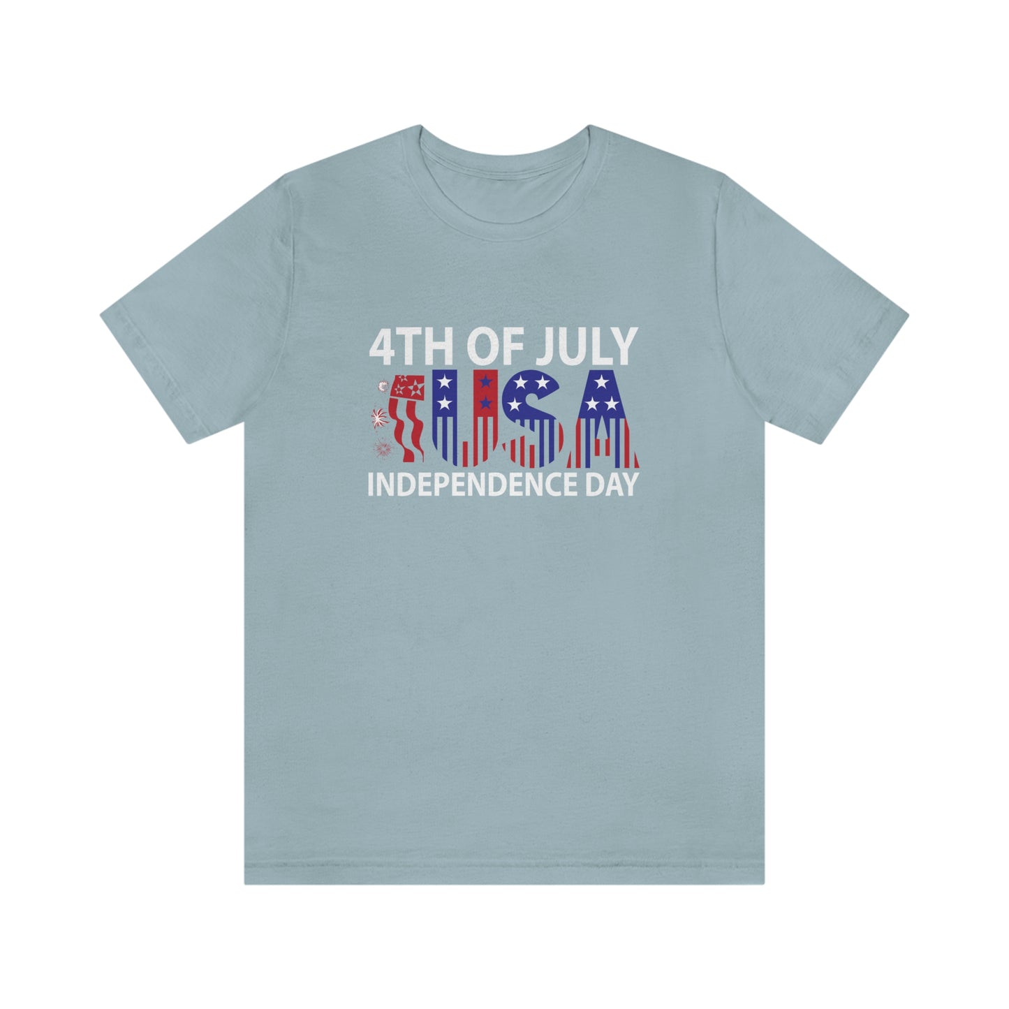 Celebrate Independence Day with this t-shirt showing USA written in red and blue stars and stripes with 4th of July in white above it and Independence Day in white beneath it.
