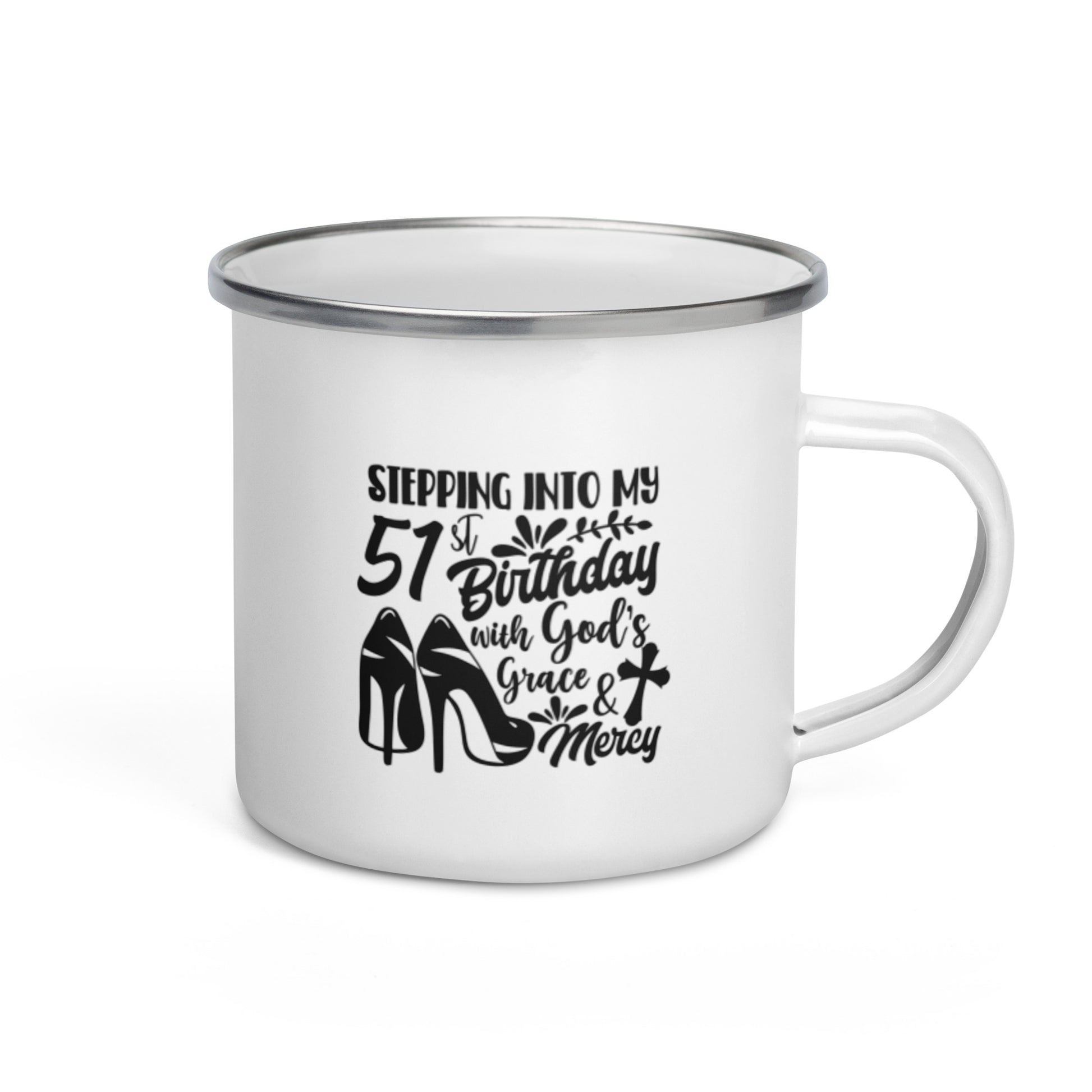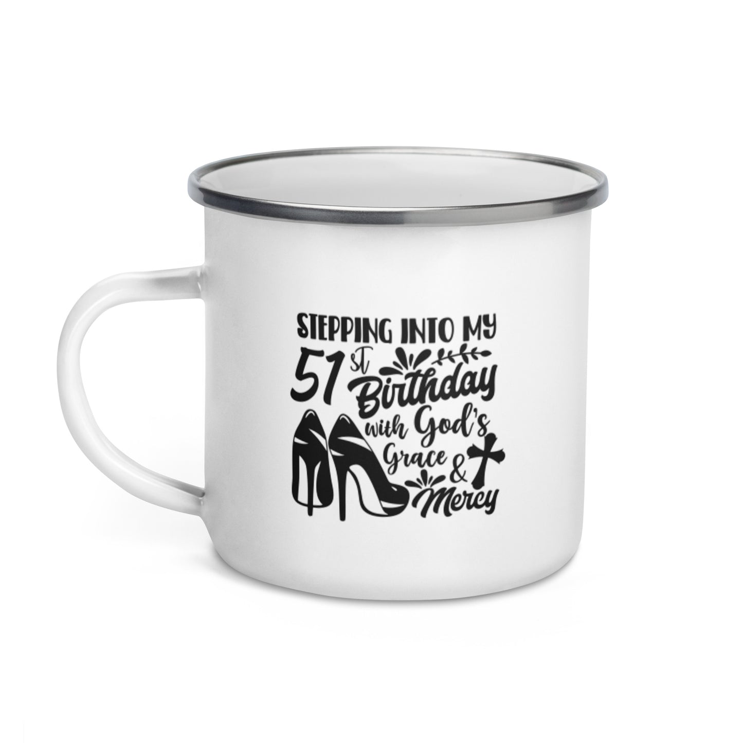This enamel mug makes a perfect gift for the birthday girl showing high heels and the words Stepping Into My 51st Birthday With God's Grace & Mercy.