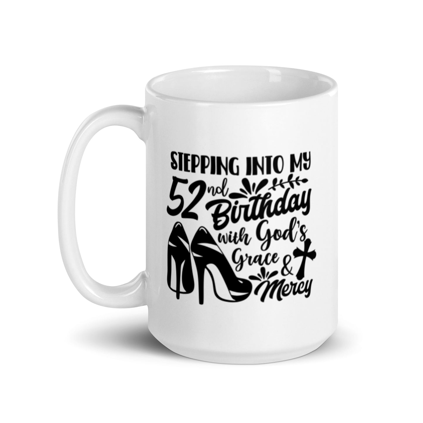 Stepping Into My 52nd Birthday w God's Grace & Mercy White glossy mug