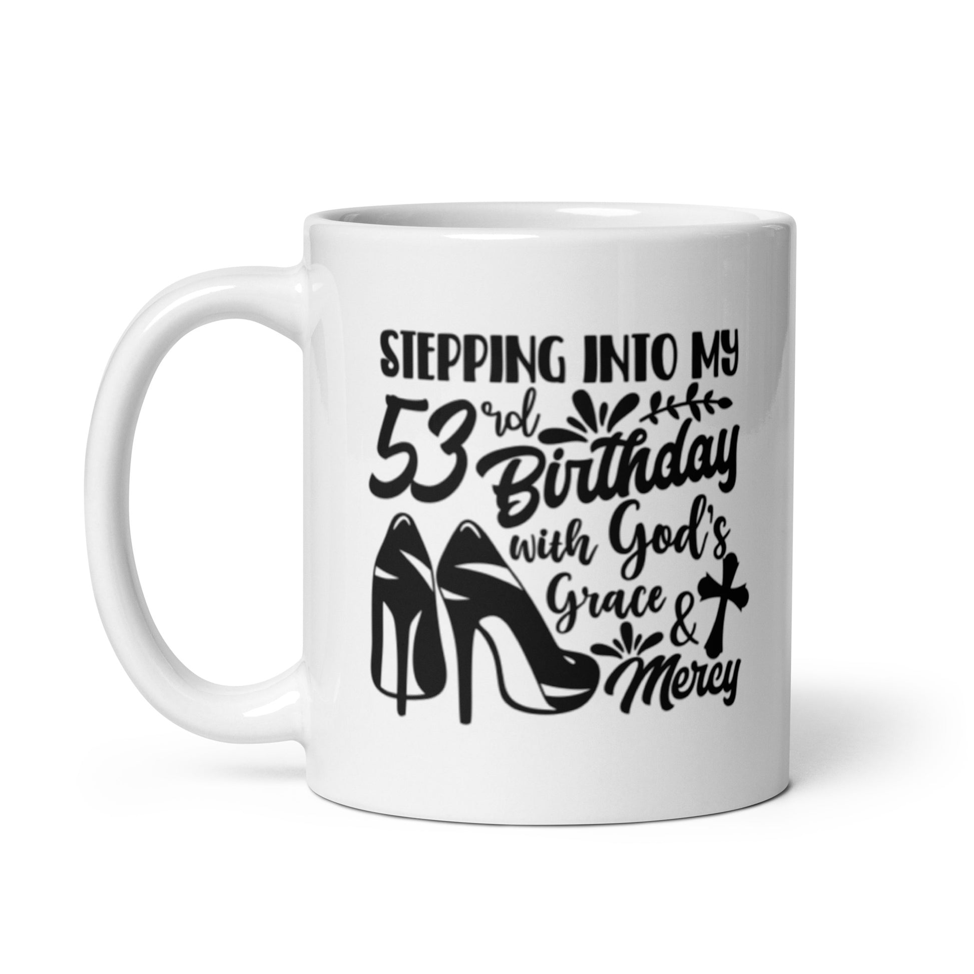Stepping Into My 53rd Birthday w God's Grace & Mercy White glossy mug