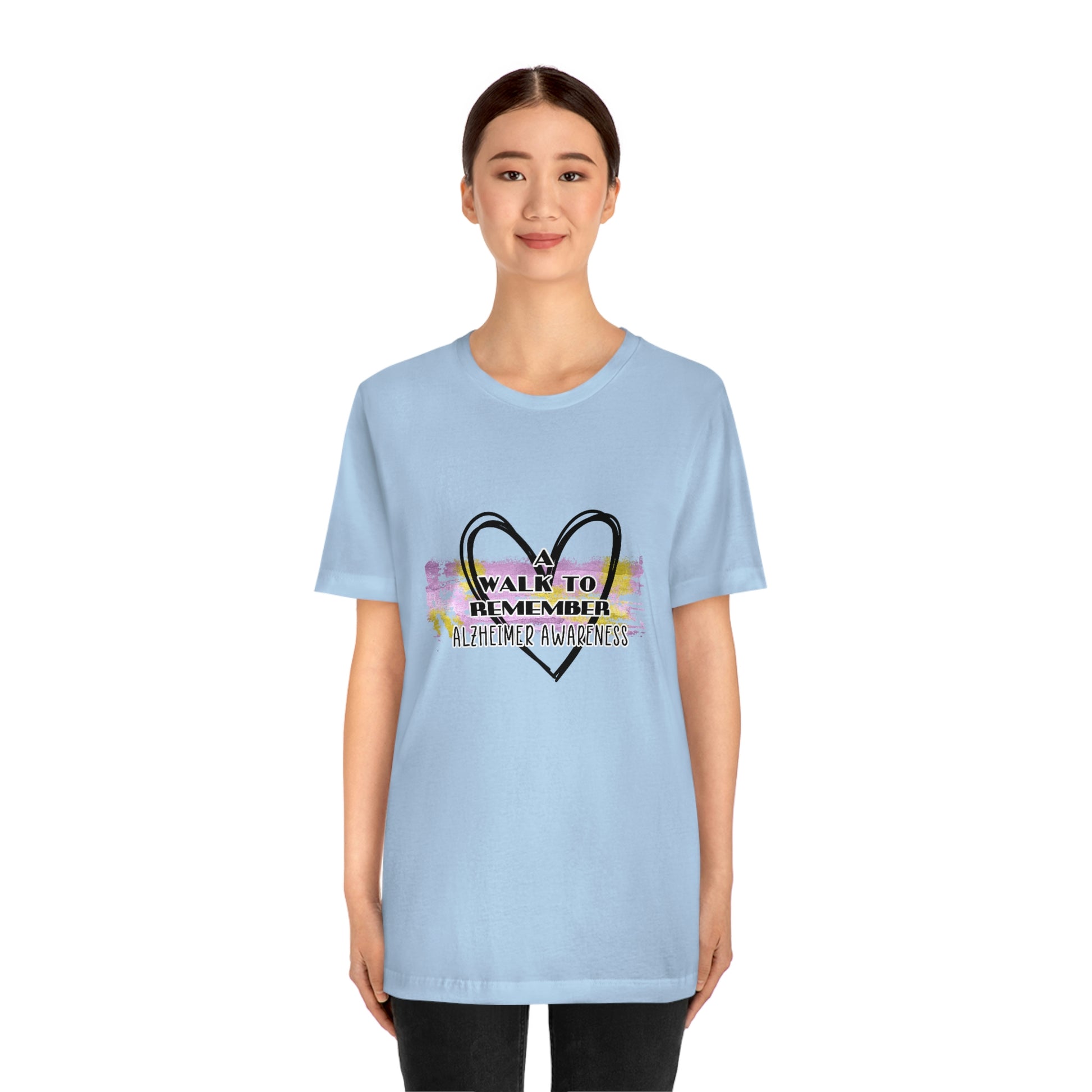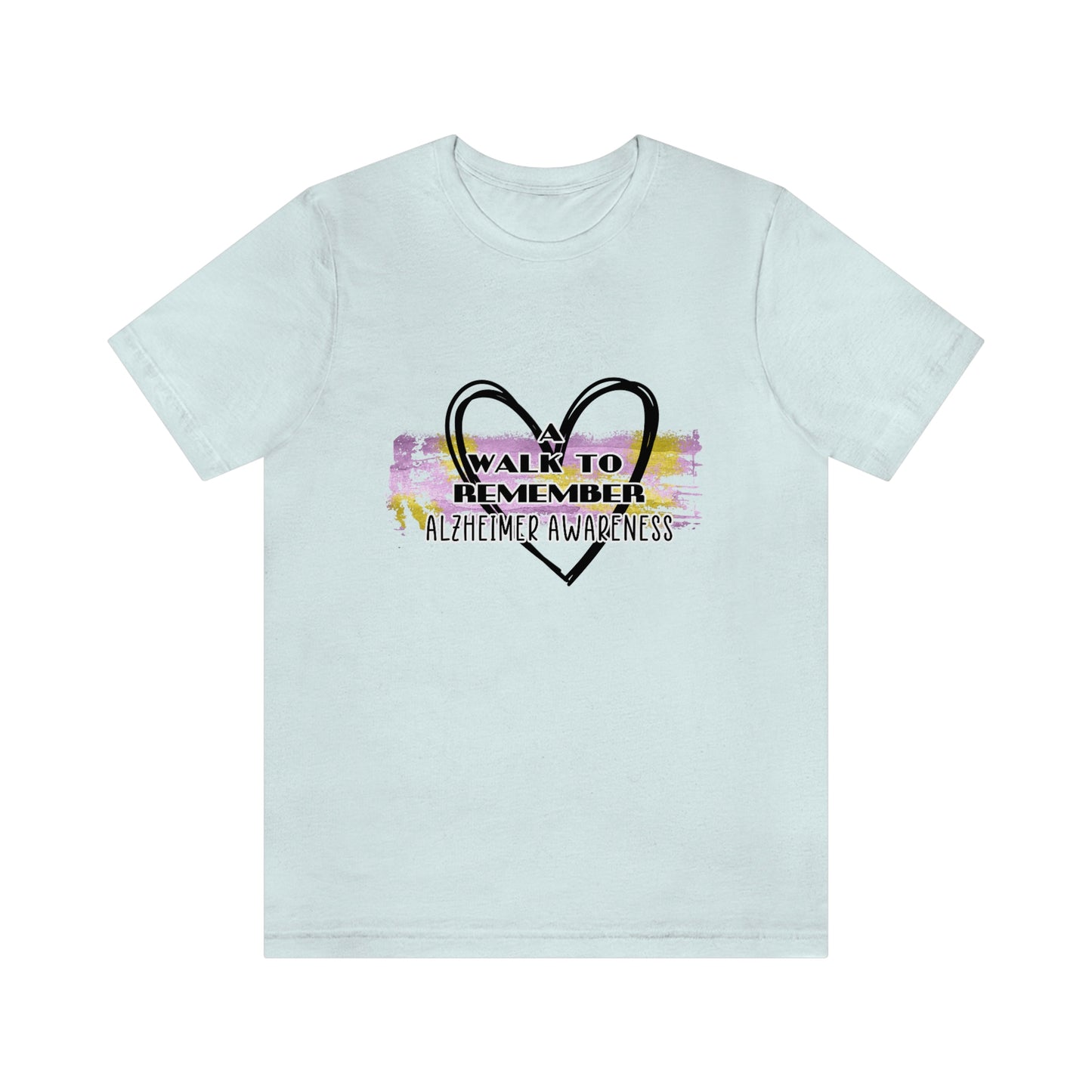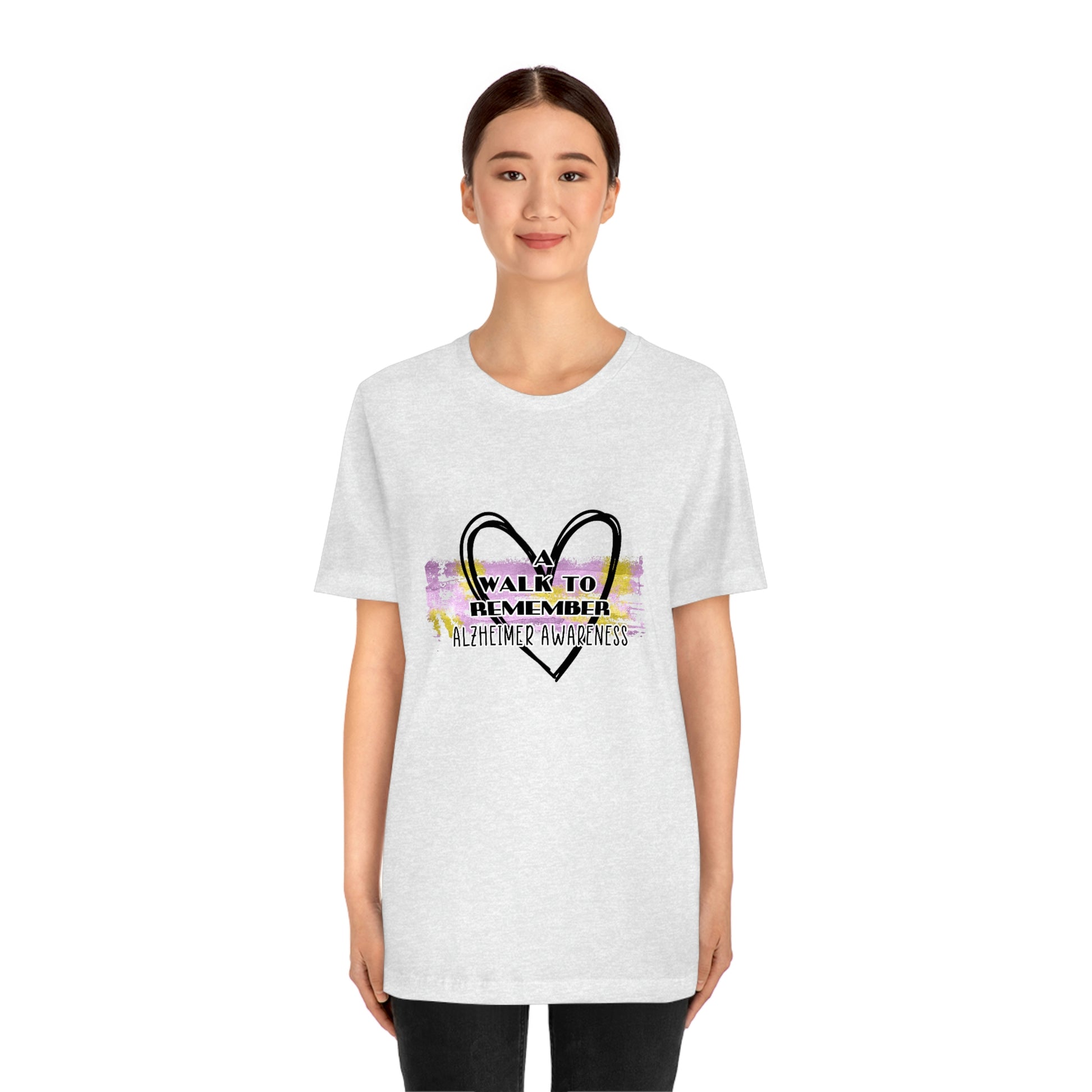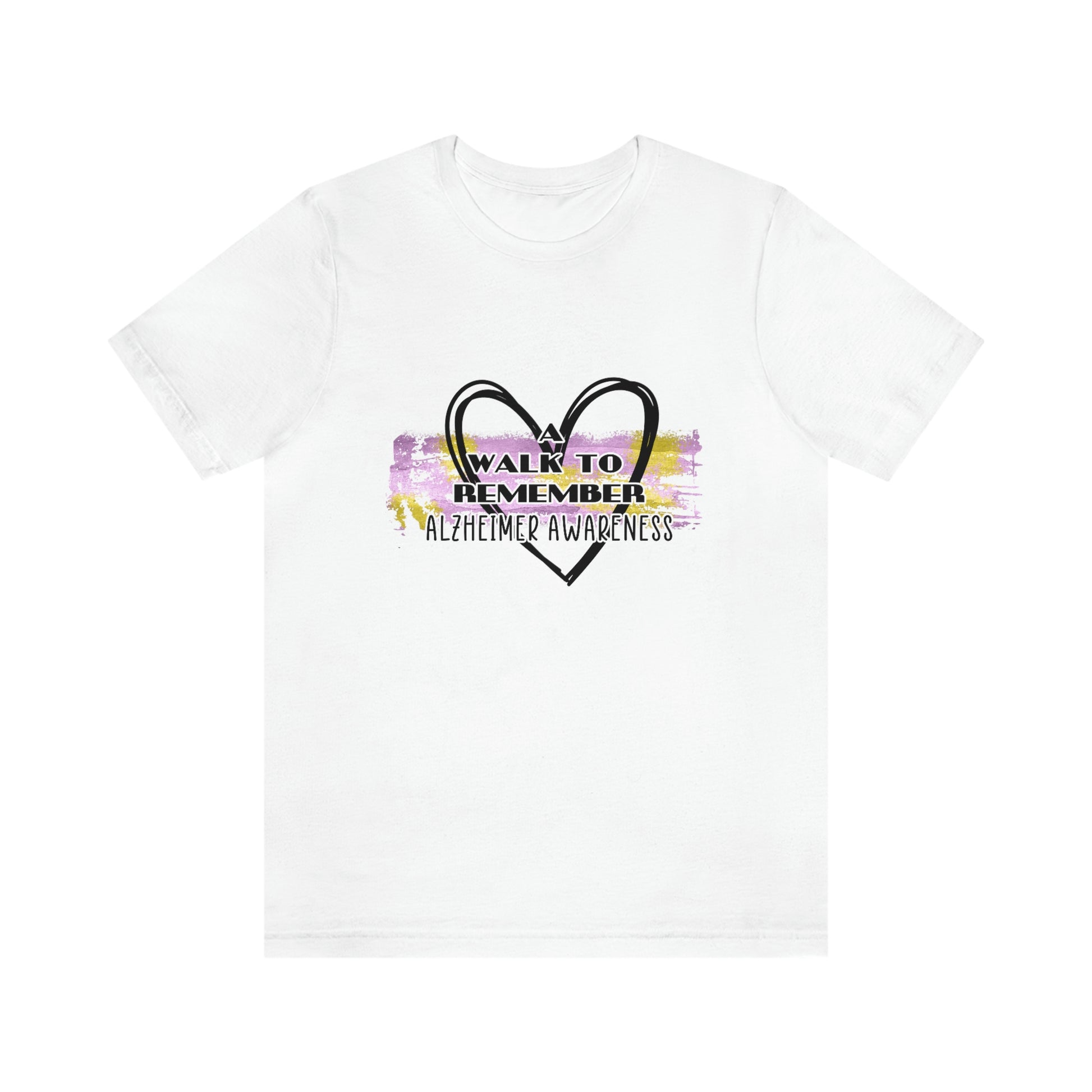 Show your support of Alzheimer awareness with this t-shirt with a heart and the words A Walk to Remember Alzheimer Awareness.