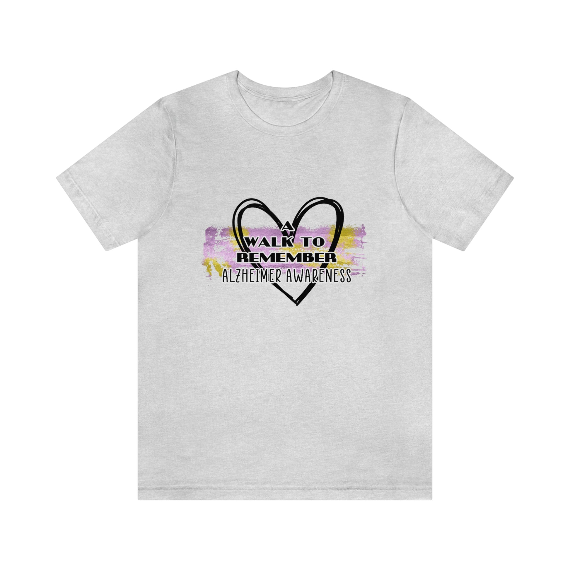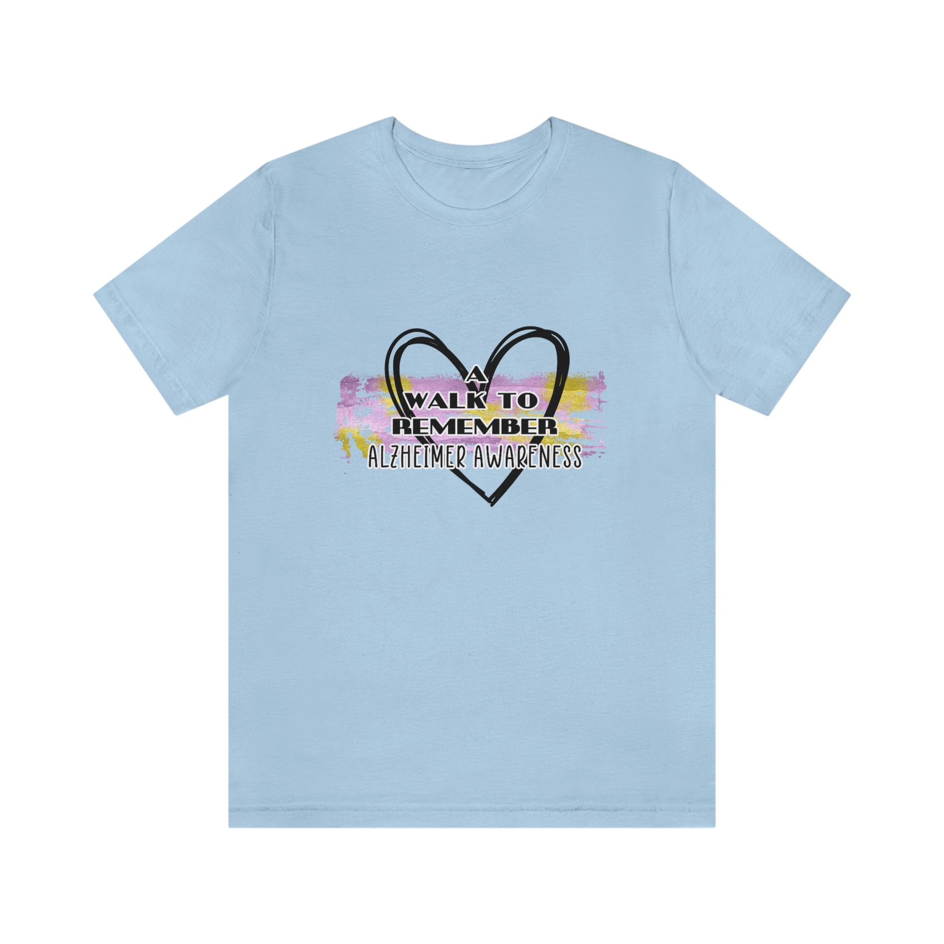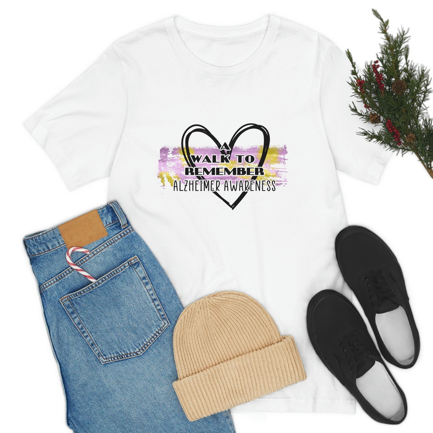 Show your support of Alzheimer awareness with this t-shirt with a heart and the words A Walk to Remember Alzheimer Awareness.