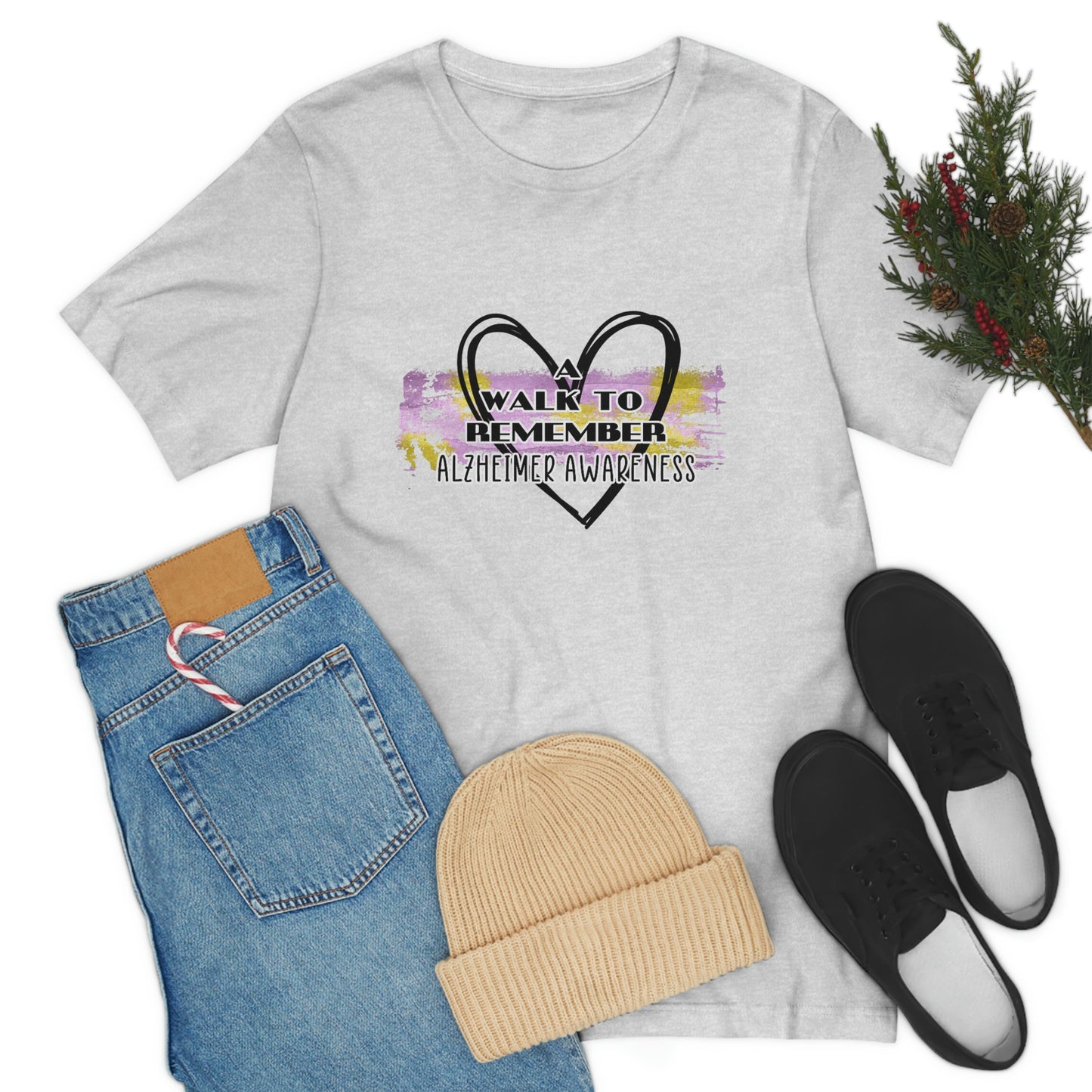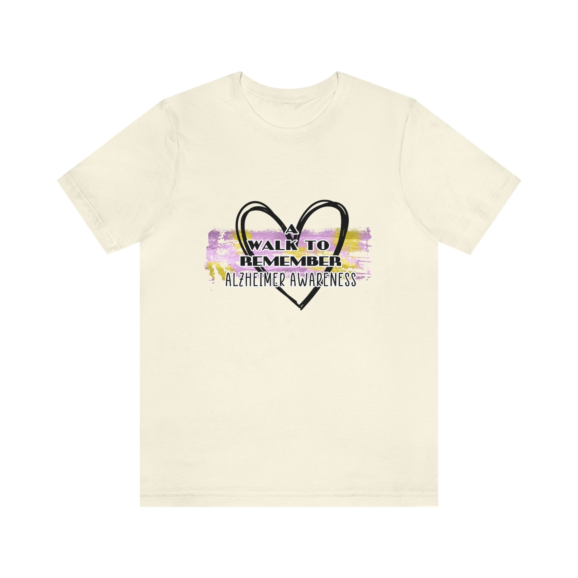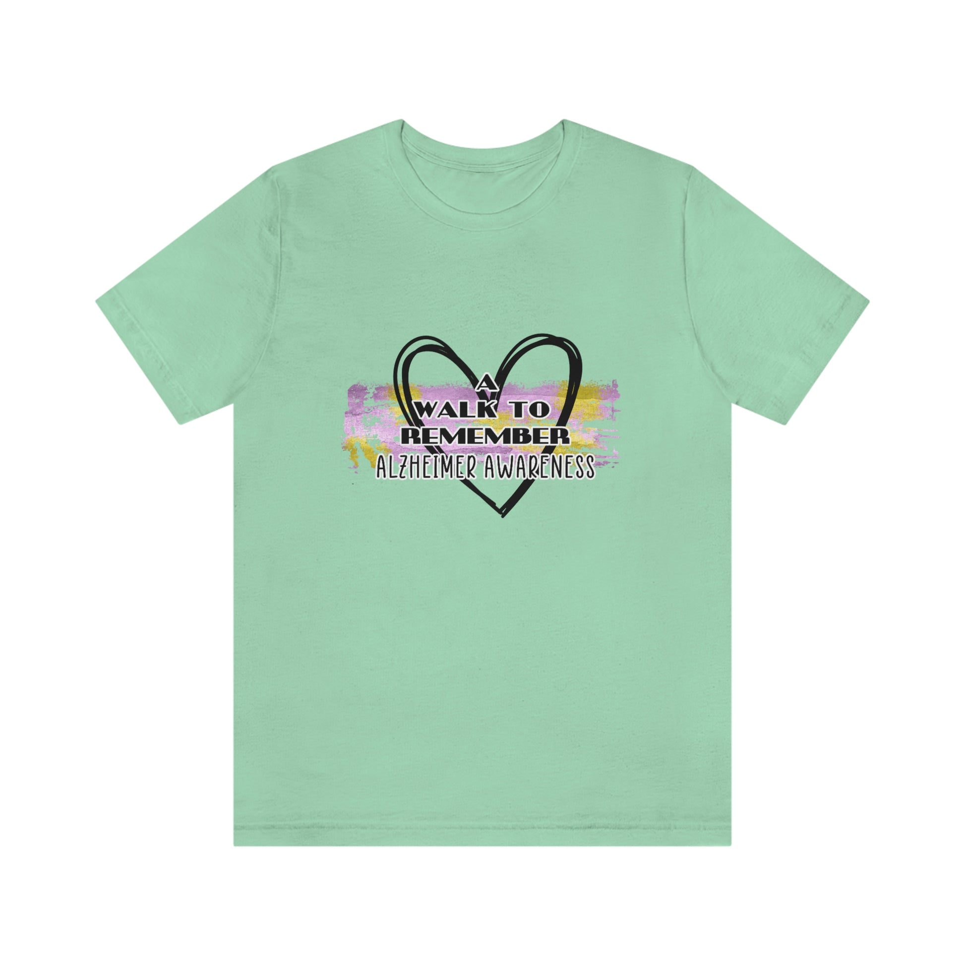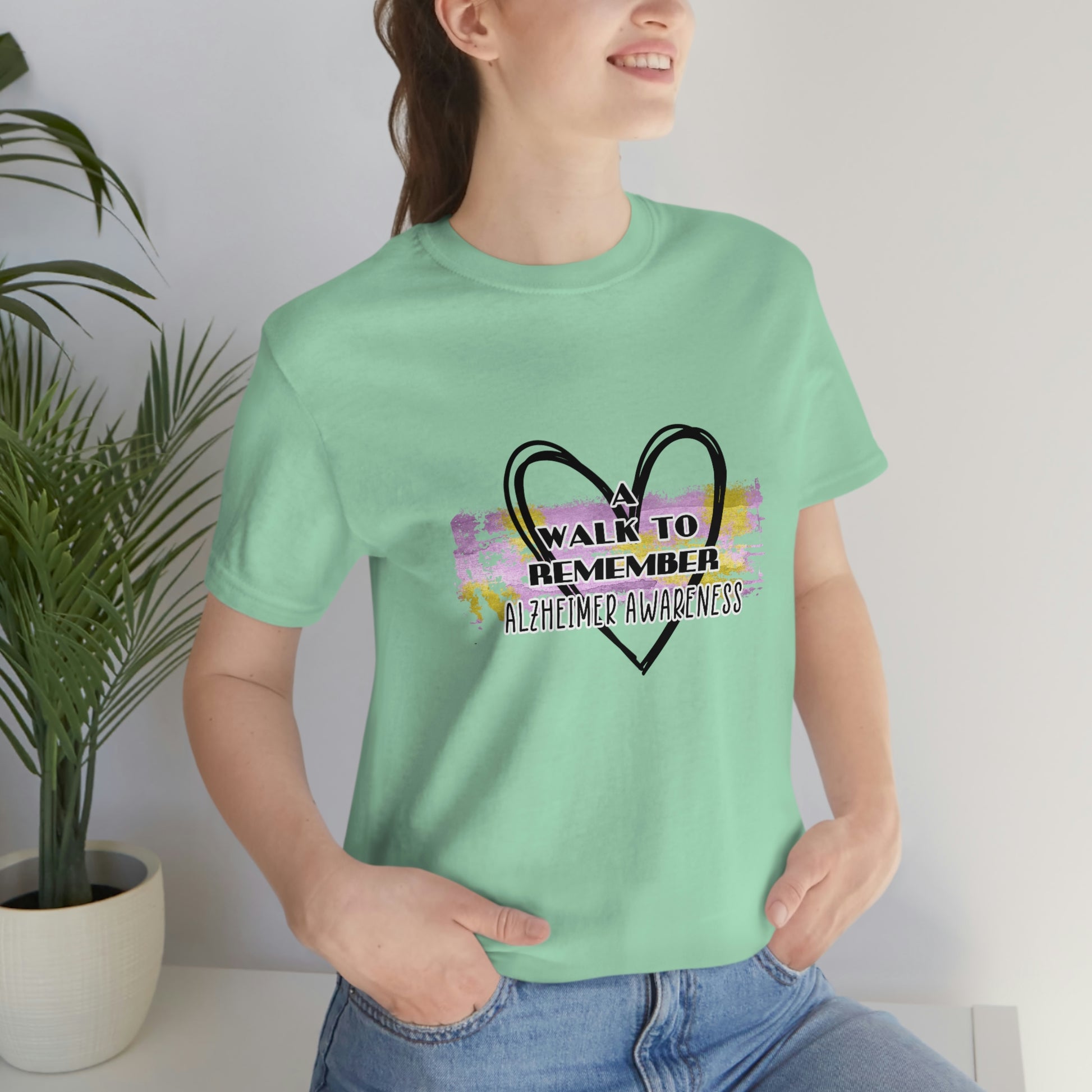 Show your support of Alzheimer awareness with this t-shirt with a heart and the words A Walk to Remember Alzheimer Awareness.