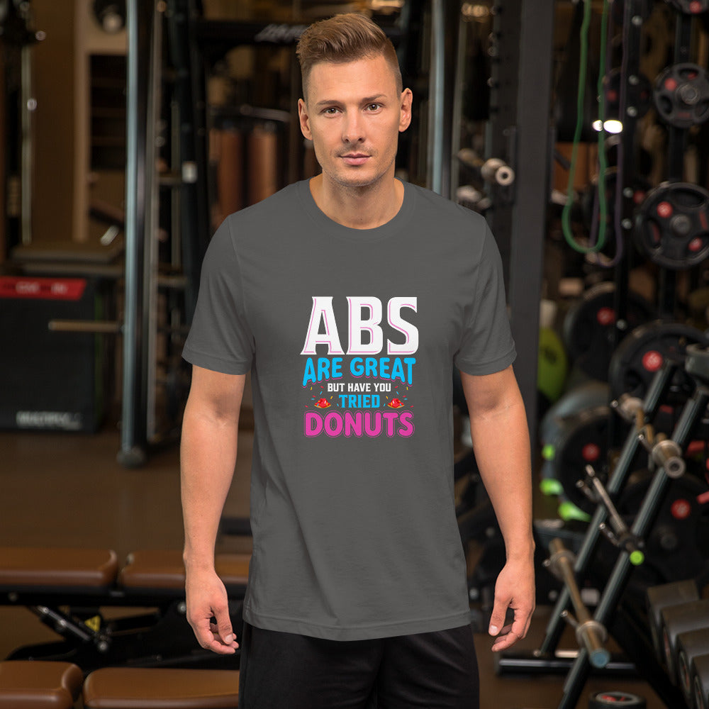 A fun t-shirt with the words Abs Are Great But Have You Tried Donuts.