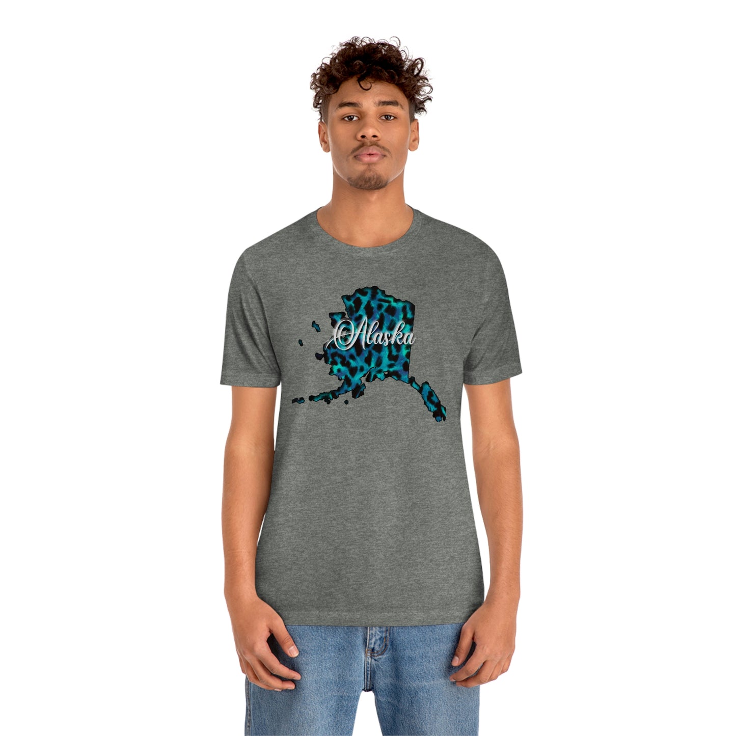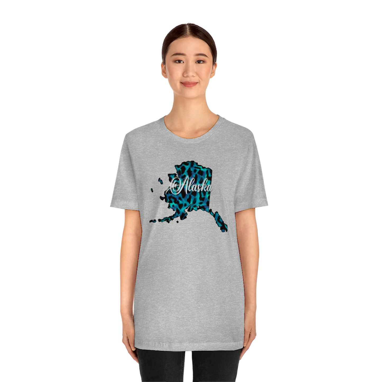 Show off your love and pride in Alaska by wearing this classic unisex short sleeve t-shirt showing the shape of the state of Alaska in a blue leopard with the word Alaska written in script. This tee fits like a well-loved favorite. Soft cotton and quality print make users fall in love with it over and over again. These t-shirts have-ribbed knit collars to bolster shaping. The shoulders have taping for better fit over time. Dual side seams hold the garment's shape for longer.