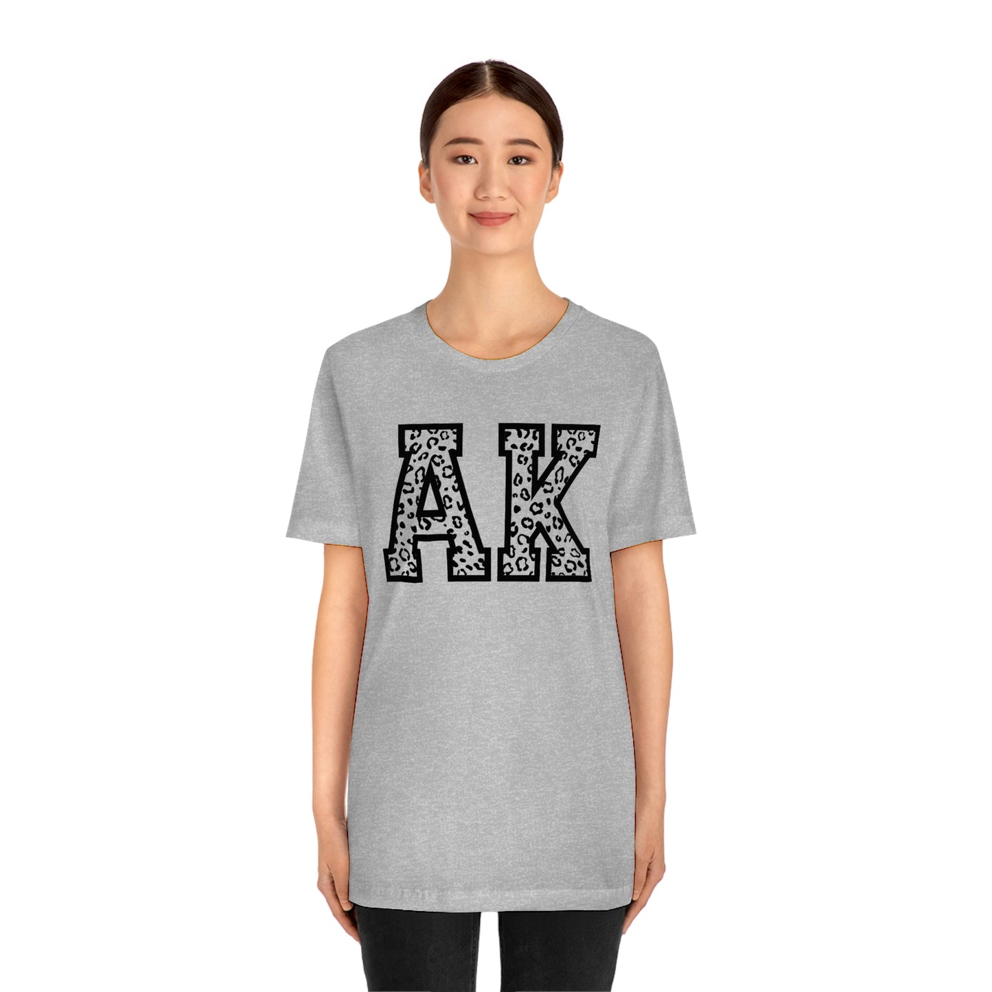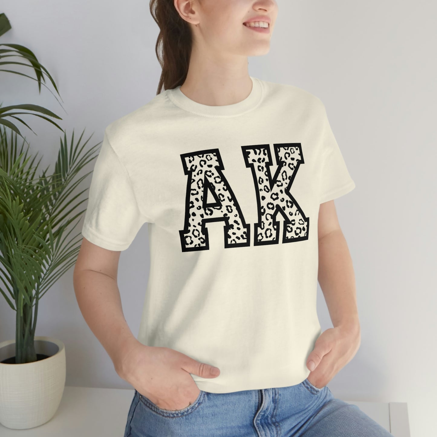 Show off your love and pride in Alaska by wearing this classic unisex short sleeve tshirt showing the letters AK in leopard print letters. This tee fits like a well-loved favorite. Soft cotton and quality print make users fall in love with it over and over again. These t-shirts have-ribbed knit collars to bolster shaping. The shoulders have taping for better fit over time. Dual side seams hold the garment's shape for longer.