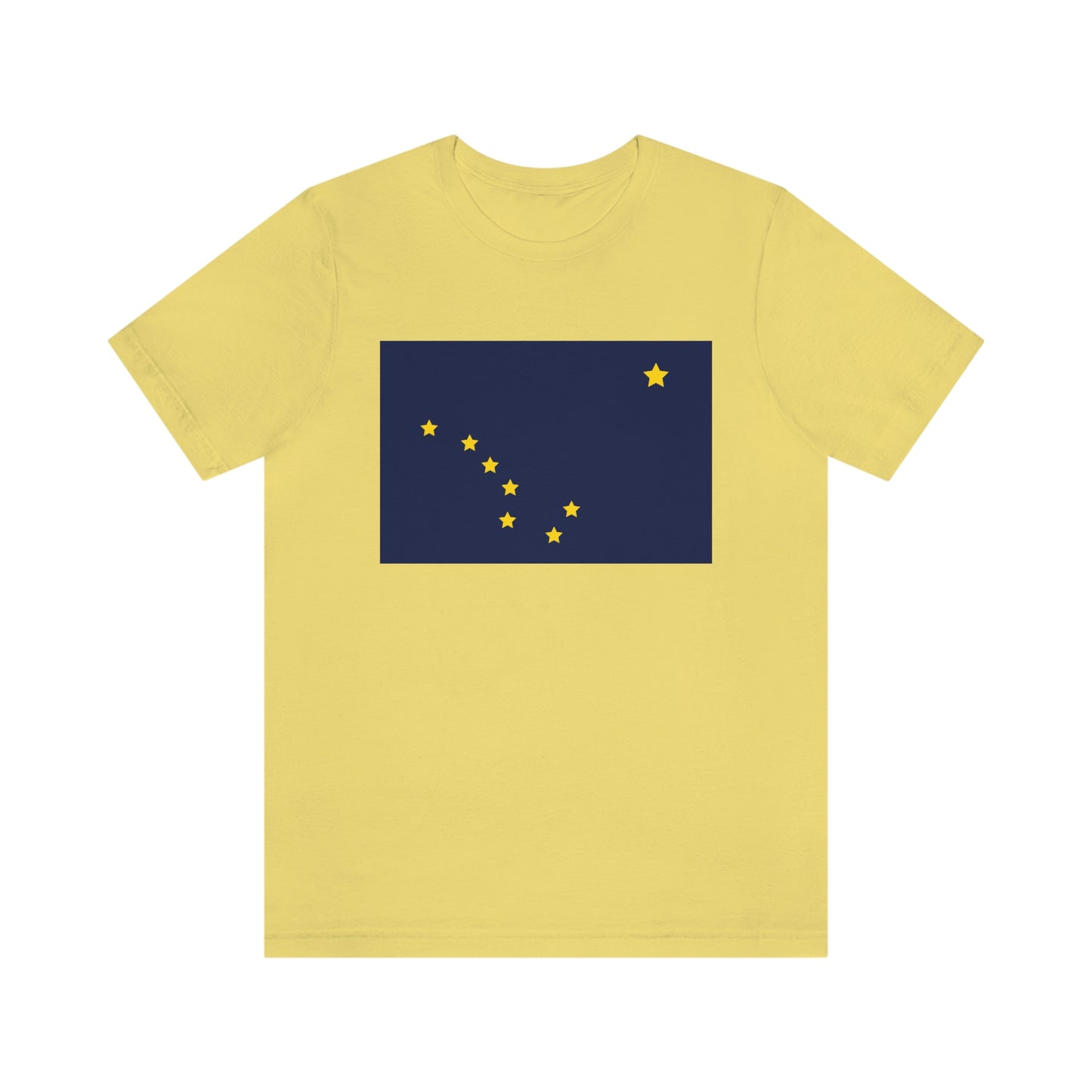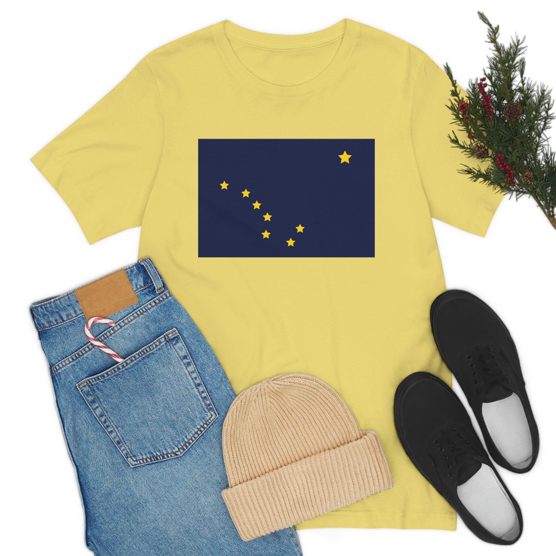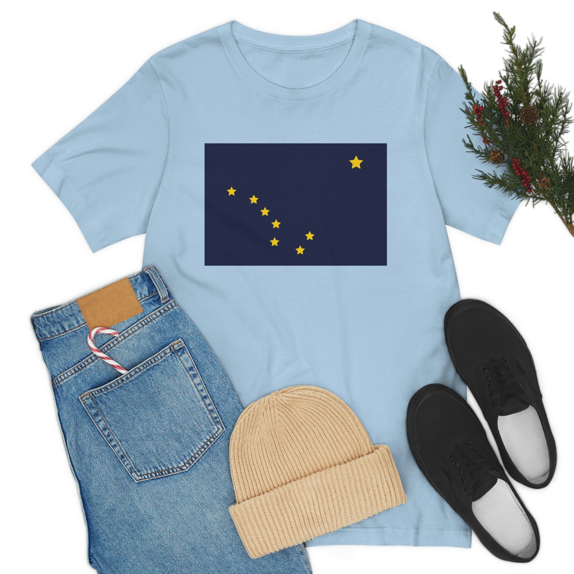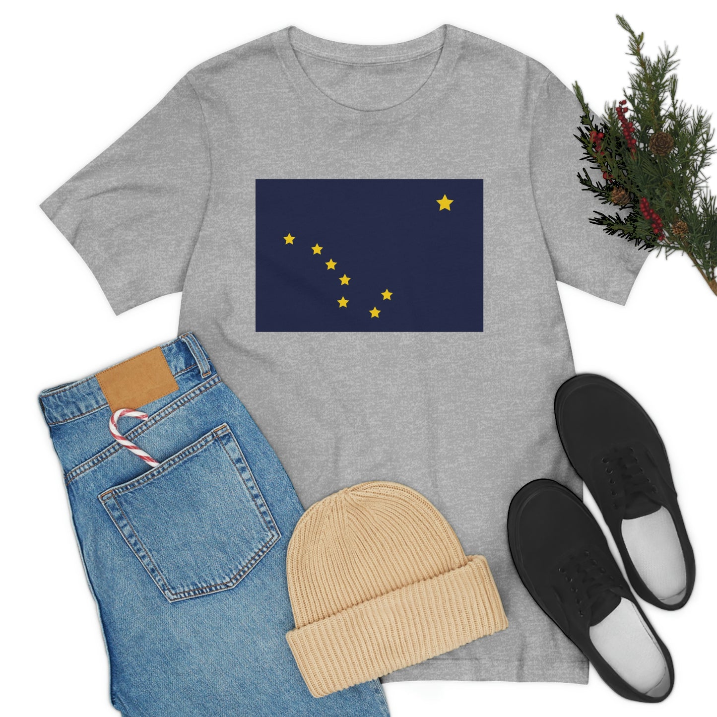 Show off your love and pride in Alaska by wearing this classic unisex short sleeve tshirt sporting the flag of Alaska. This tee fits like a well-loved favorite. Soft cotton and quality print make users fall in love with it over and over again. These t-shirts have-ribbed knit collars to bolster shaping. The shoulders have taping for better fit over time. Dual side seams hold the garment's shape for longer.