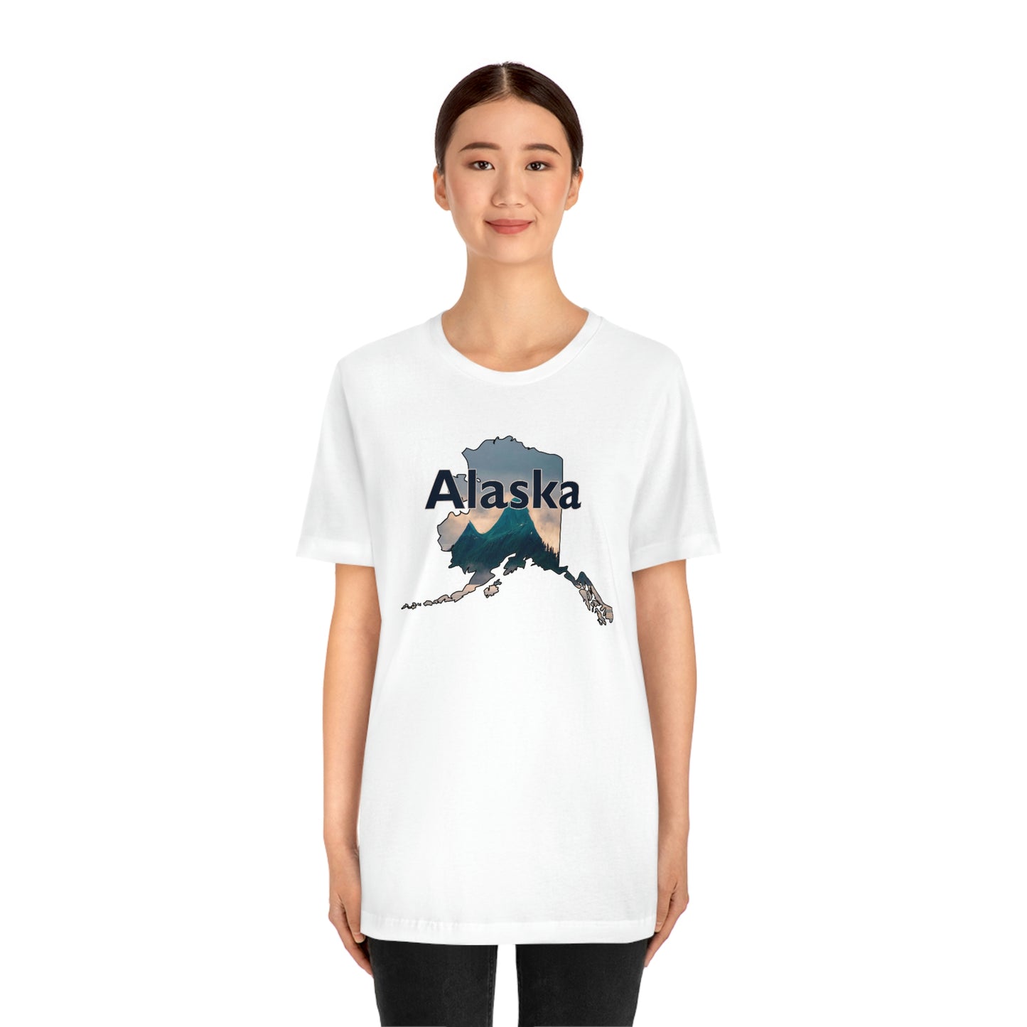 Show off your love and pride in your hometown by wearing this classic unisex short sleeve tshirt showing the shape of Alaska with a mountain scene and word Alaska on it. This tee fits like a well-loved favorite. Soft cotton and quality print make users fall in love with it over and over again. These t-shirts have-ribbed knit collars to bolster shaping. The shoulders have taping for better fit over time. Dual side seams hold the garment's shape for longer.