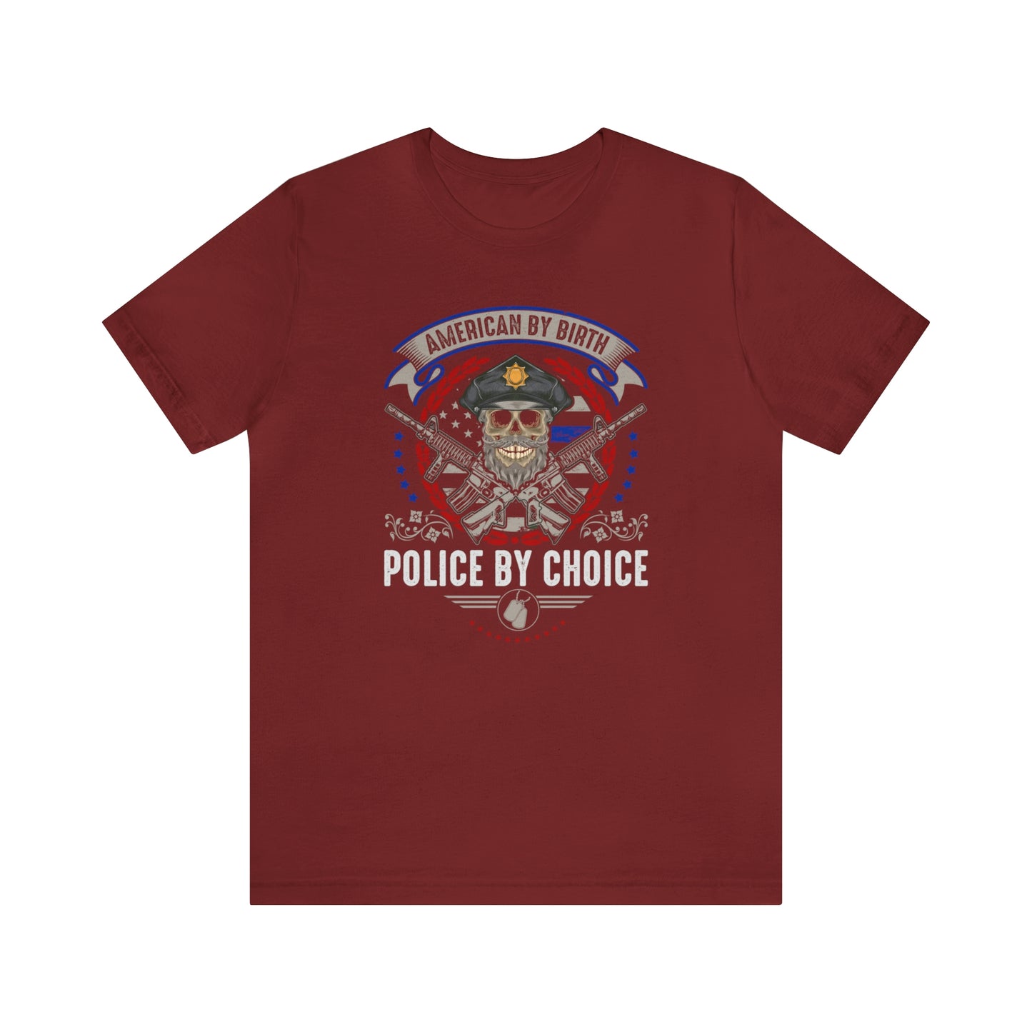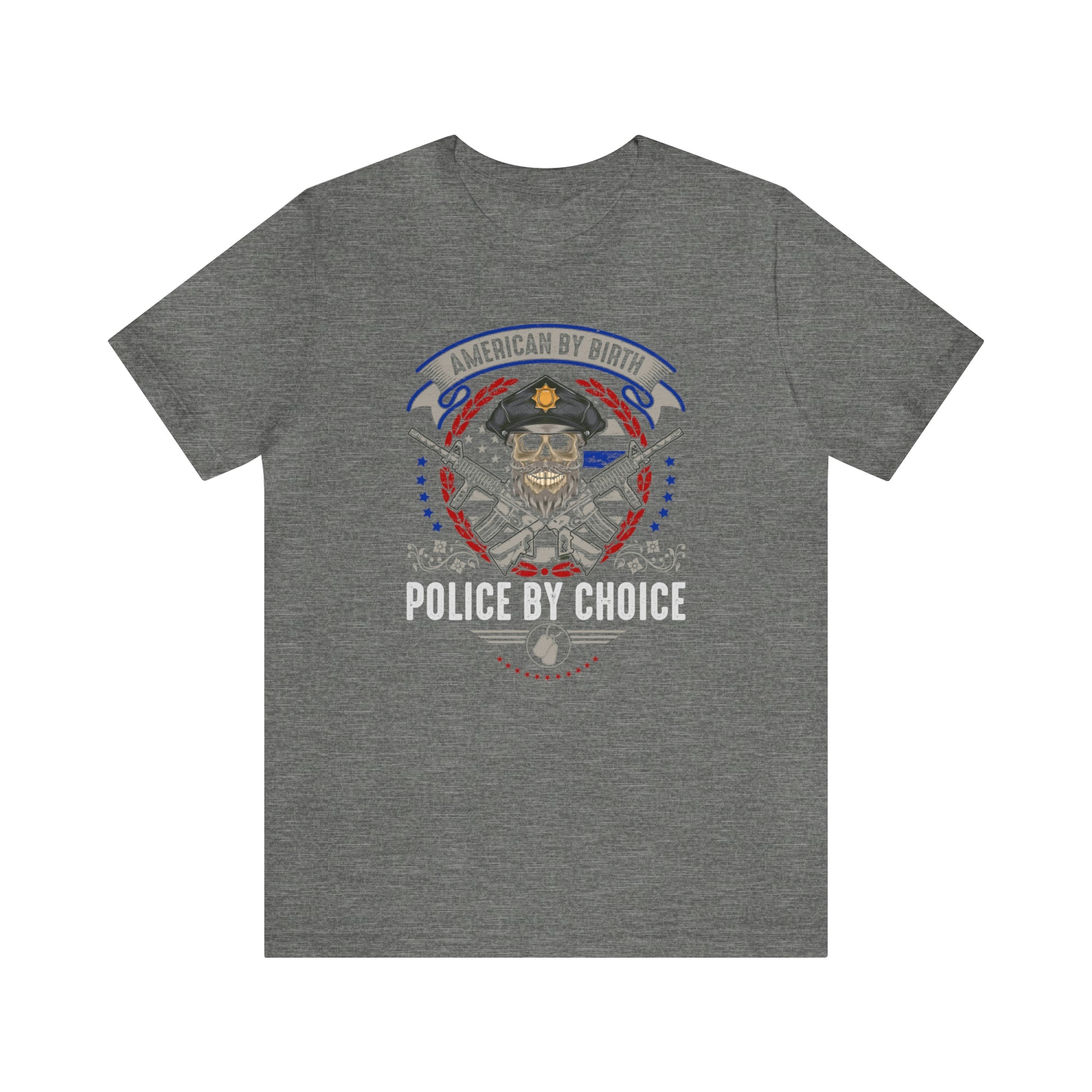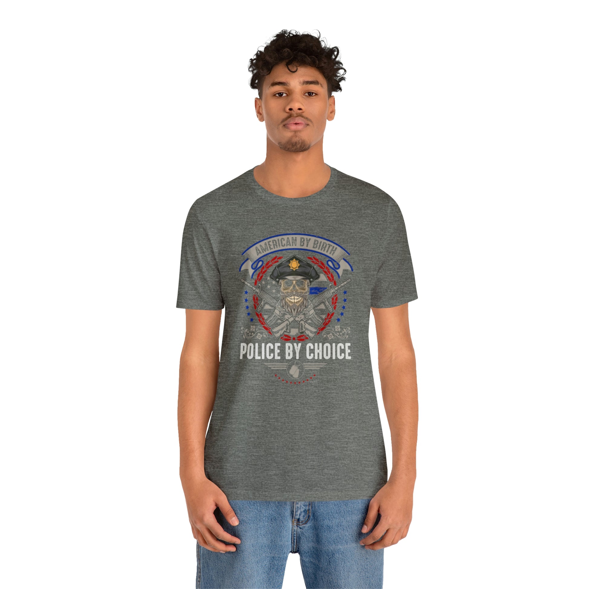 This classic unisex short sleeve t-shirt reads American by Birth Police by Choice. This tee fits like a well-loved favorite. Soft cotton and quality print make you fall in love with it over and over again. These t-shirts have ribbed knit collars to bolster shaping. The shoulders have taping for better fit over time. Dual side seams hold the garment's shape for longer.