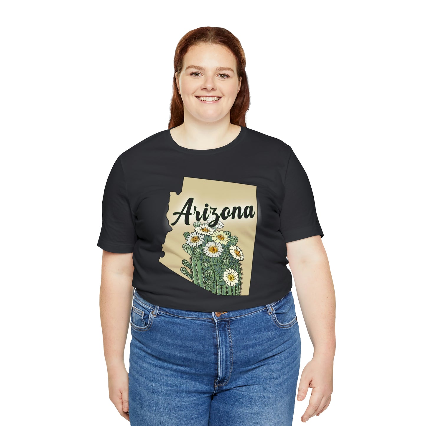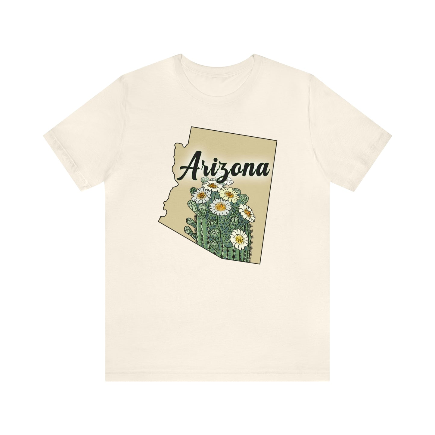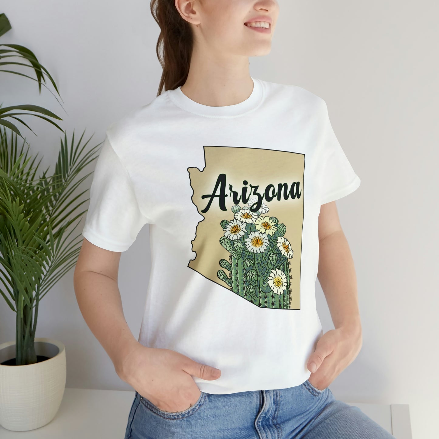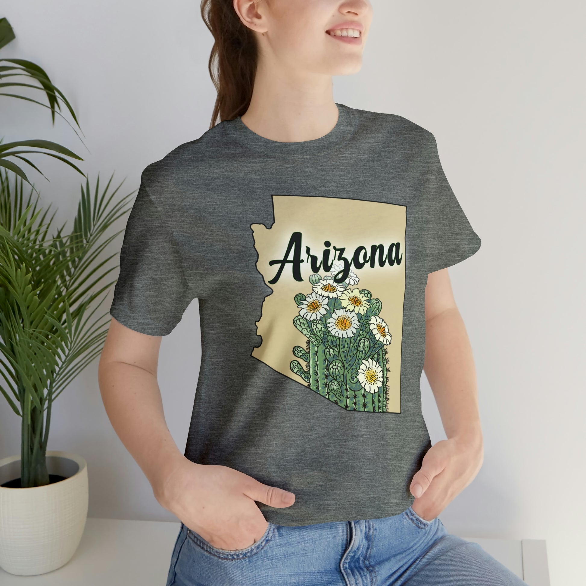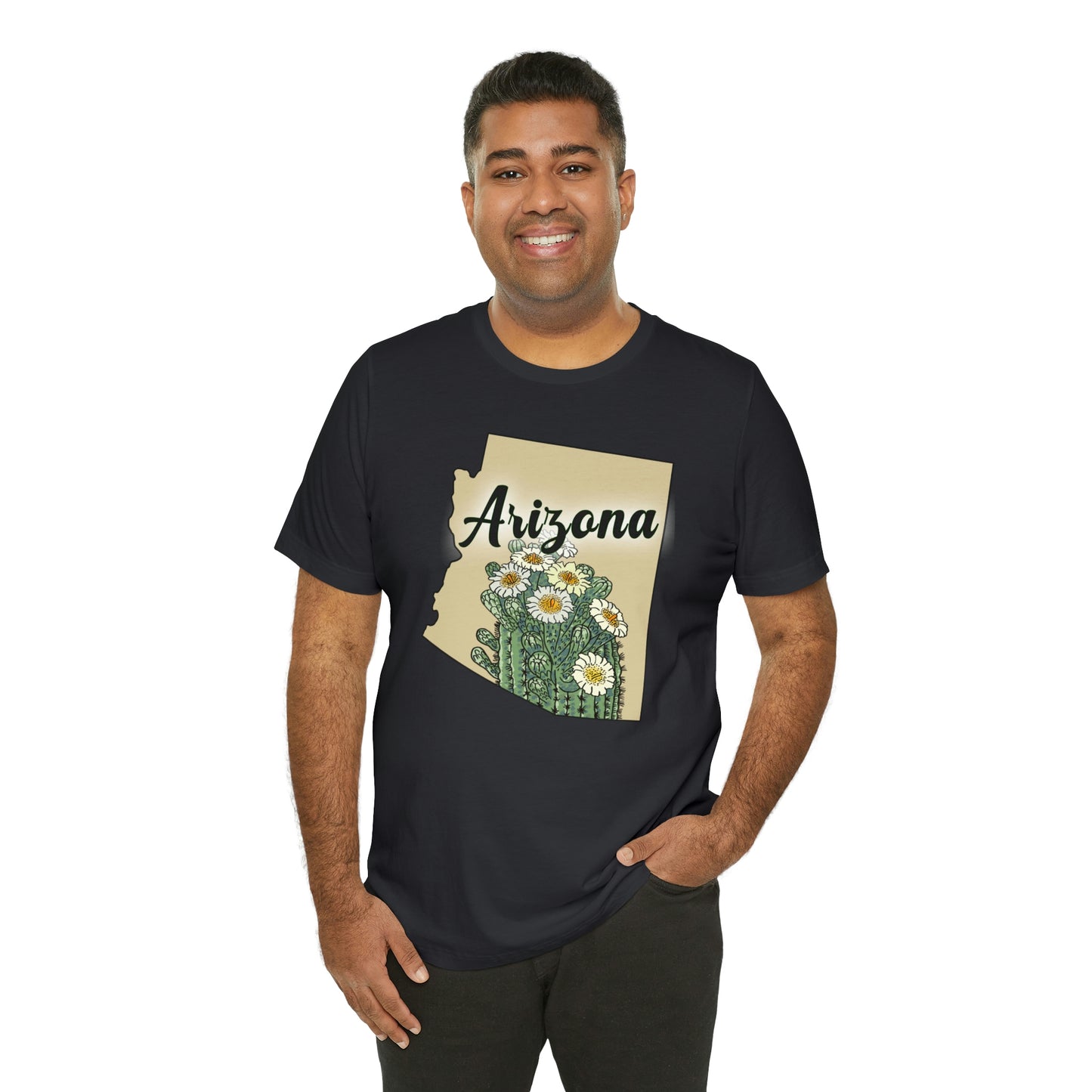 Show off your love and pride in Arizona with this classic unisex short sleeve t-shirt showing Arizona with a saguaro cactus bloom on it. This tee fits like a well-loved favorite. Soft cotton and quality print make you fall in love with it over and over again. These t-shirts have ribbed knit collars to bolster shaping. The shoulders have taping for better fit over time. Dual side seams hold the garment's shape for longer.
