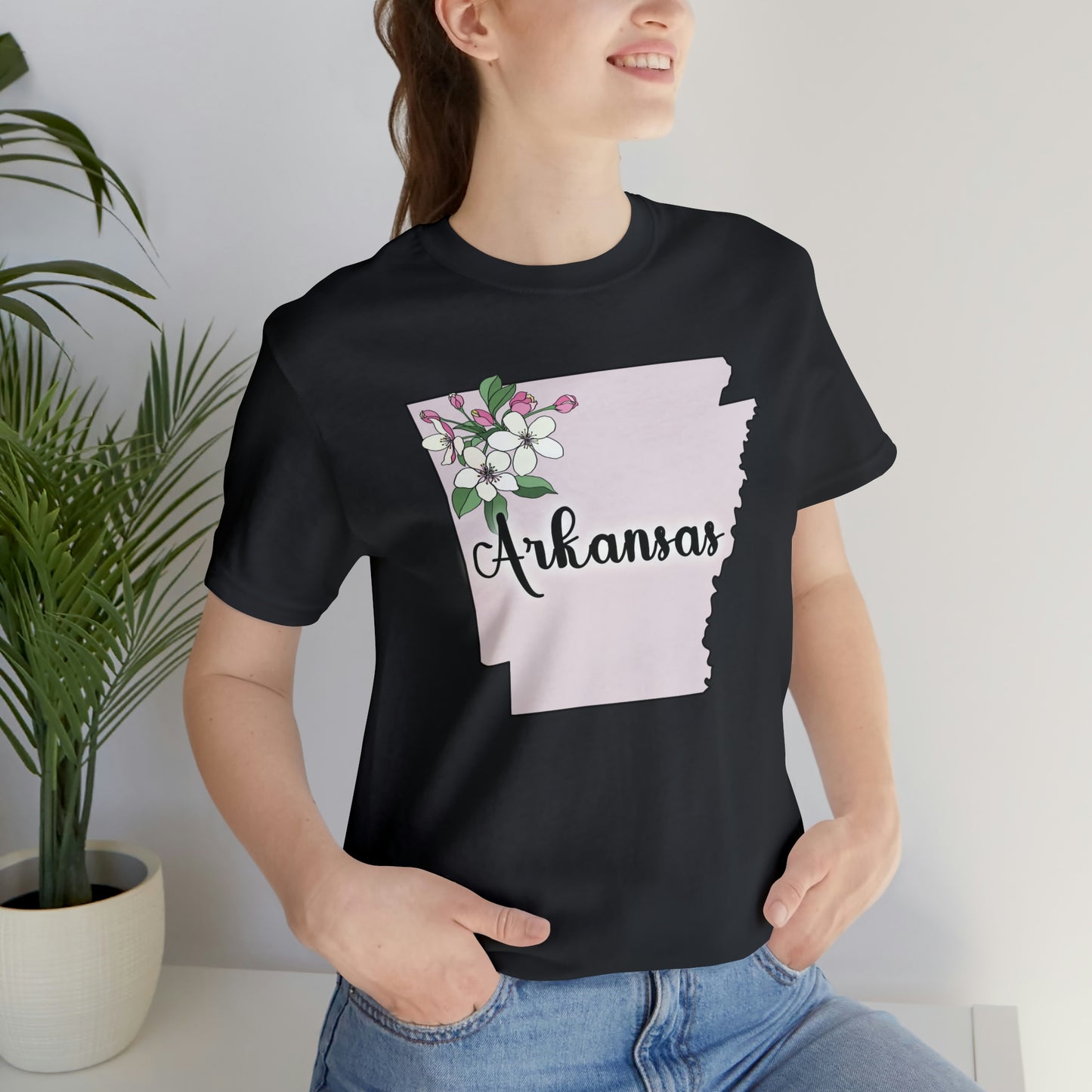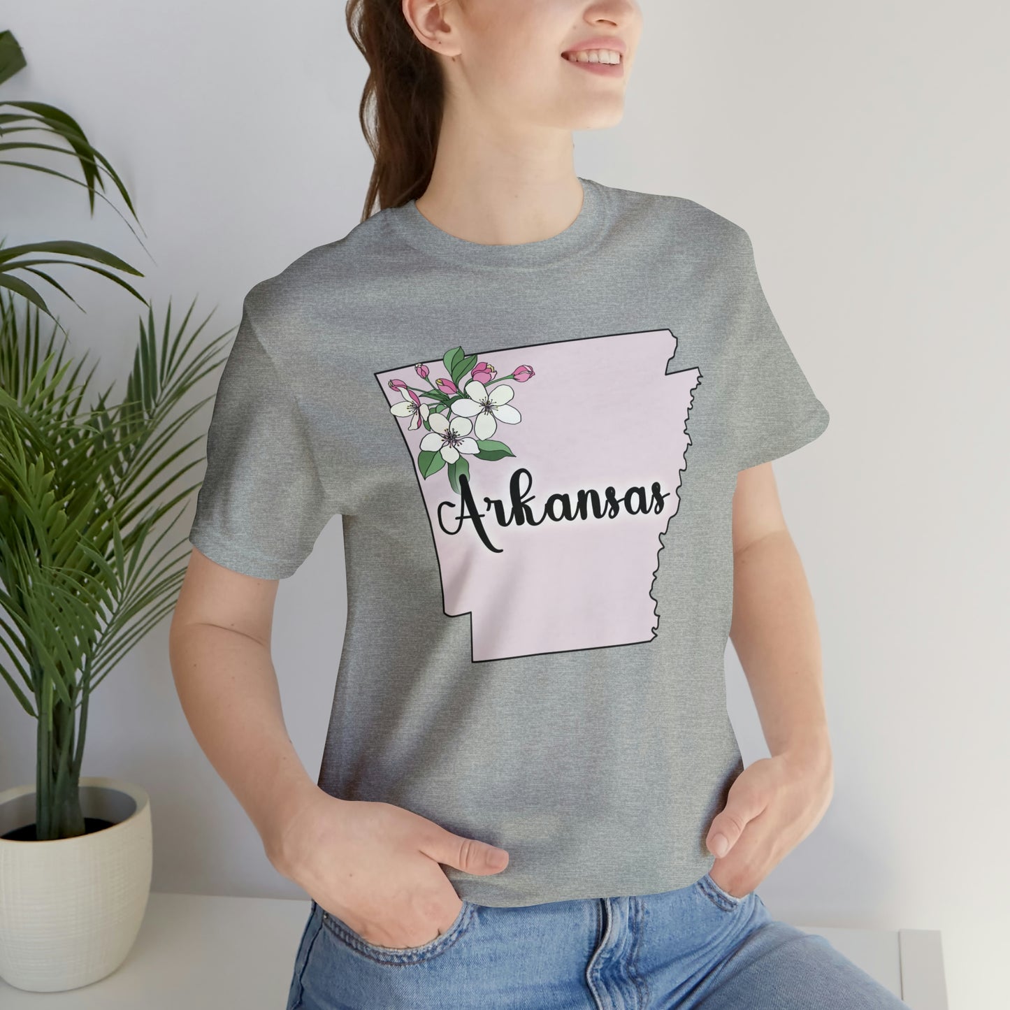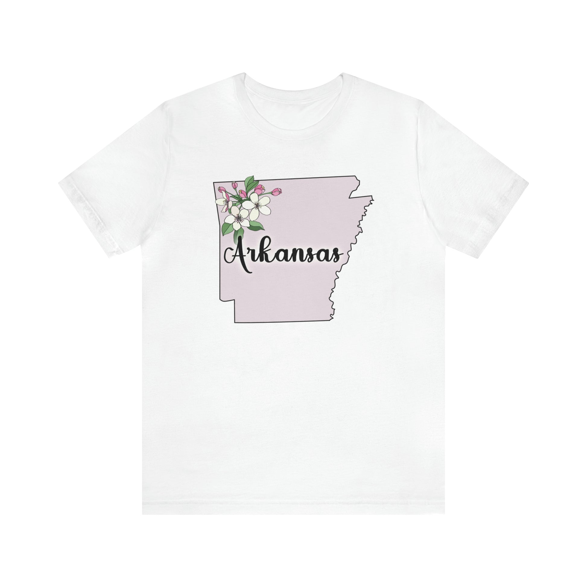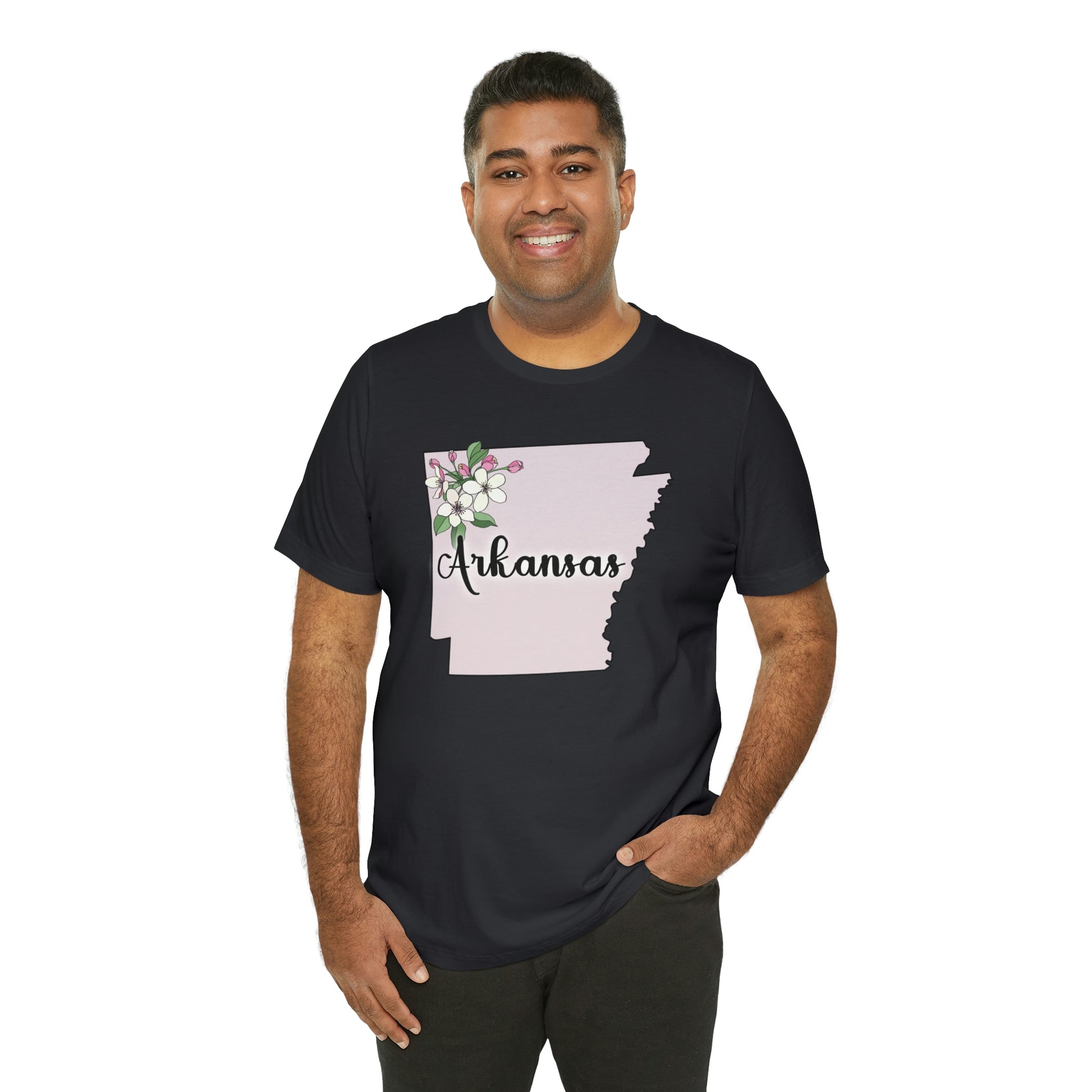 Show off your love and pride in Arkansas with this classic unisex short sleeve t-shirt showing Arkansas with an apple blossom on it. This tee fits like a well-loved favorite. Soft cotton and quality print make you fall in love with it over and over again. These t-shirts have ribbed knit collars to bolster shaping. The shoulders have taping for better fit over time. Dual side seams hold the garment's shape for longer.