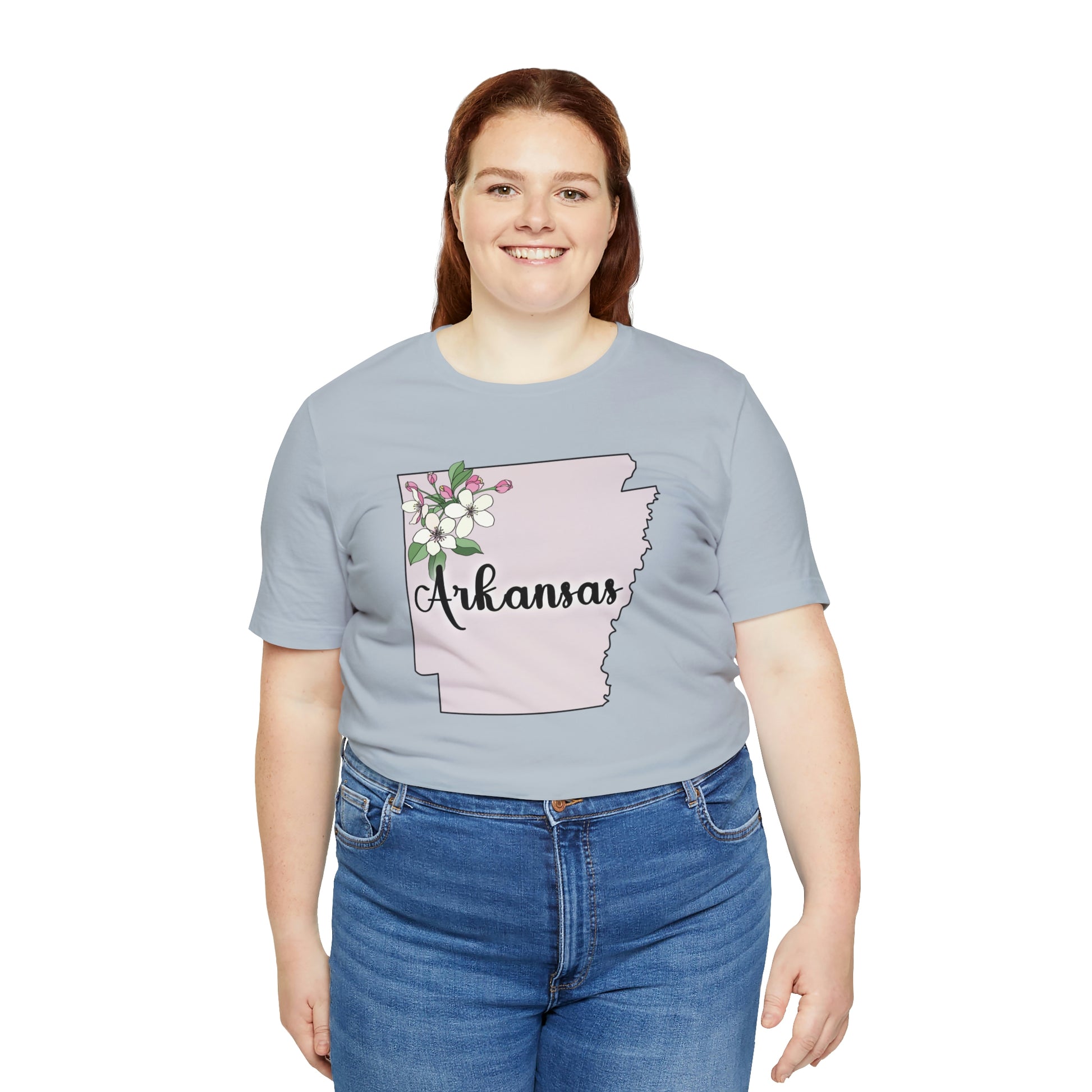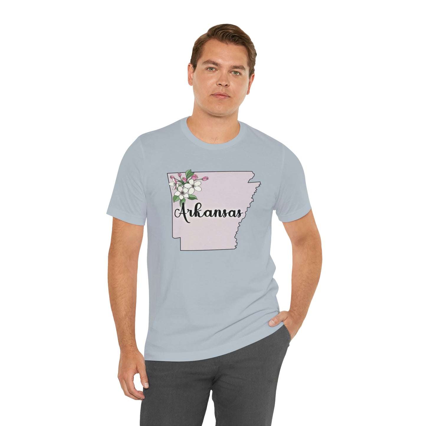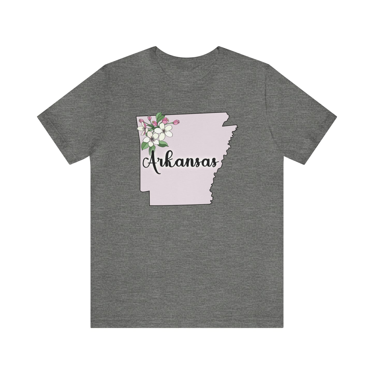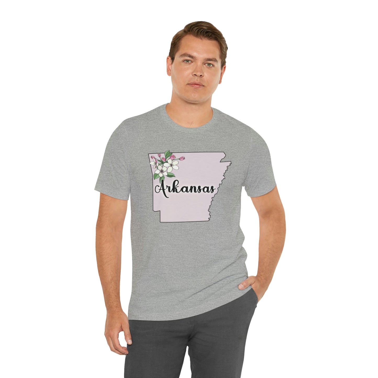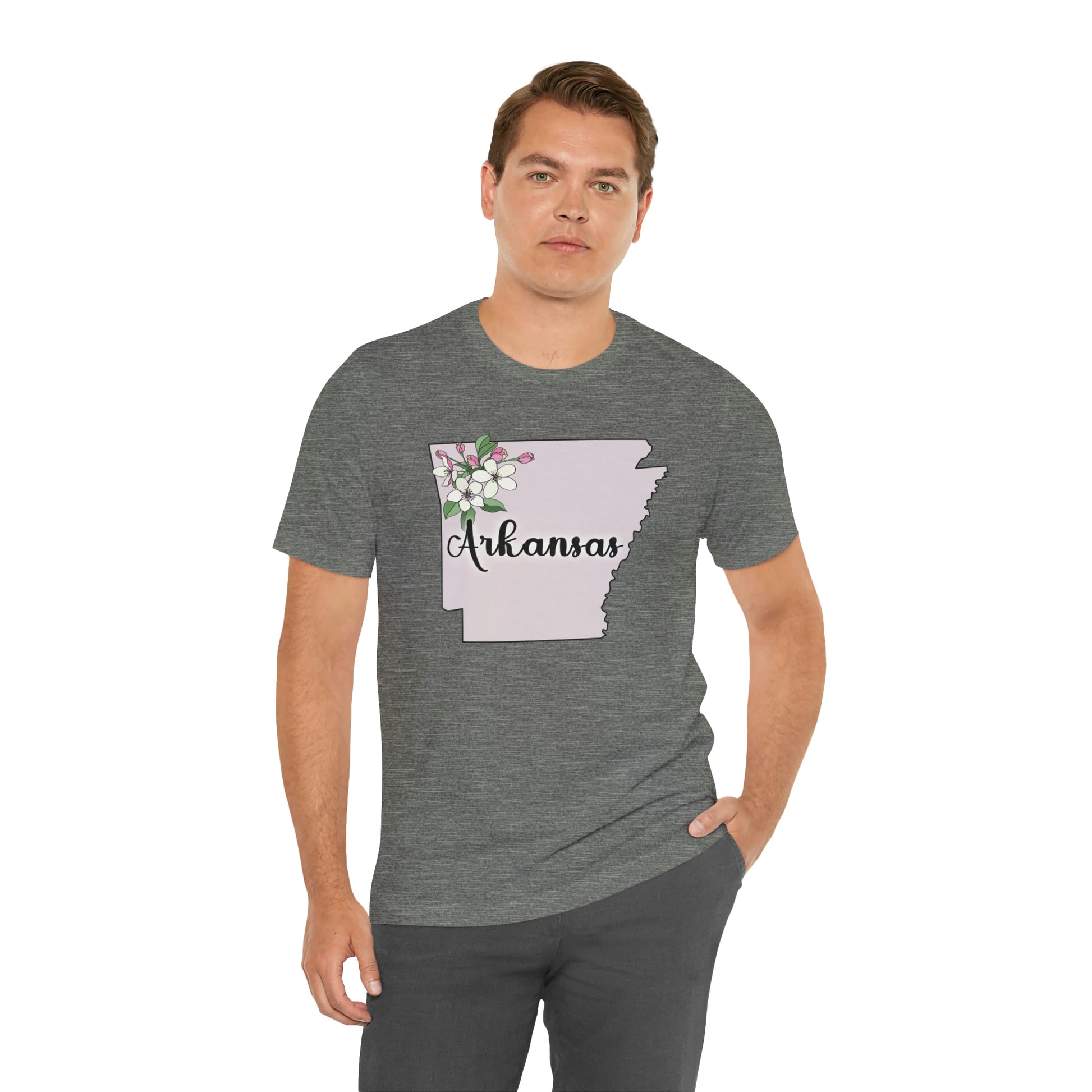 Show off your love and pride in Arkansas with this classic unisex short sleeve t-shirt showing Arkansas with an apple blossom on it. This tee fits like a well-loved favorite. Soft cotton and quality print make you fall in love with it over and over again. These t-shirts have ribbed knit collars to bolster shaping. The shoulders have taping for better fit over time. Dual side seams hold the garment's shape for longer.