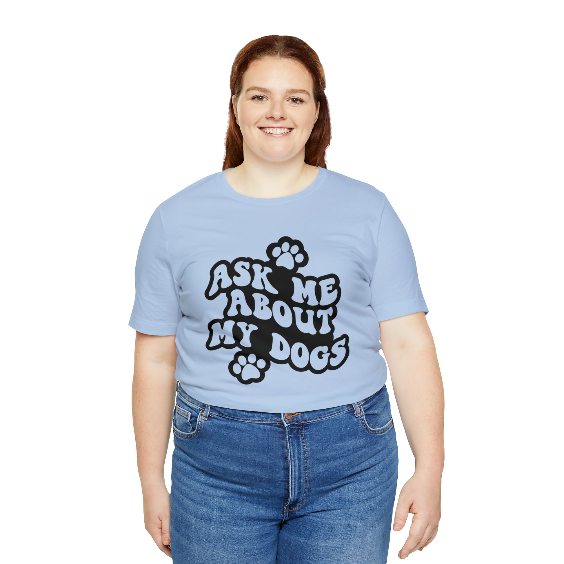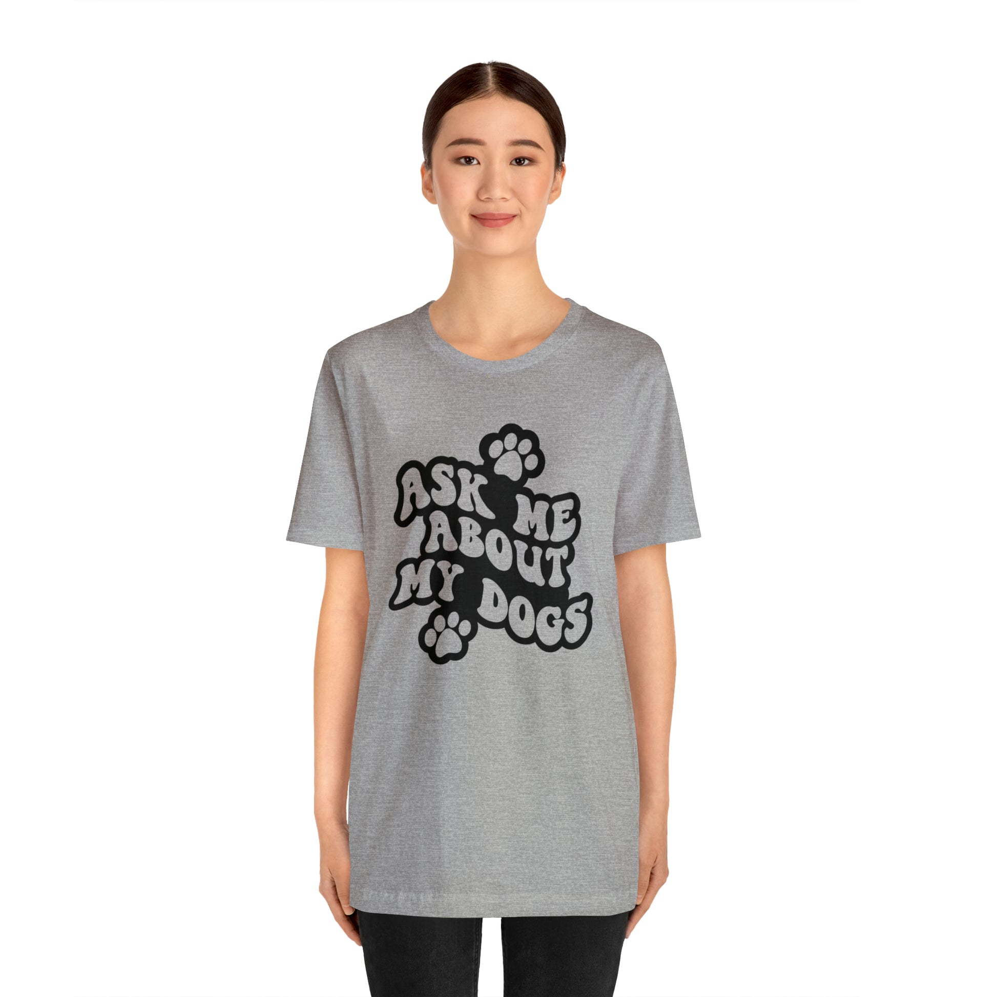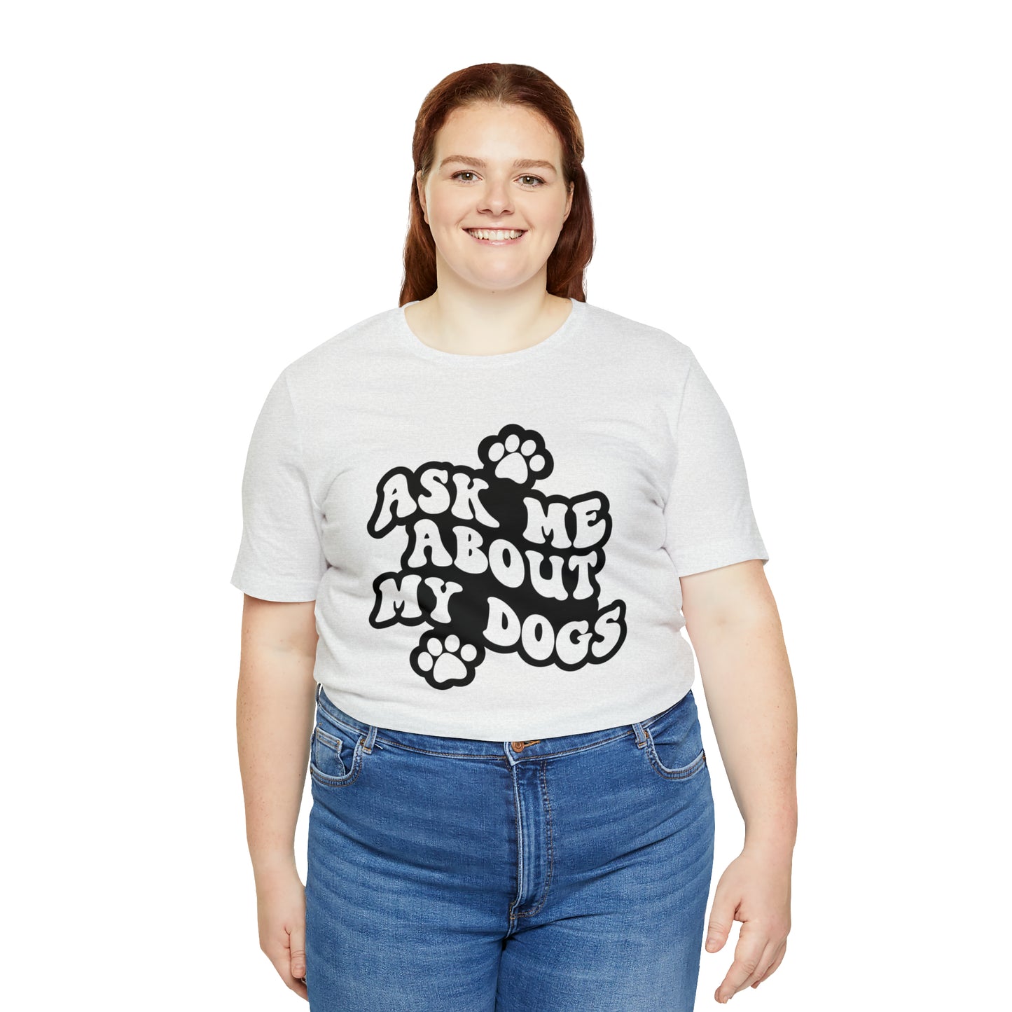 This classic unisex short sleeve dog t-shirt reads Ask Me About My Dogs. This tee fits like a well-loved favorite. Soft cotton and quality print make you fall in love with it over and over again. These t-shirts have ribbed knit collars to bolster shaping. The shoulders have taping for better fit over time. Dual side seams hold the garment's shape for longer.