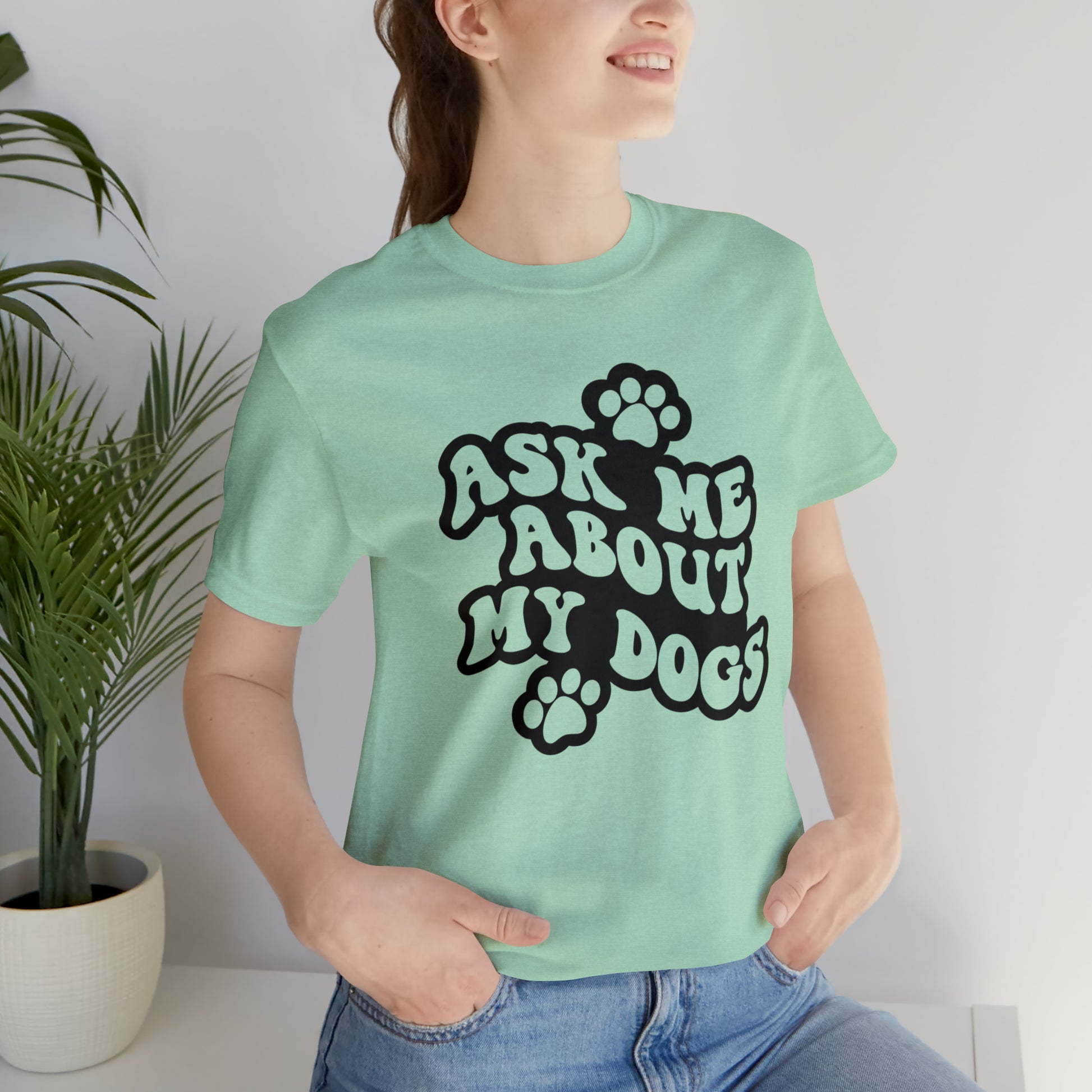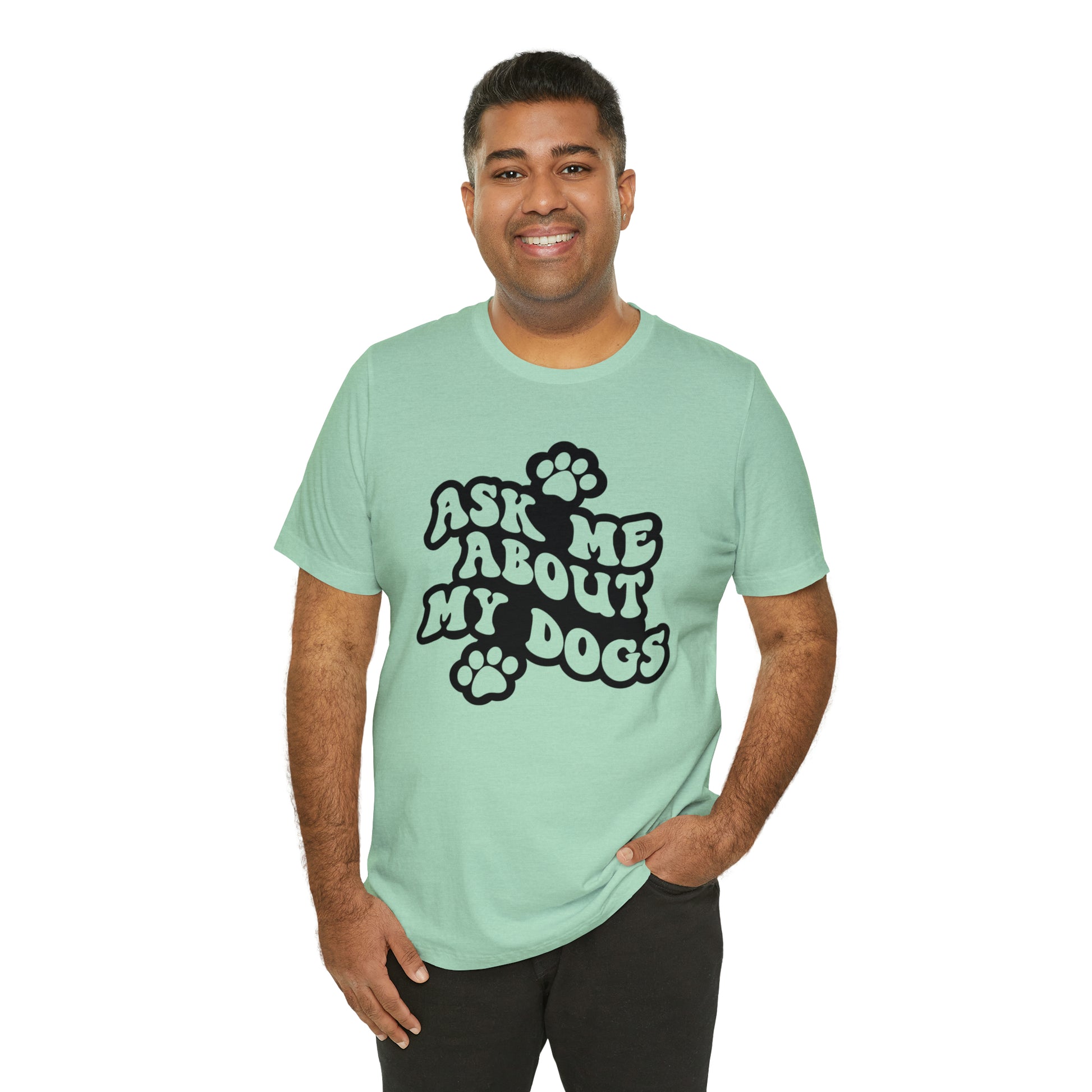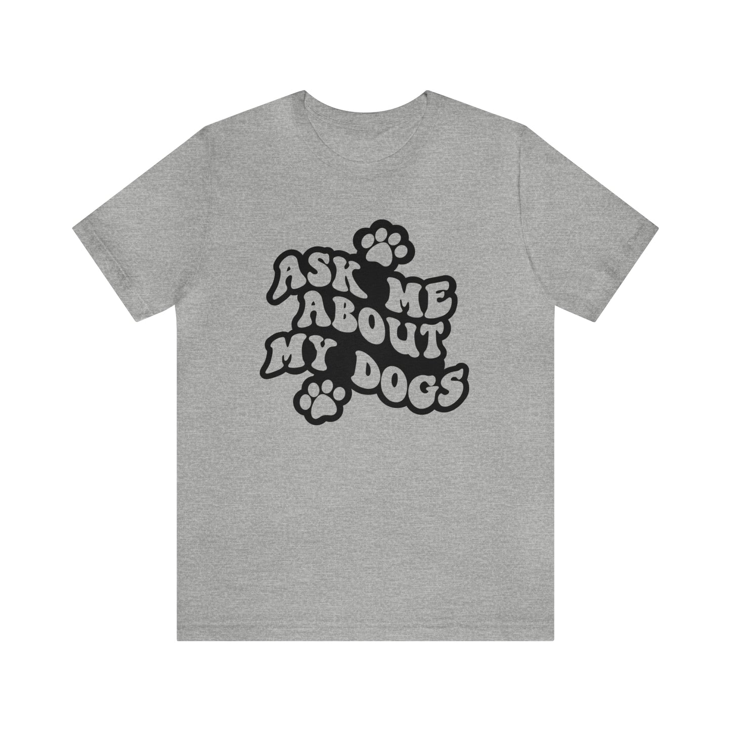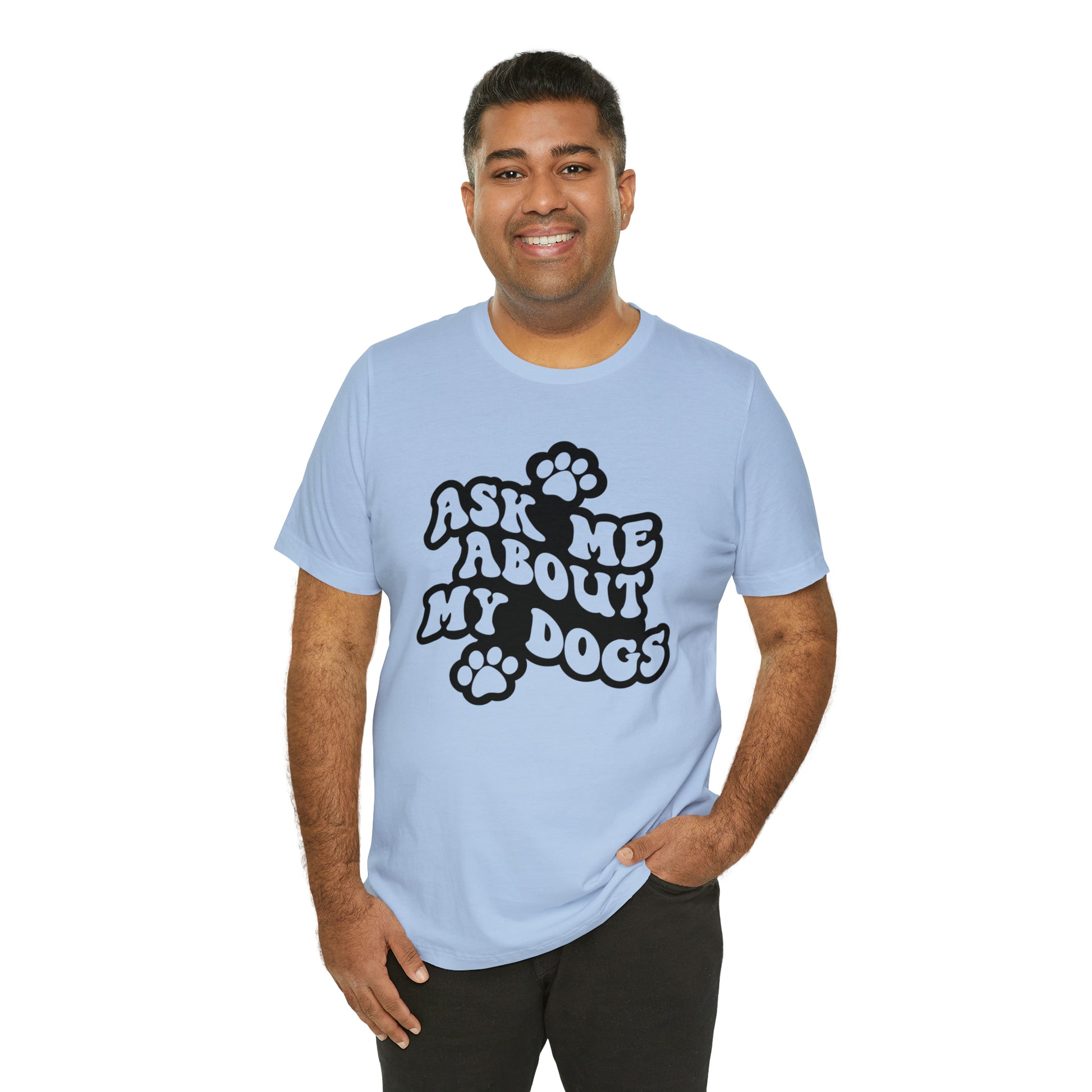 This classic unisex short sleeve dog t-shirt reads Ask Me About My Dogs. This tee fits like a well-loved favorite. Soft cotton and quality print make you fall in love with it over and over again. These t-shirts have ribbed knit collars to bolster shaping. The shoulders have taping for better fit over time. Dual side seams hold the garment's shape for longer.