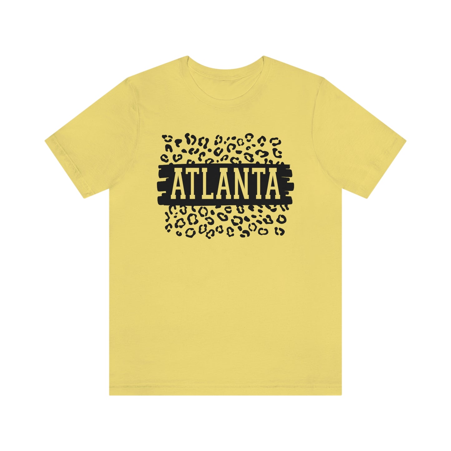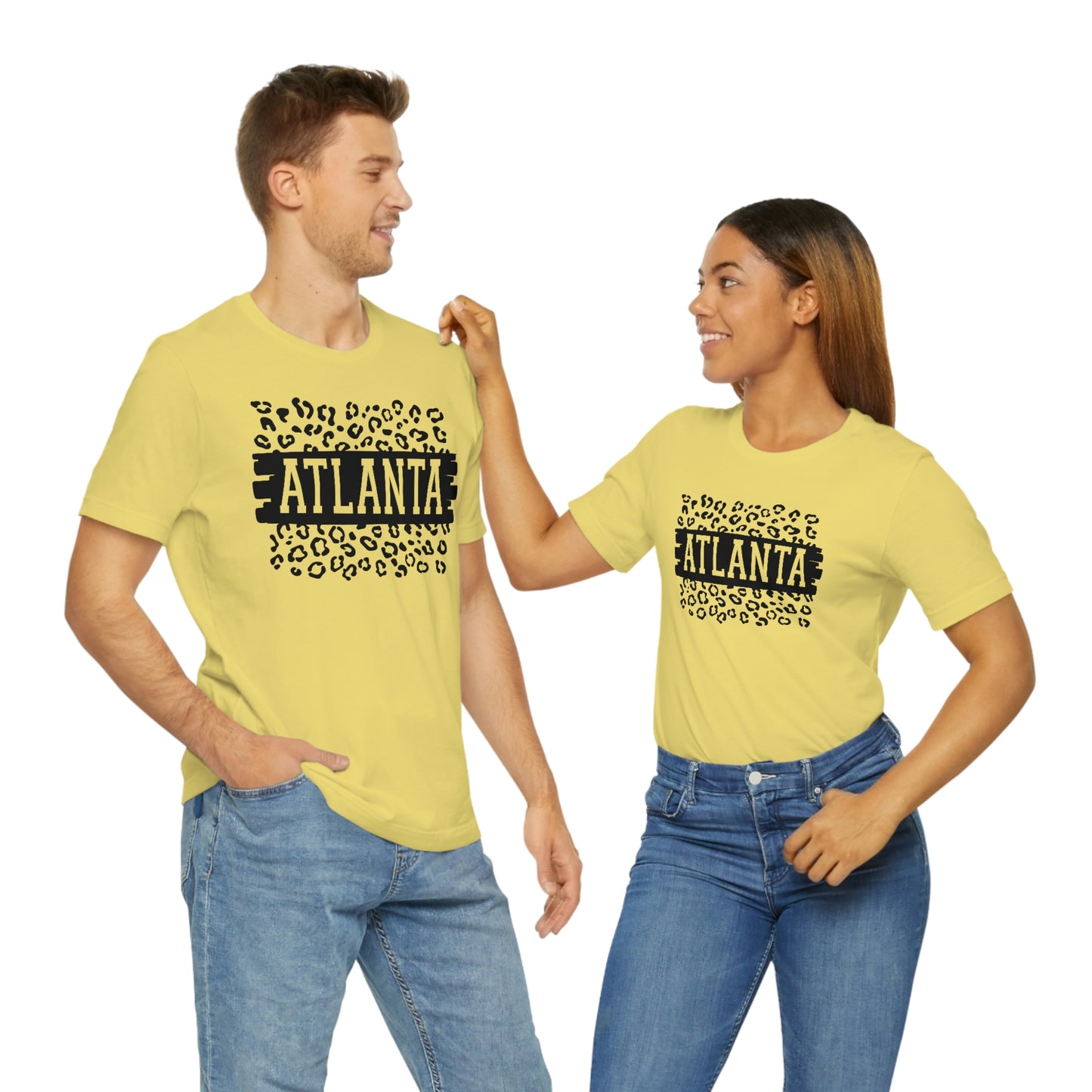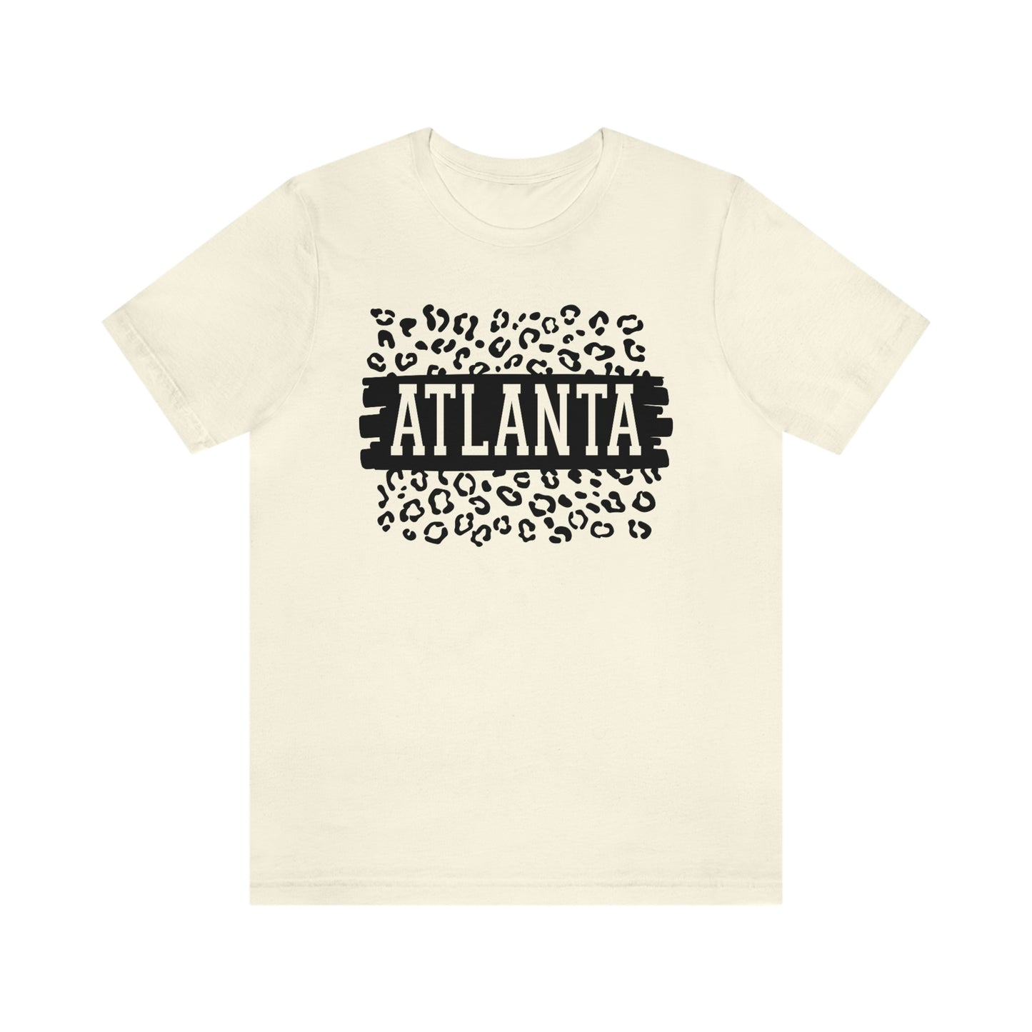 Show off your love and pride in Atlanta with this classic unisex short sleeve t-shirt showing Atlanta written on a black stripe on a leopard print background. This tee fits like a well-loved favorite. Soft cotton and quality print make you fall in love with it over and over again. These t-shirts have ribbed knit collars to bolster shaping. The shoulders have taping for better fit over time. Dual side seams hold the garment's shape for longer.