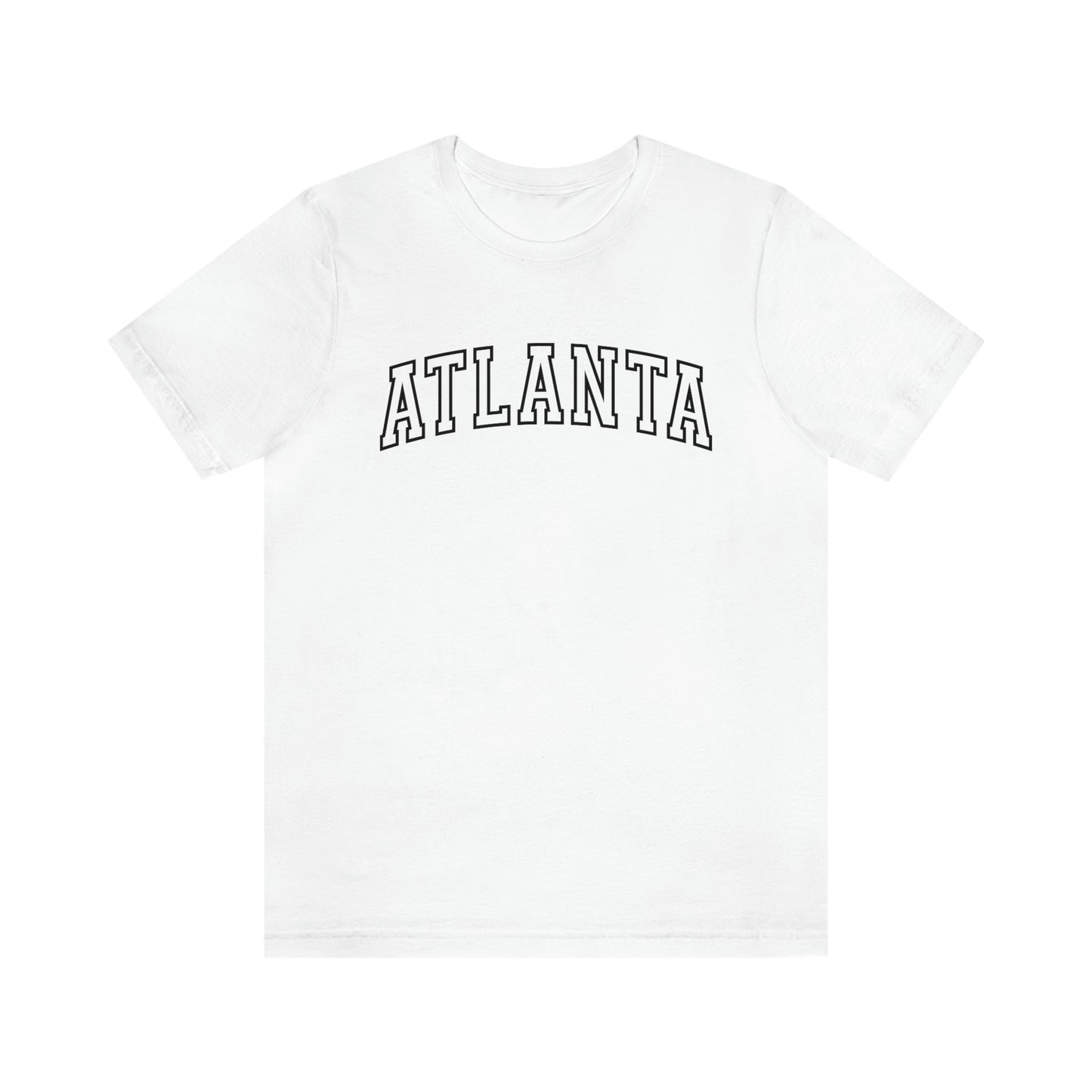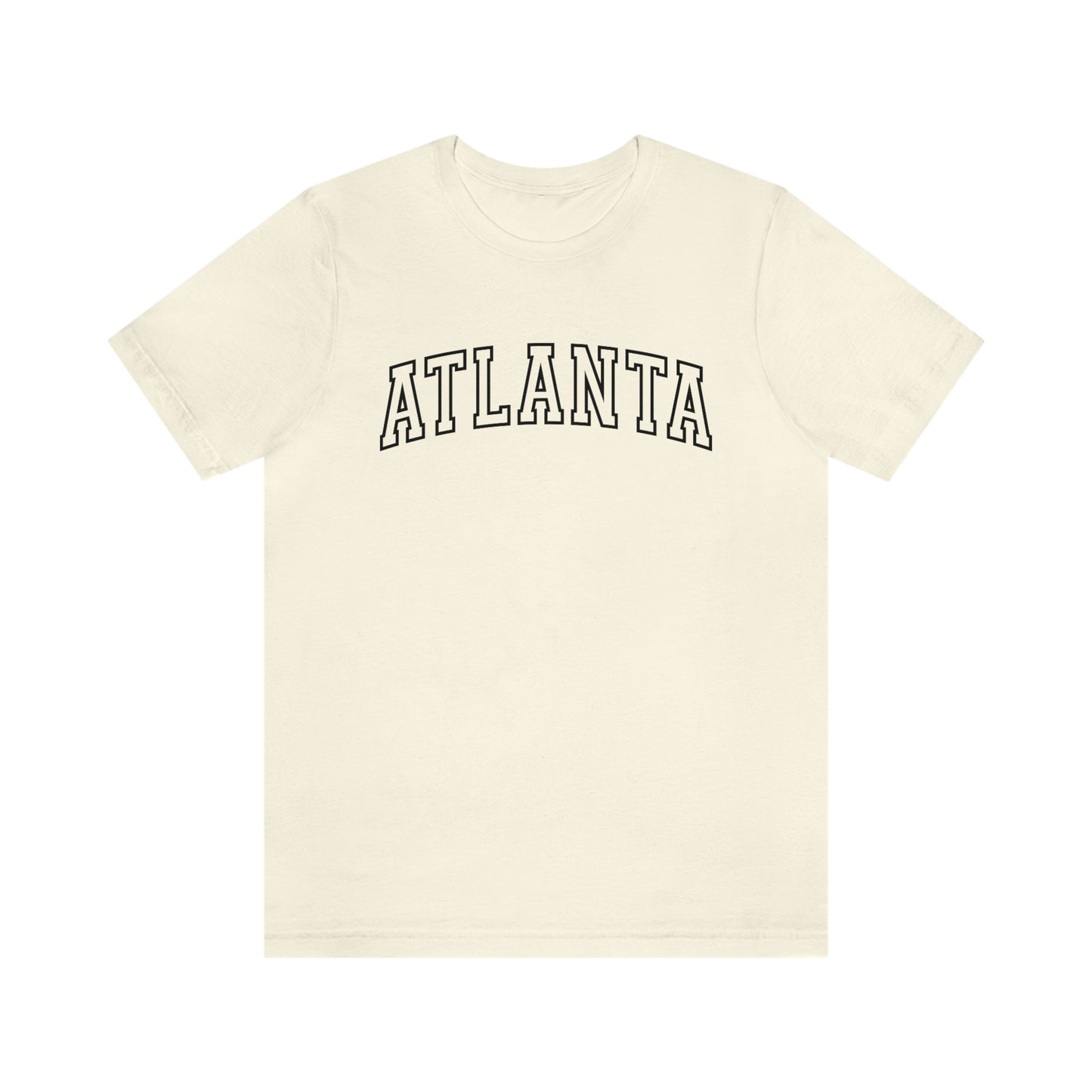 Show off your love and pride in Atlanta with this classic unisex short sleeve t-shirt showing Atlanta written in varsity letters in an arch shape. This tee fits like a well-loved favorite. Soft cotton and quality print make you fall in love with it over and over again. These t-shirts have ribbed knit collars to bolster shaping. The shoulders have taping for better fit over time. Dual side seams hold the garment's shape for longer.