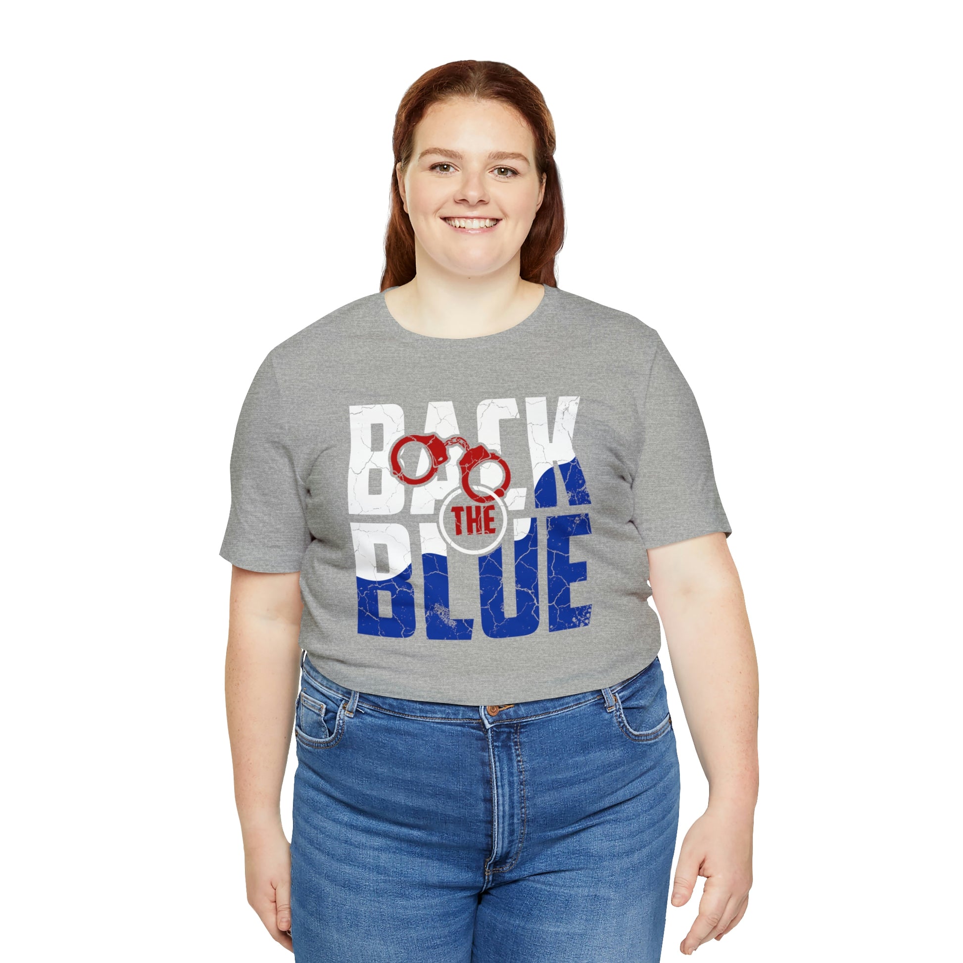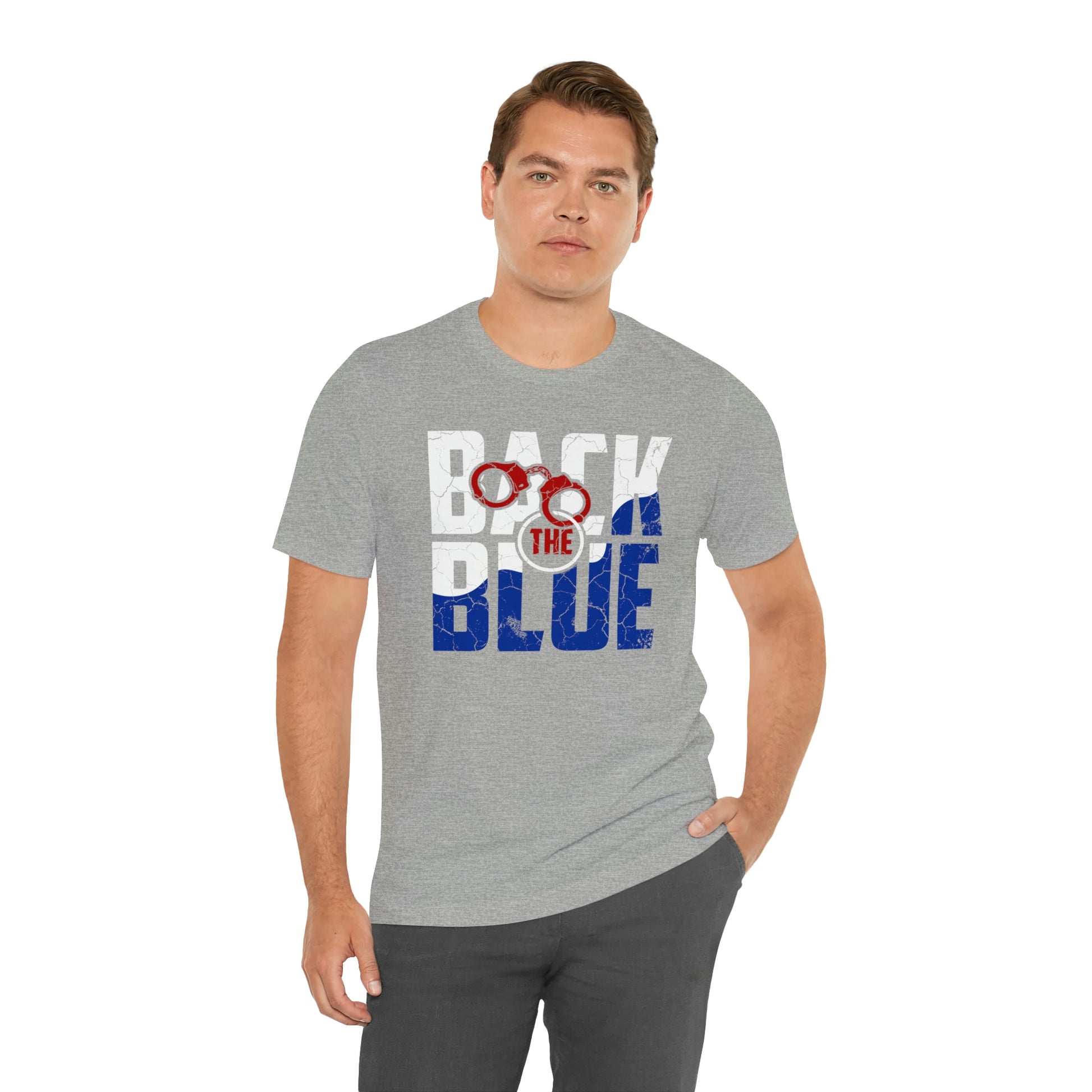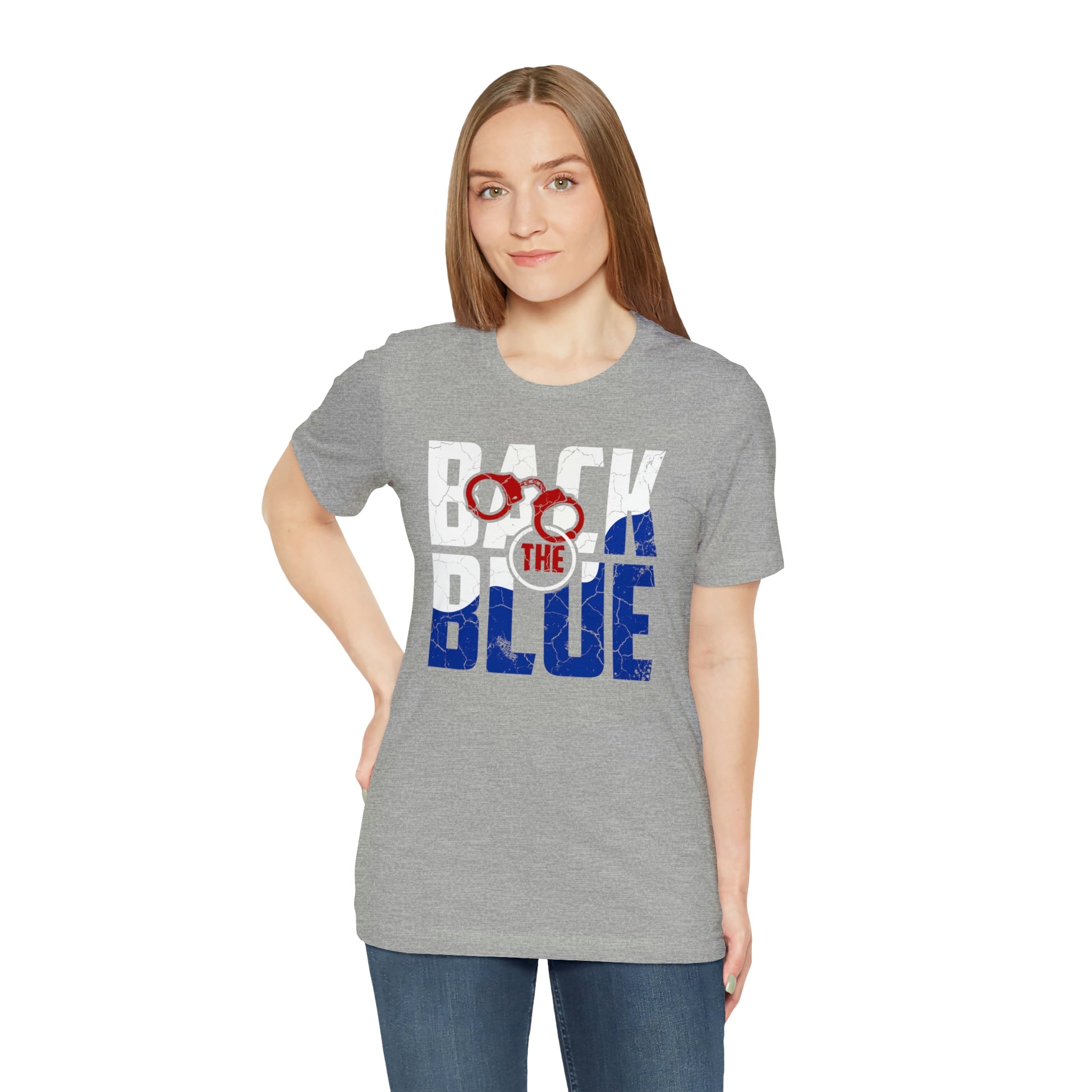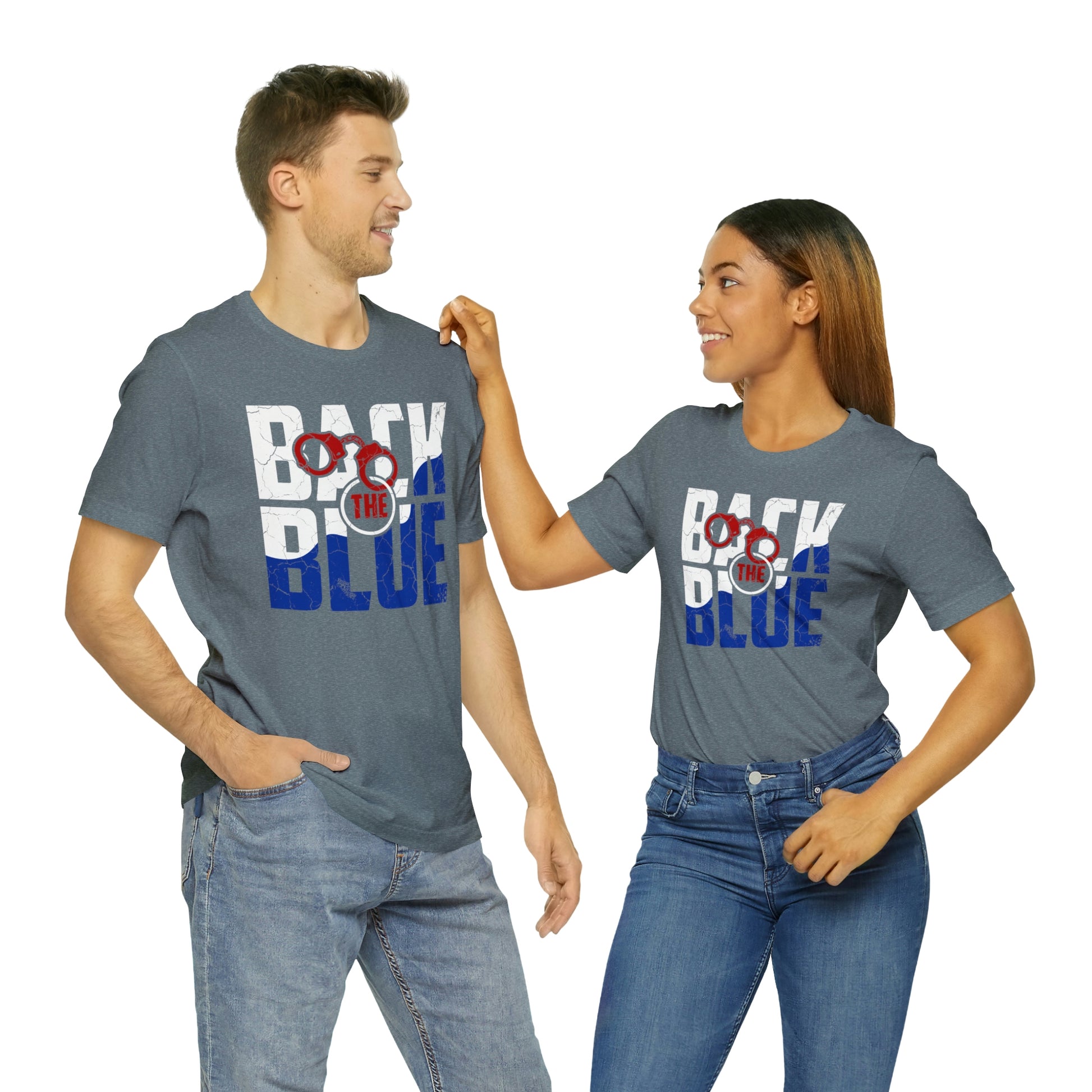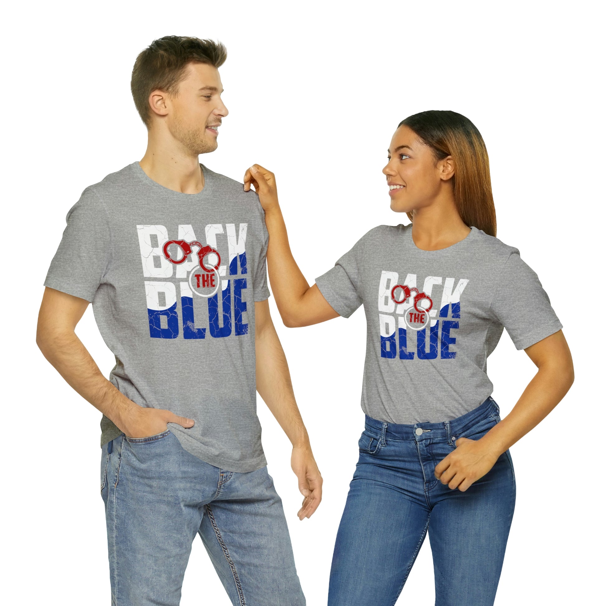 This classic unisex short sleeve t-shirt reads Back the Blue with a handcuff design. This tee fits like a well-loved favorite. Soft cotton and quality print make you fall in love with it over and over again. These t-shirts have ribbed knit collars to bolster shaping. The shoulders have taping for better fit over time. Dual side seams hold the garment's shape for longer.