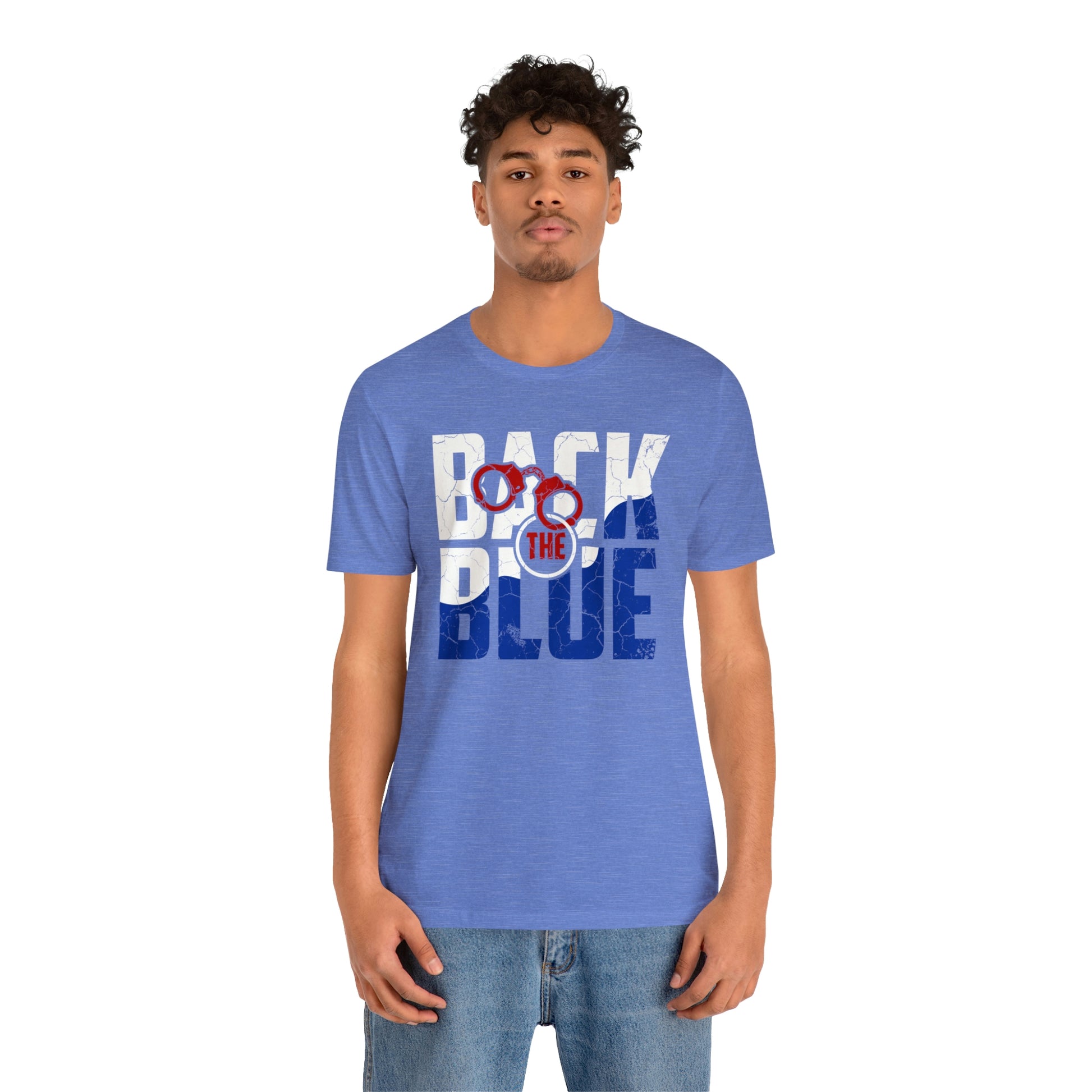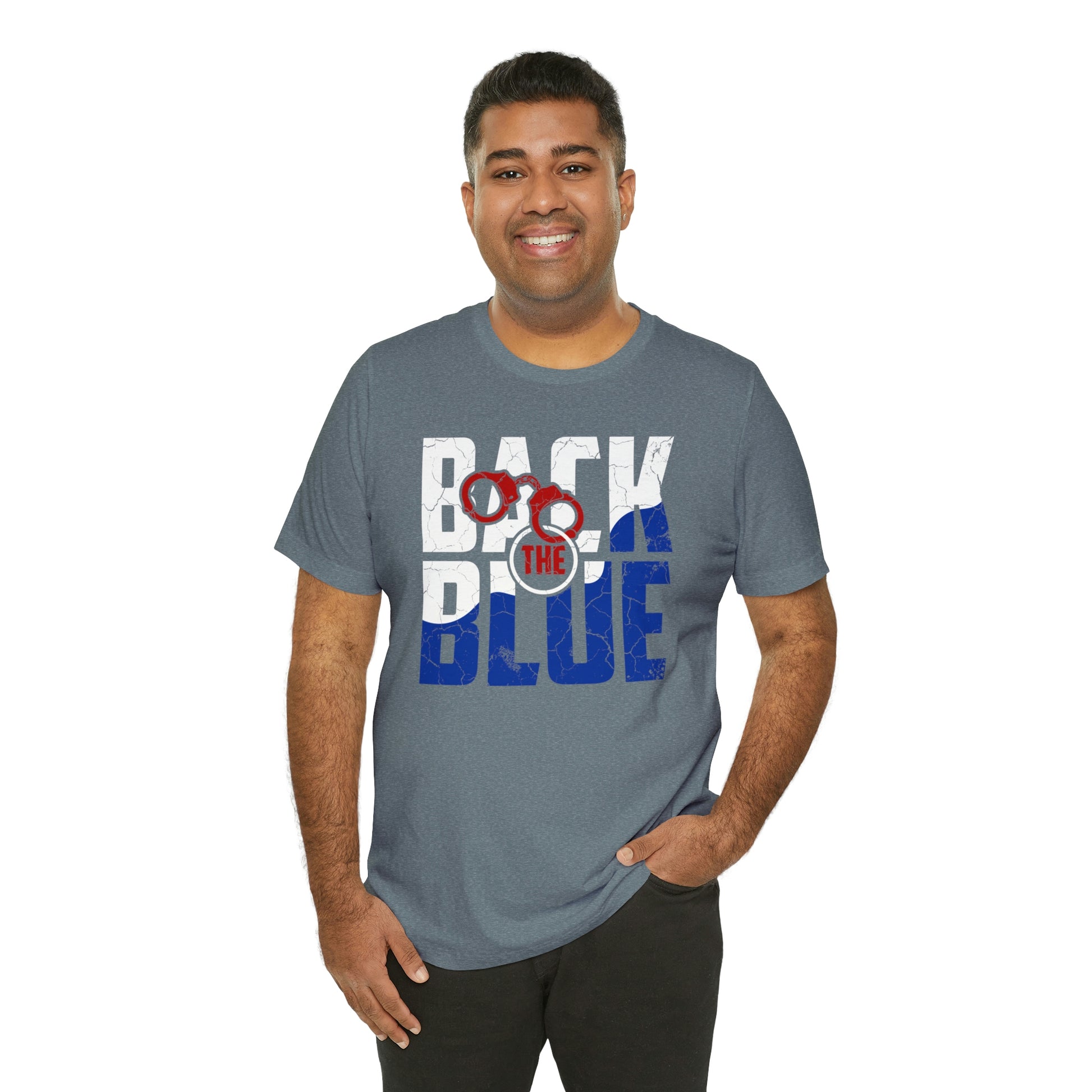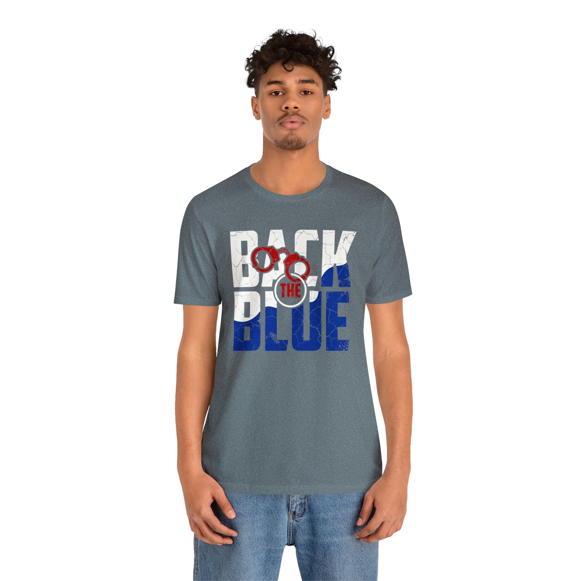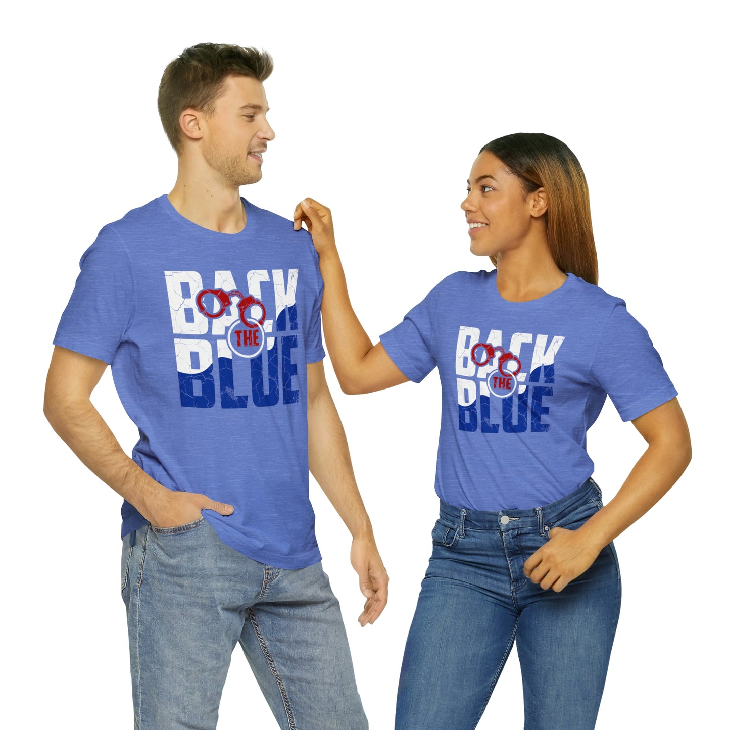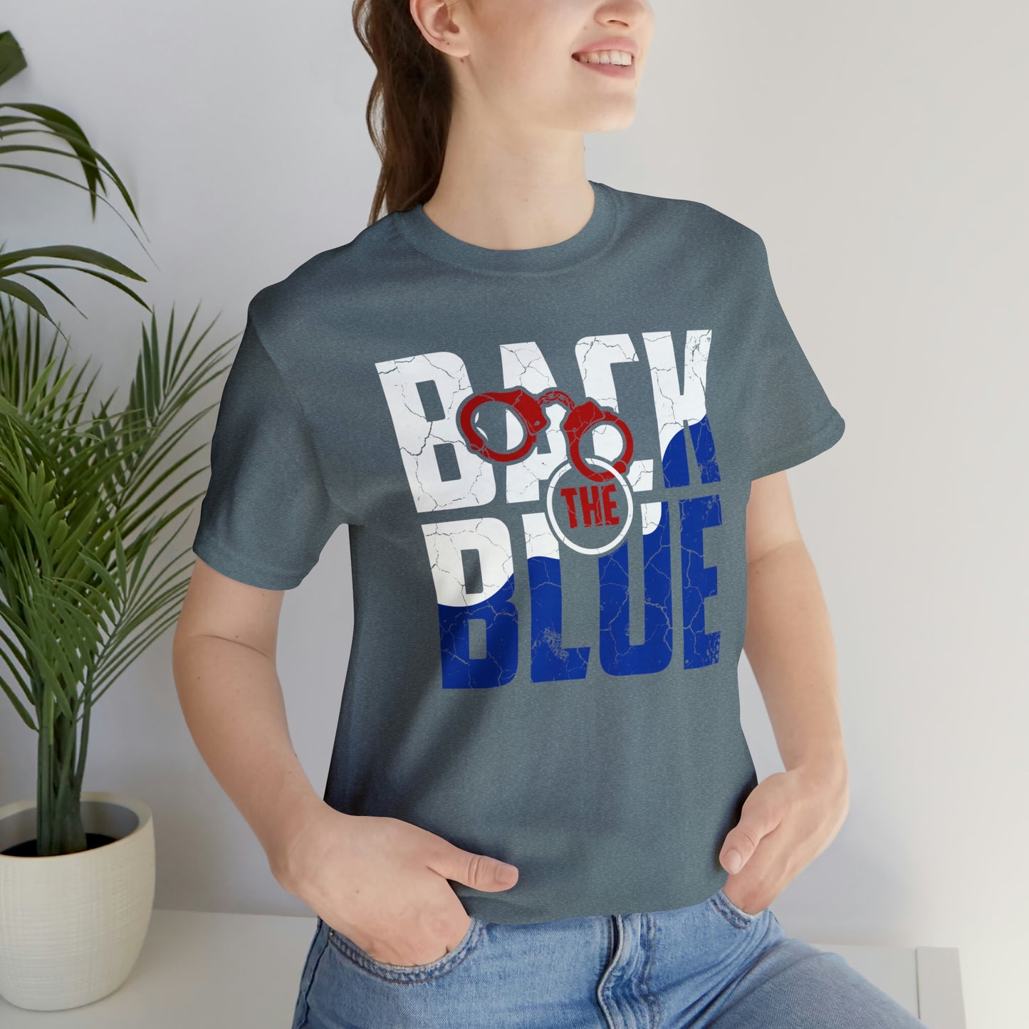 This classic unisex short sleeve t-shirt reads Back the Blue with a handcuff design. This tee fits like a well-loved favorite. Soft cotton and quality print make you fall in love with it over and over again. These t-shirts have ribbed knit collars to bolster shaping. The shoulders have taping for better fit over time. Dual side seams hold the garment's shape for longer.