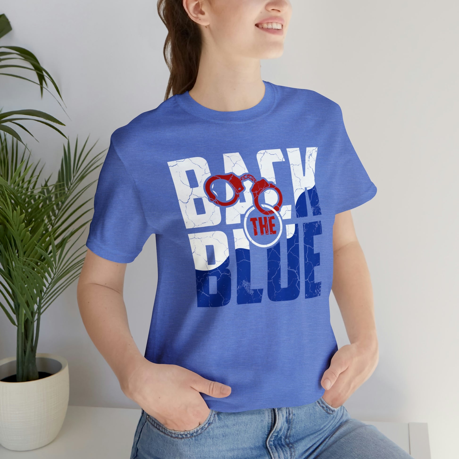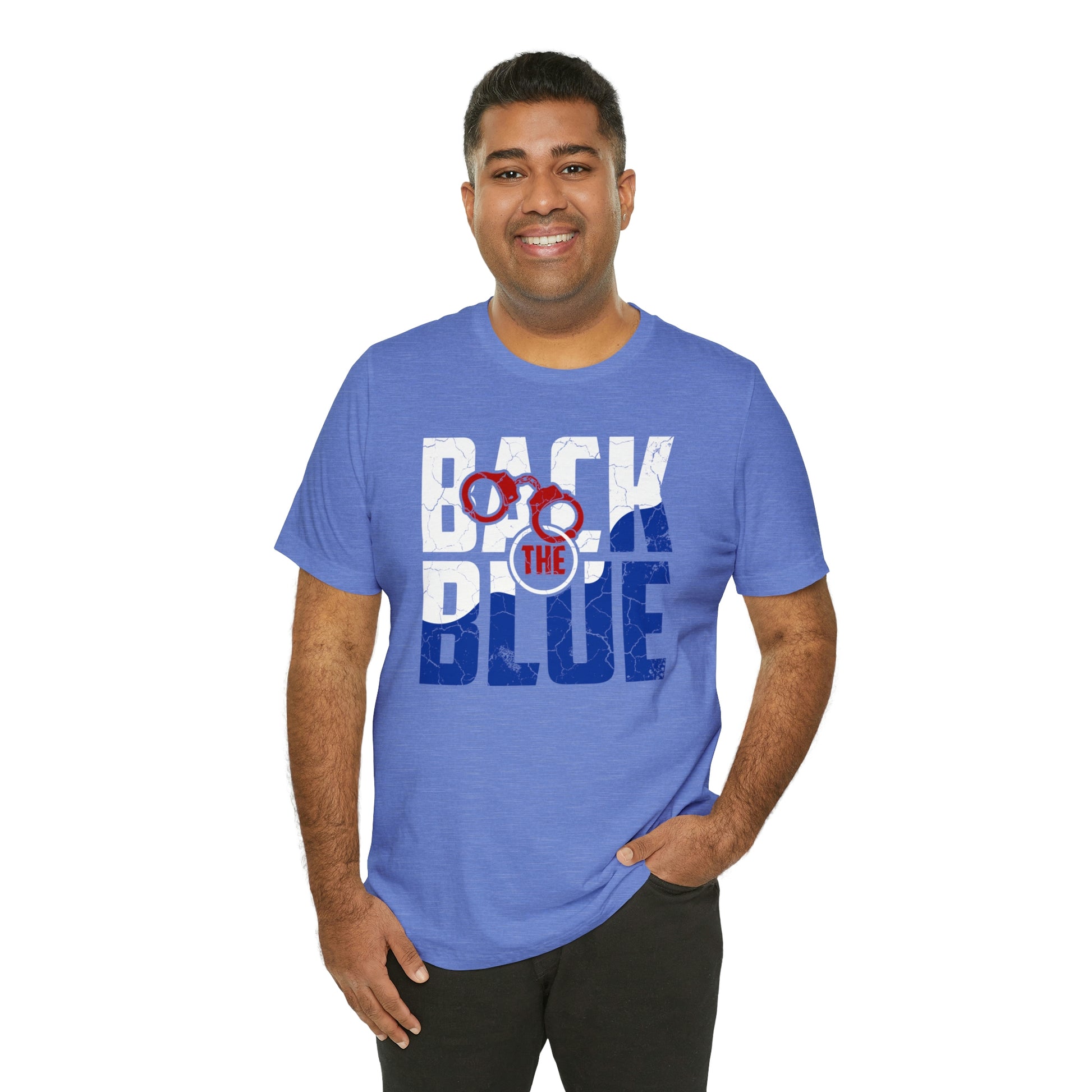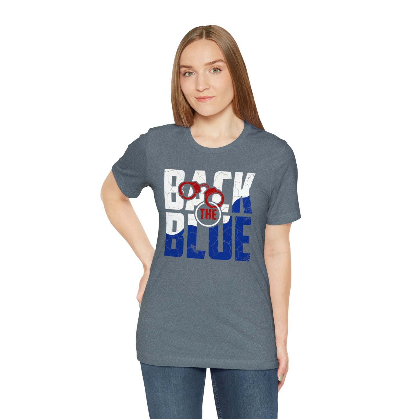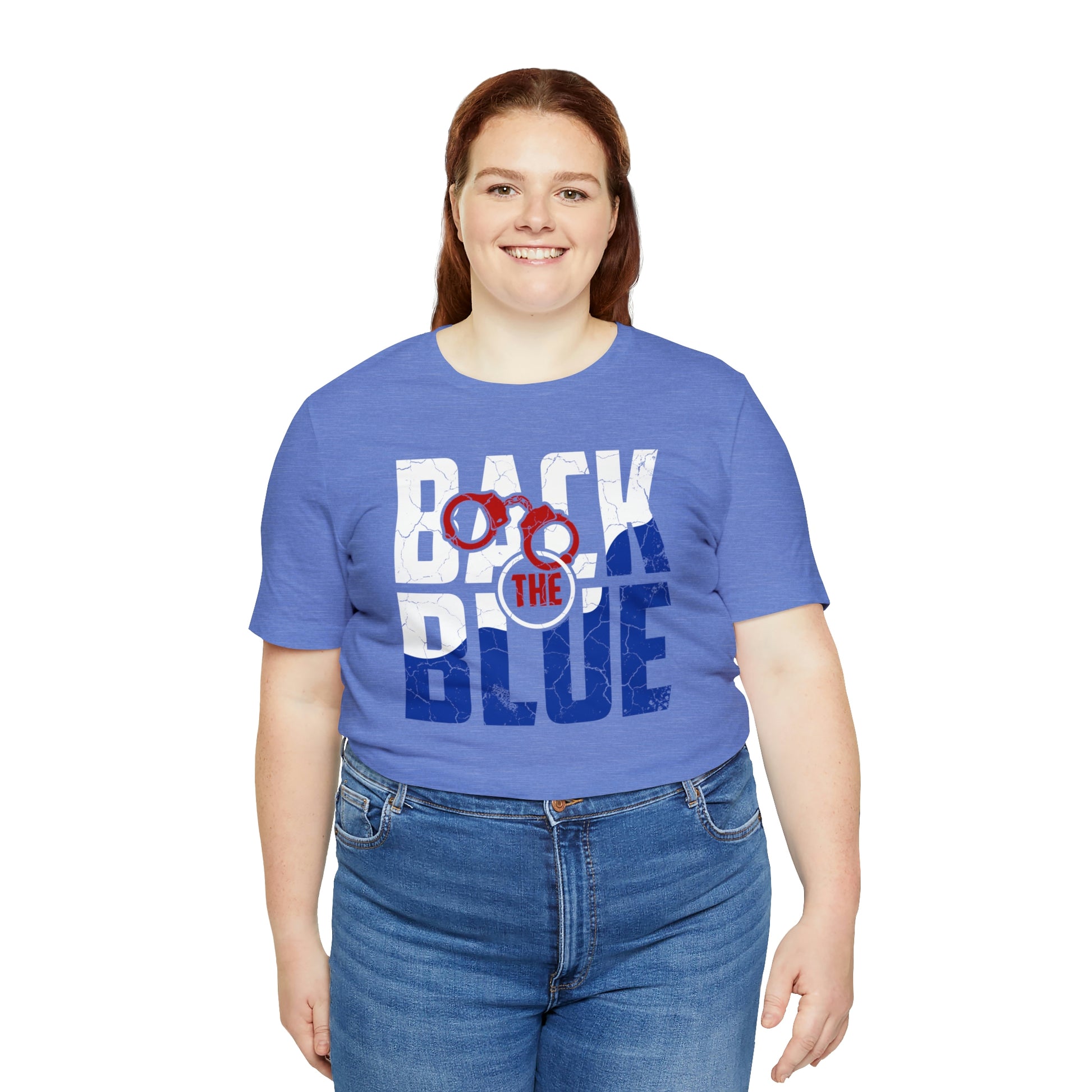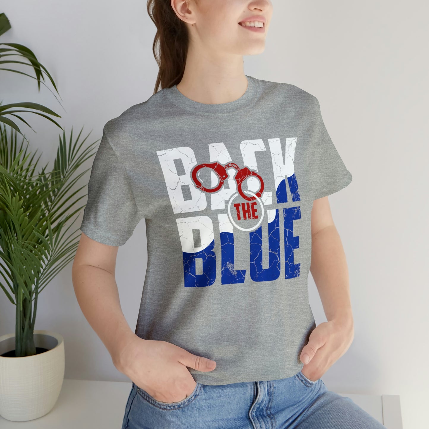 This classic unisex short sleeve t-shirt reads Back the Blue with a handcuff design. This tee fits like a well-loved favorite. Soft cotton and quality print make you fall in love with it over and over again. These t-shirts have ribbed knit collars to bolster shaping. The shoulders have taping for better fit over time. Dual side seams hold the garment's shape for longer.