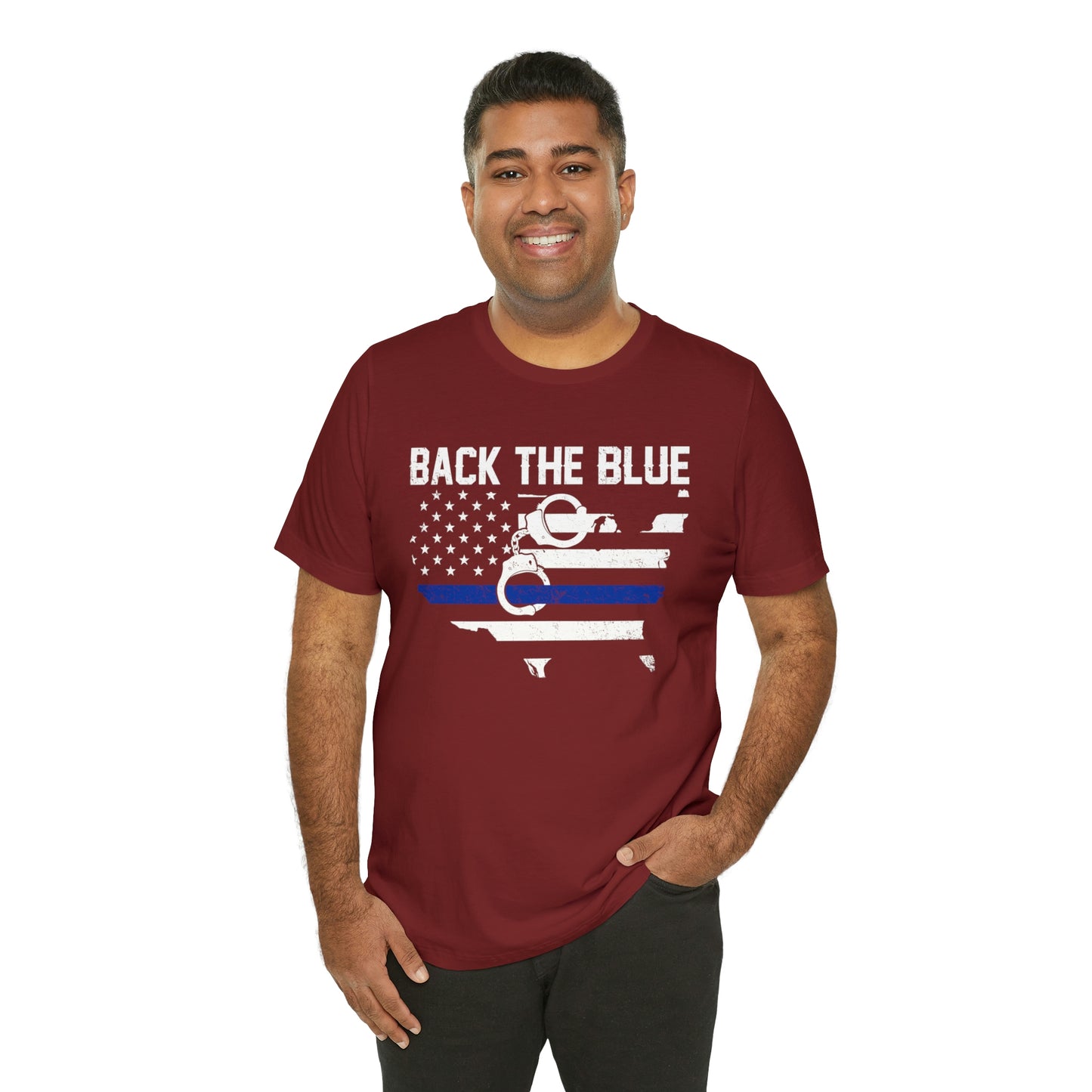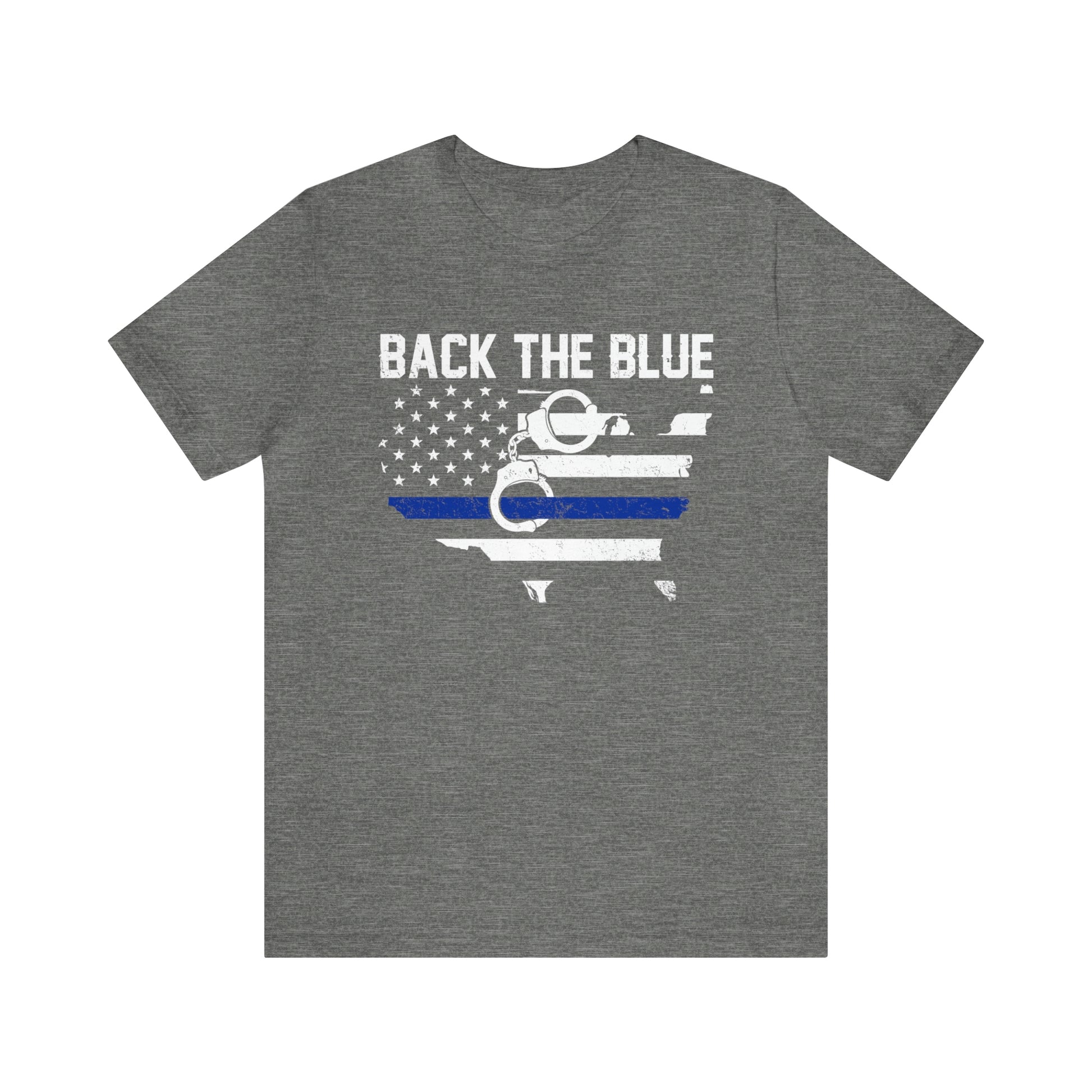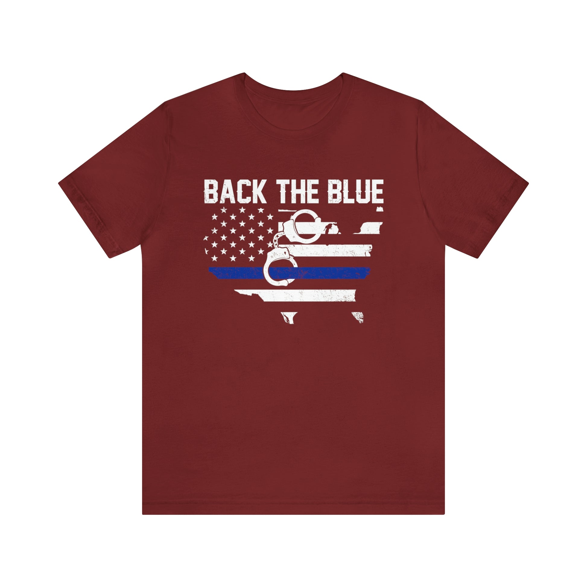 This classic unisex short sleeve t-shirt reads Back the Blue with a U.S. map and flag design. This tee fits like a well-loved favorite. Soft cotton and quality print make you fall in love with it over and over again. These t-shirts have ribbed knit collars to bolster shaping. The shoulders have taping for better fit over time. Dual side seams hold the garment's shape for longer.