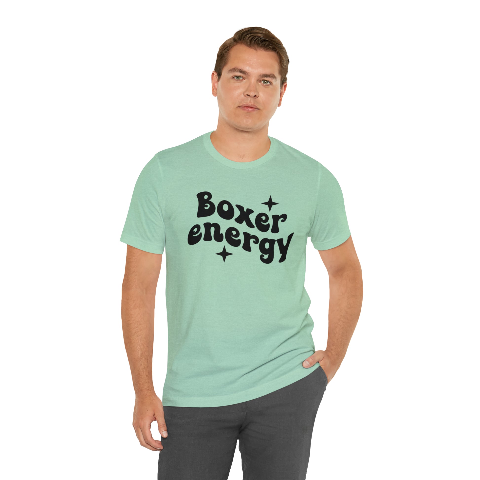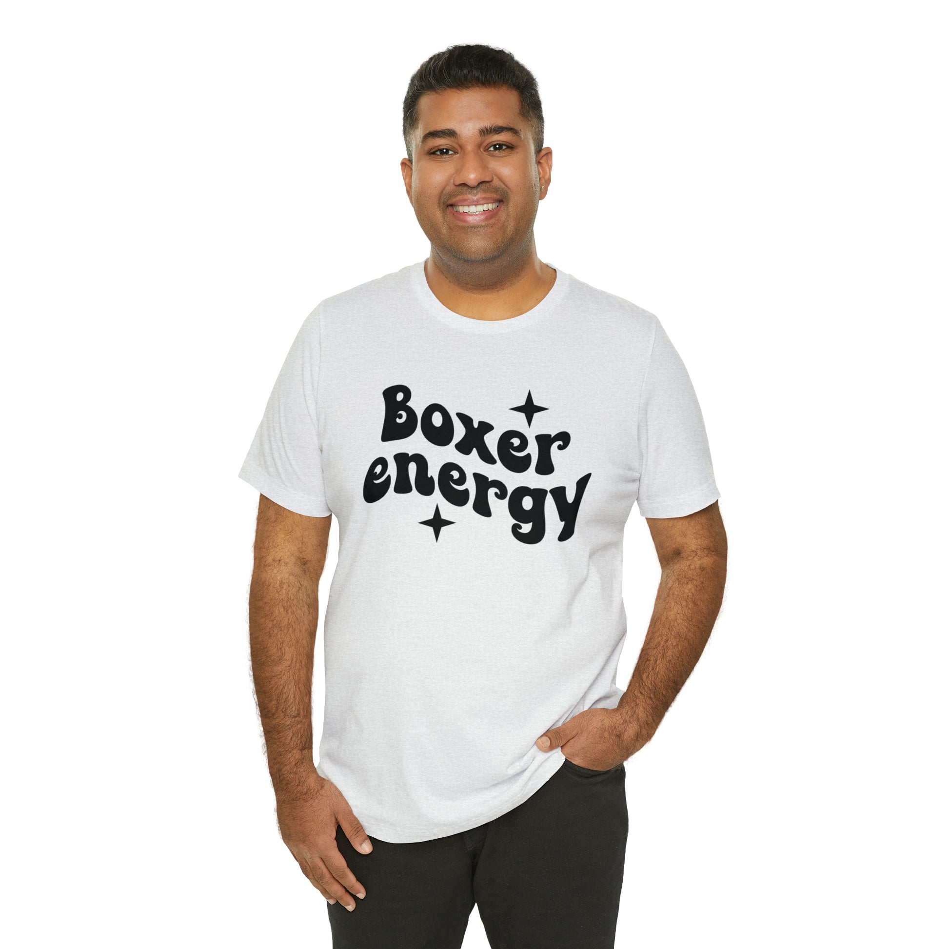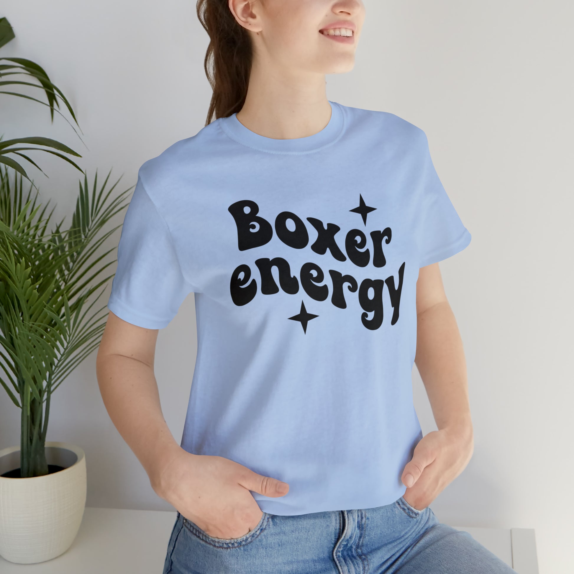This classic unisex short sleeve dog t-shirt reads Boxer Energy. This tee fits like a well-loved favorite. Soft cotton and quality print make you fall in love with it over and over again. These t-shirts have ribbed knit collars to bolster shaping. The shoulders have taping for better fit over time. Dual side seams hold the garment's shape for longer.