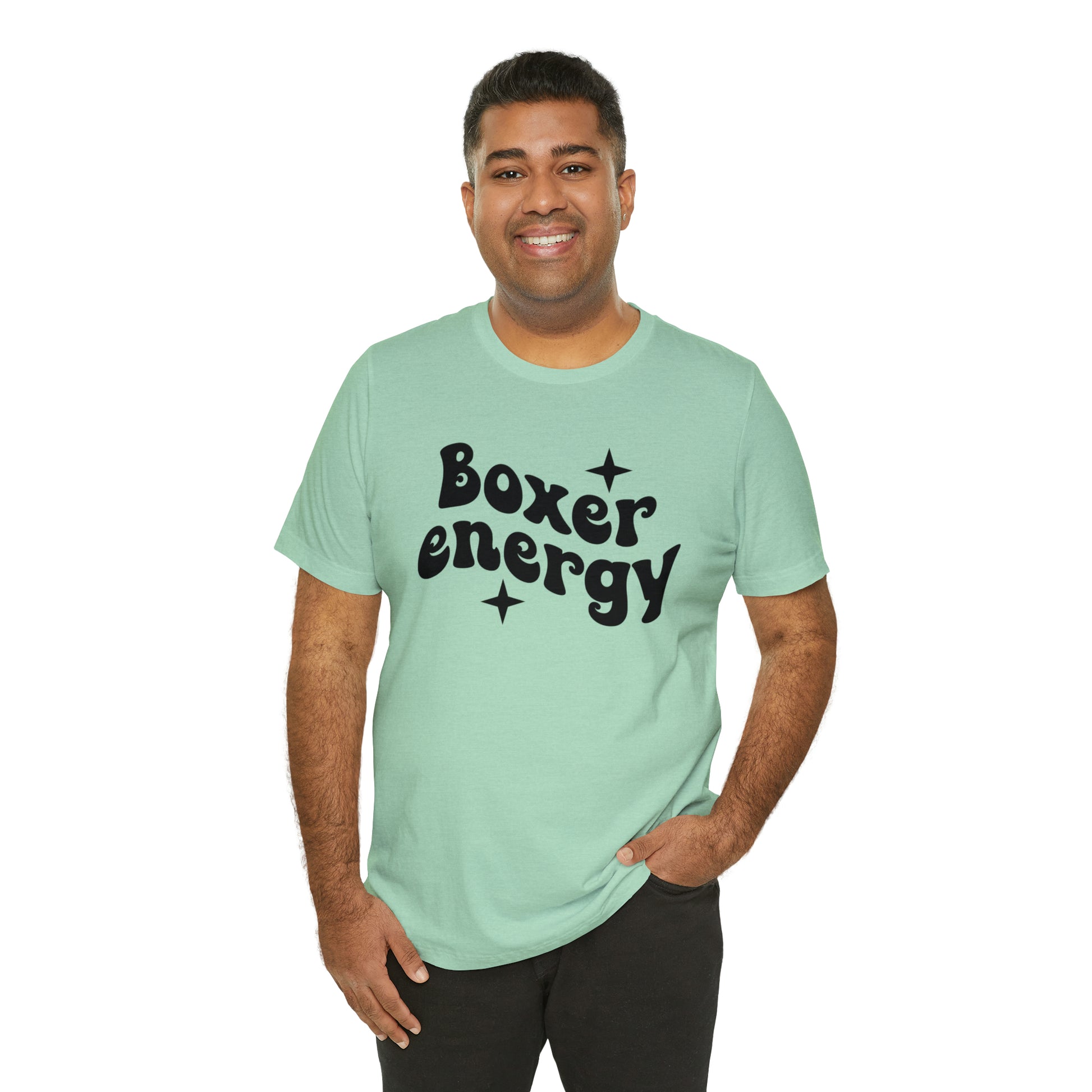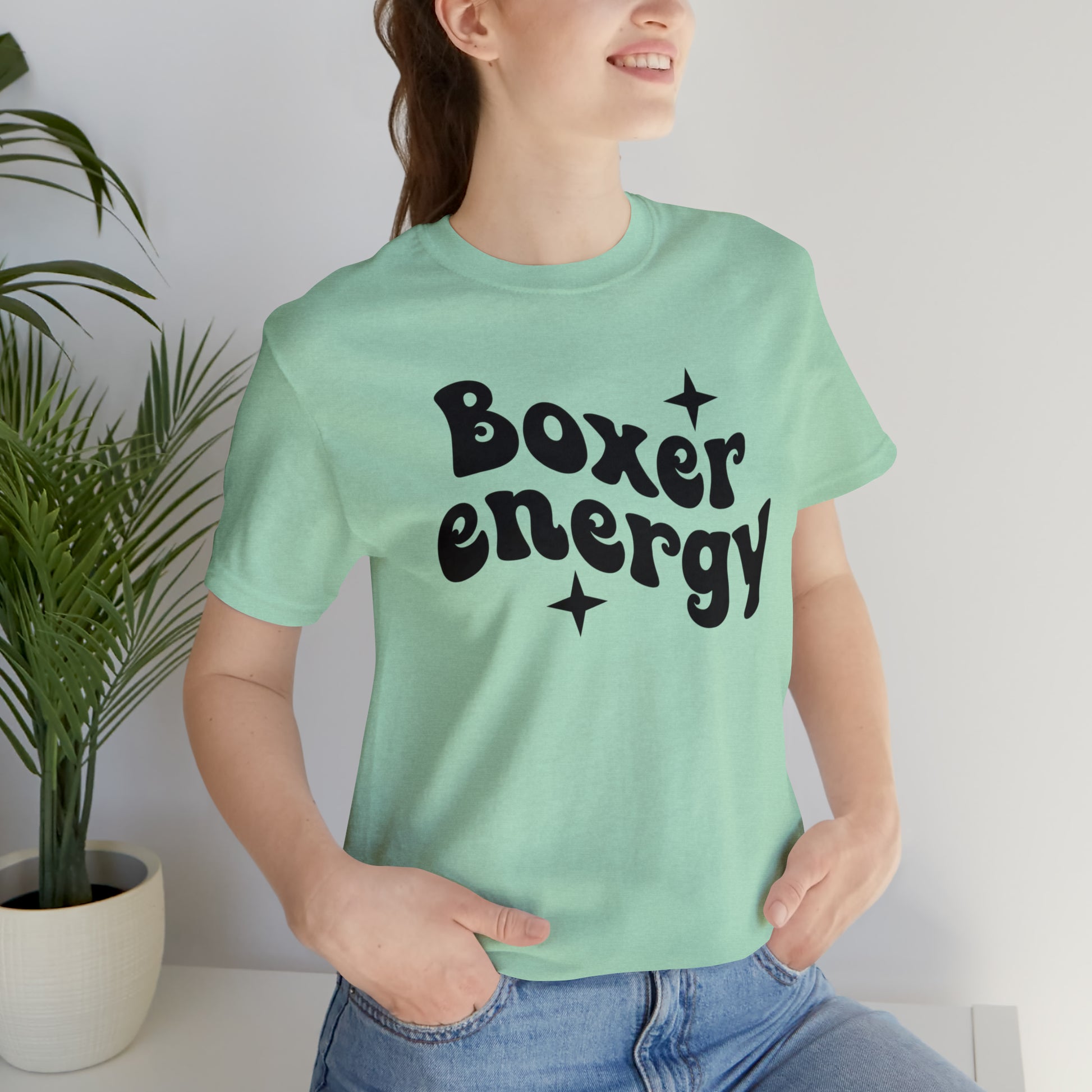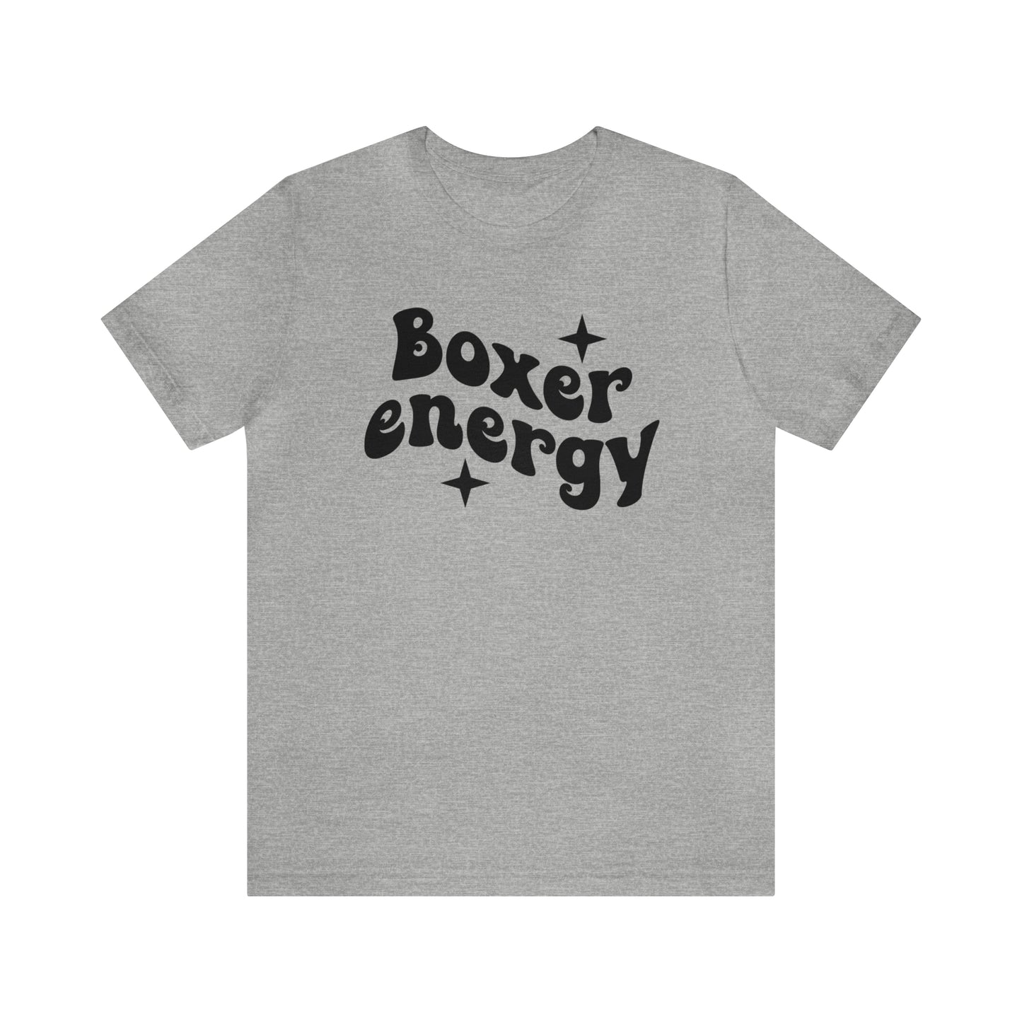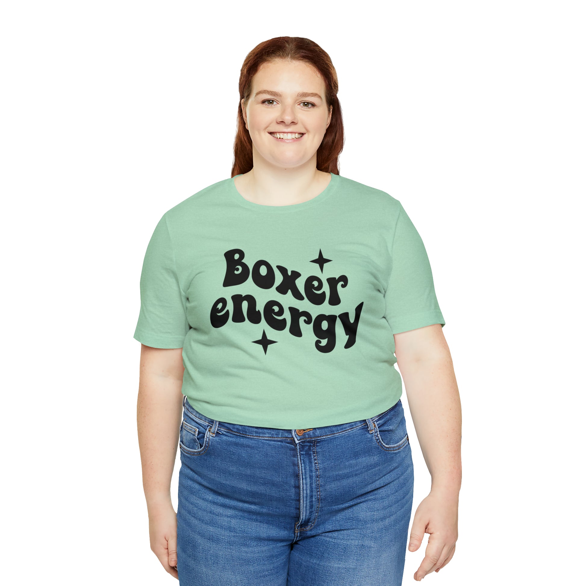 This classic unisex short sleeve dog t-shirt reads Boxer Energy. This tee fits like a well-loved favorite. Soft cotton and quality print make you fall in love with it over and over again. These t-shirts have ribbed knit collars to bolster shaping. The shoulders have taping for better fit over time. Dual side seams hold the garment's shape for longer.