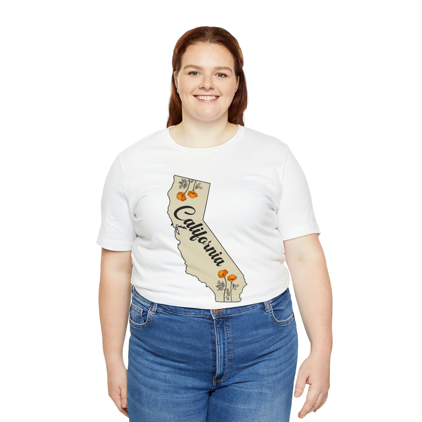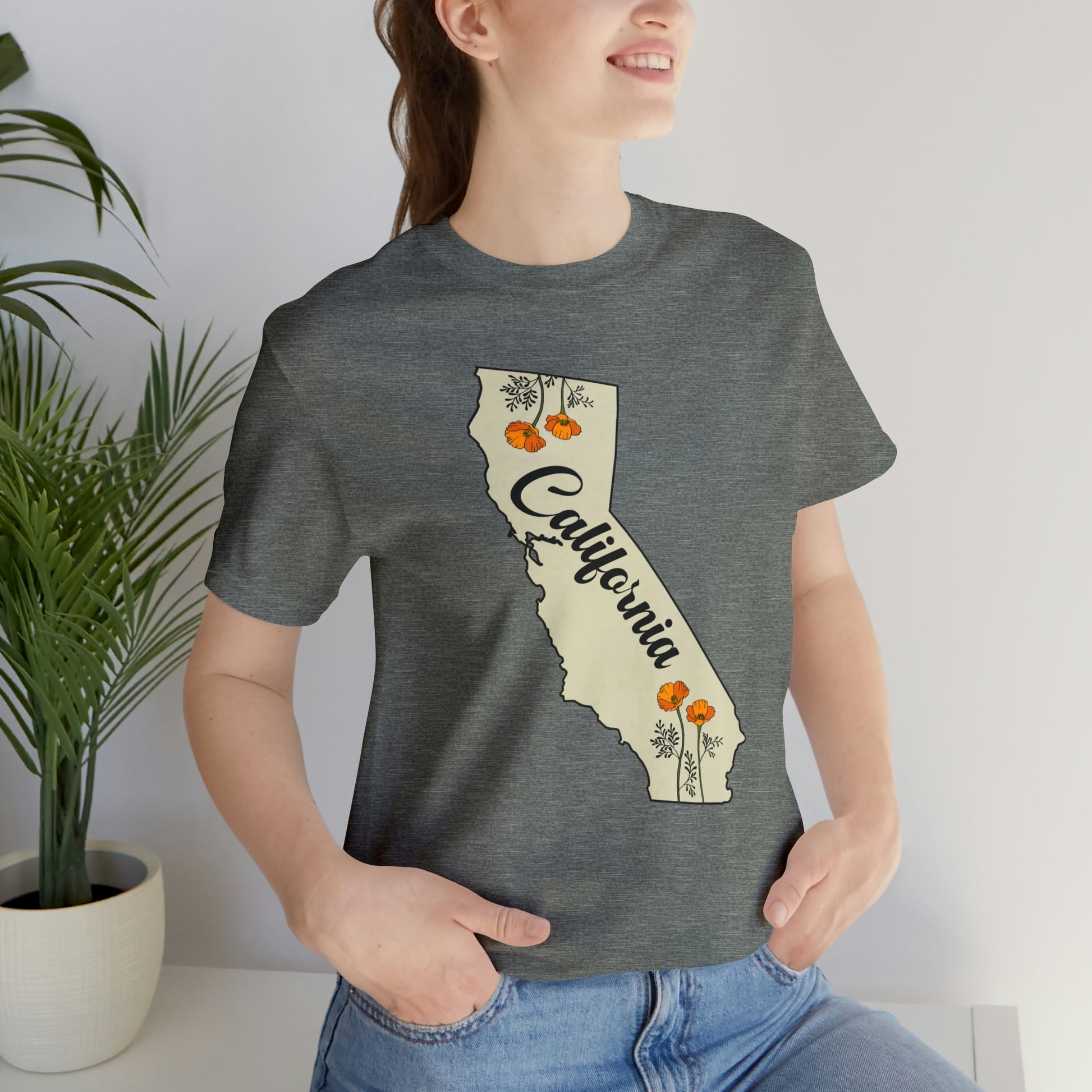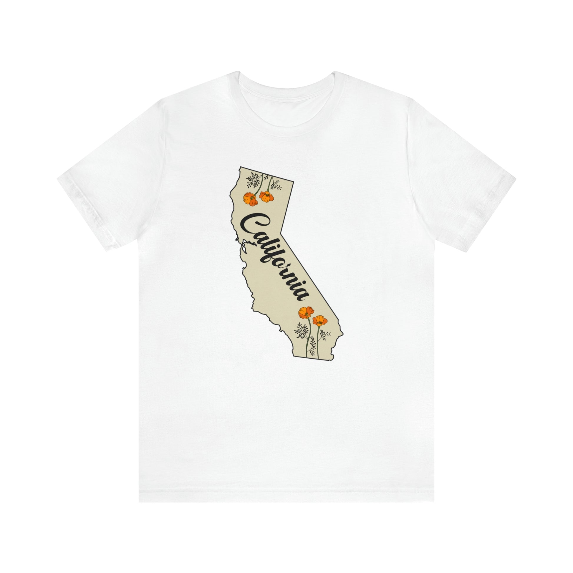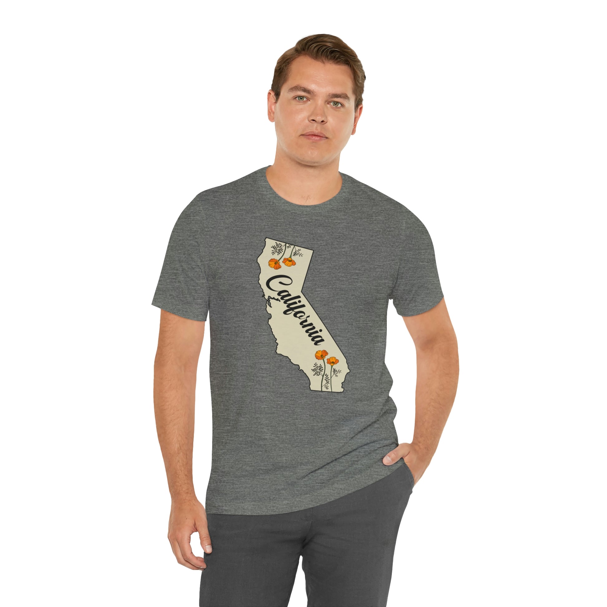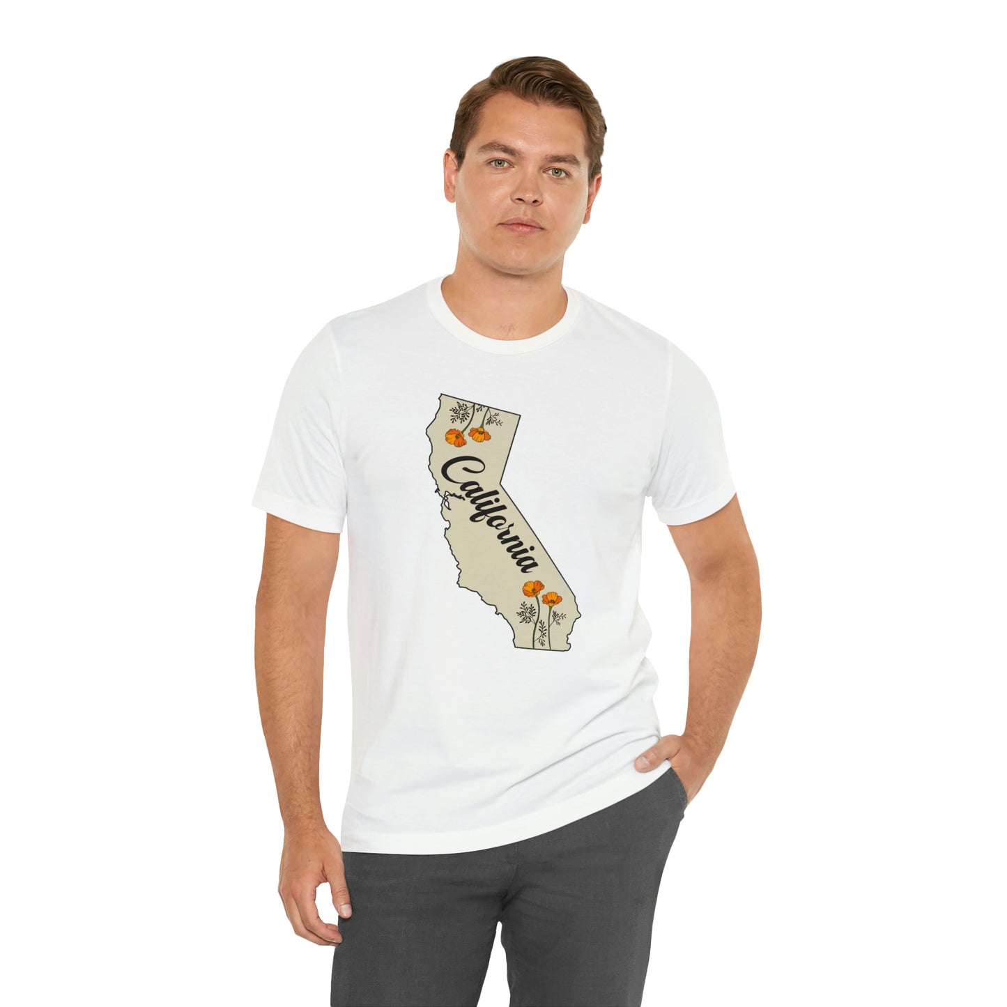 Show off your love and pride in California with this classic unisex short sleeve t-shirt showing California with a california poppy flower on it. This tee fits like a well-loved favorite. Soft cotton and quality print make you fall in love with it over and over again. These t-shirts have ribbed knit collars to bolster shaping. The shoulders have taping for better fit over time. Dual side seams hold the garment's shape for longer.