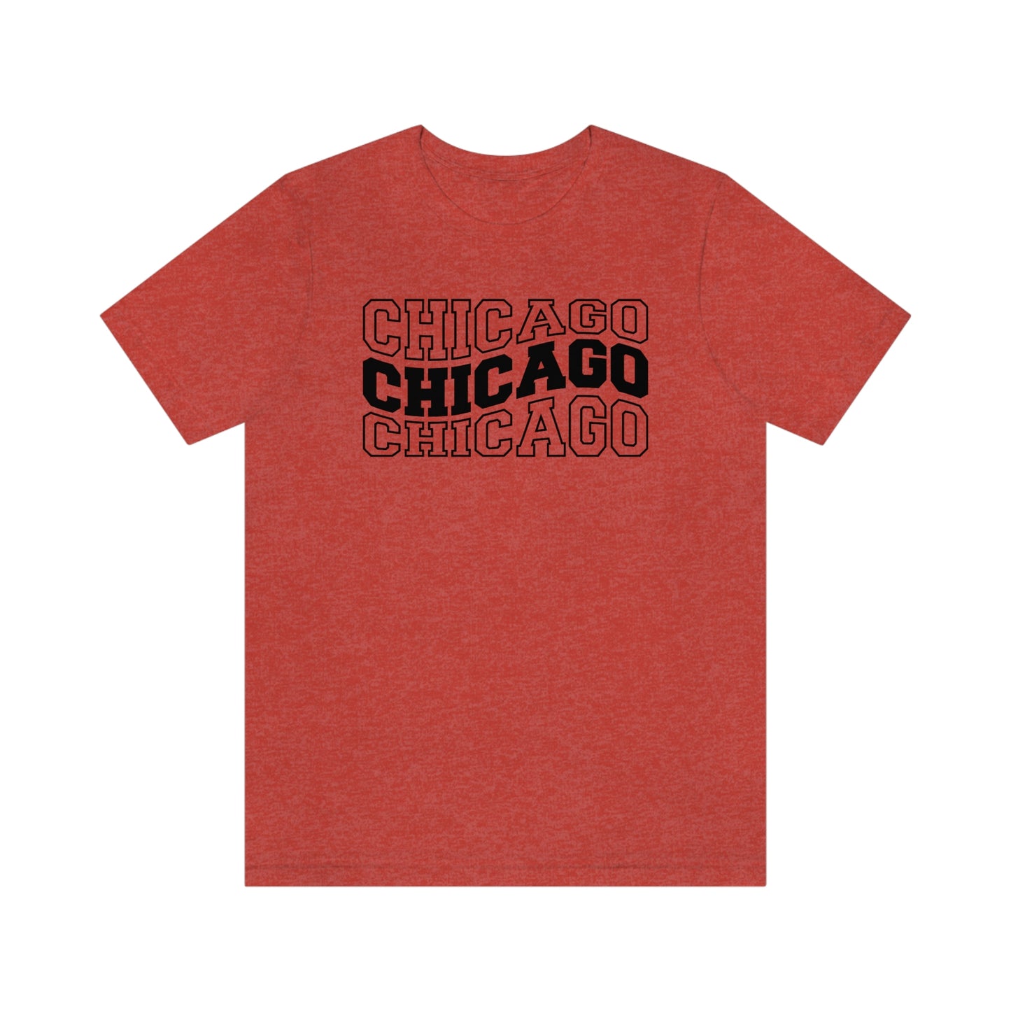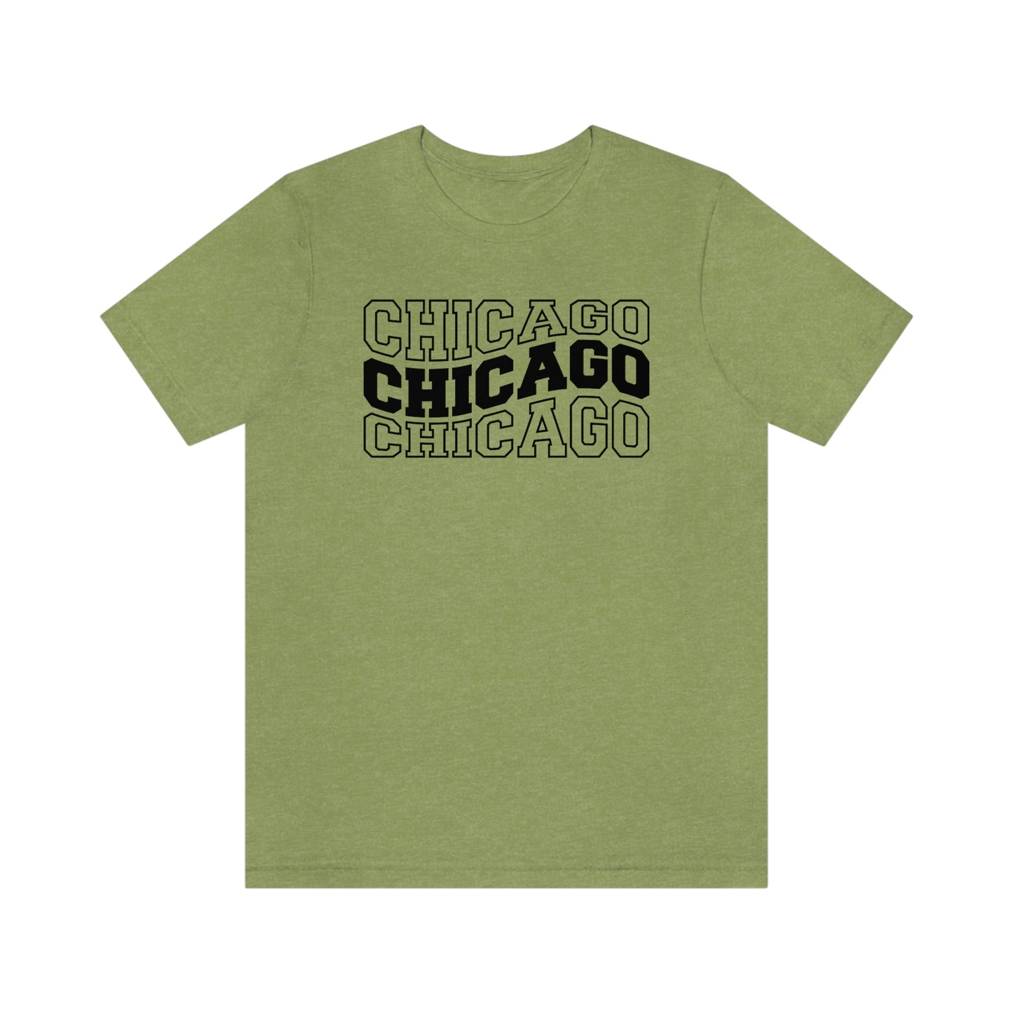 Show off your love and pride in Chicago with this classic unisex short sleeve t-shirt showing Chicago written in varsity letters in a triple wave design. This tee fits like a well-loved favorite. Soft cotton and quality print make you fall in love with it over and over again. These t-shirts have ribbed knit collars to bolster shaping. The shoulders have taping for better fit over time. Dual side seams hold the garment's shape for longer.