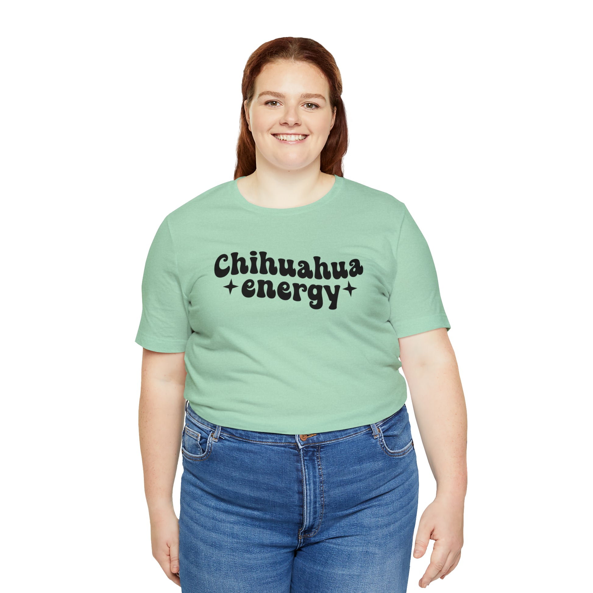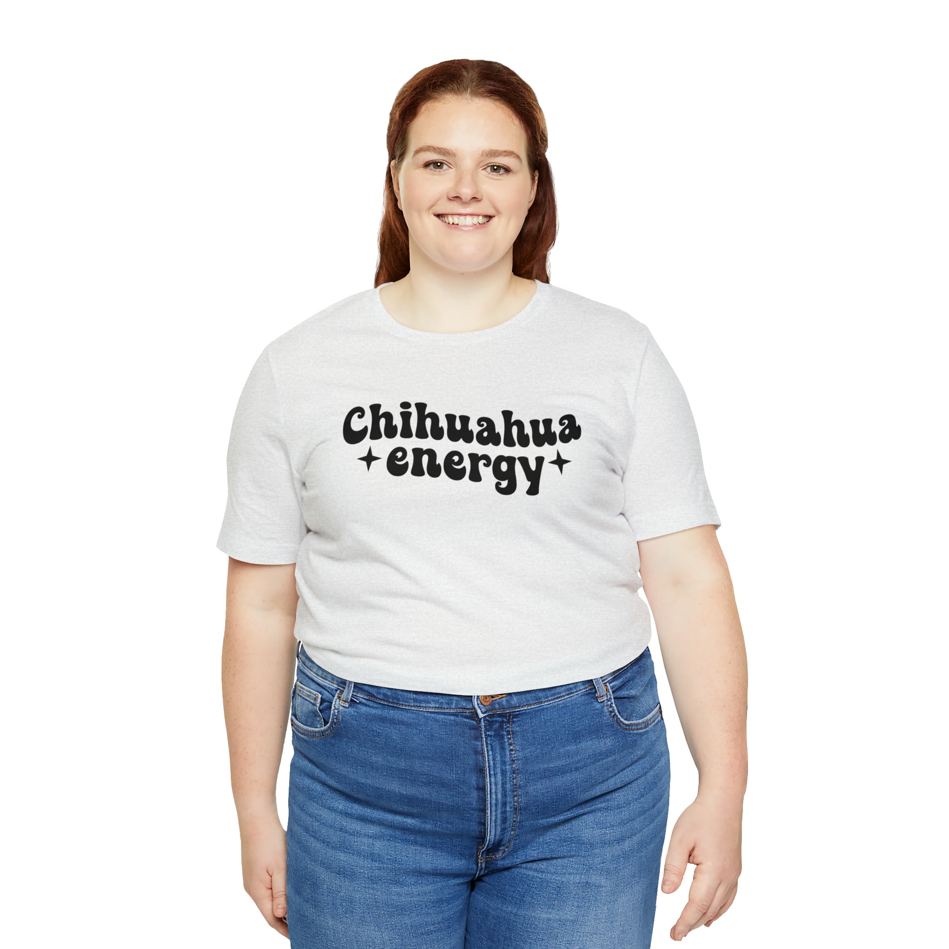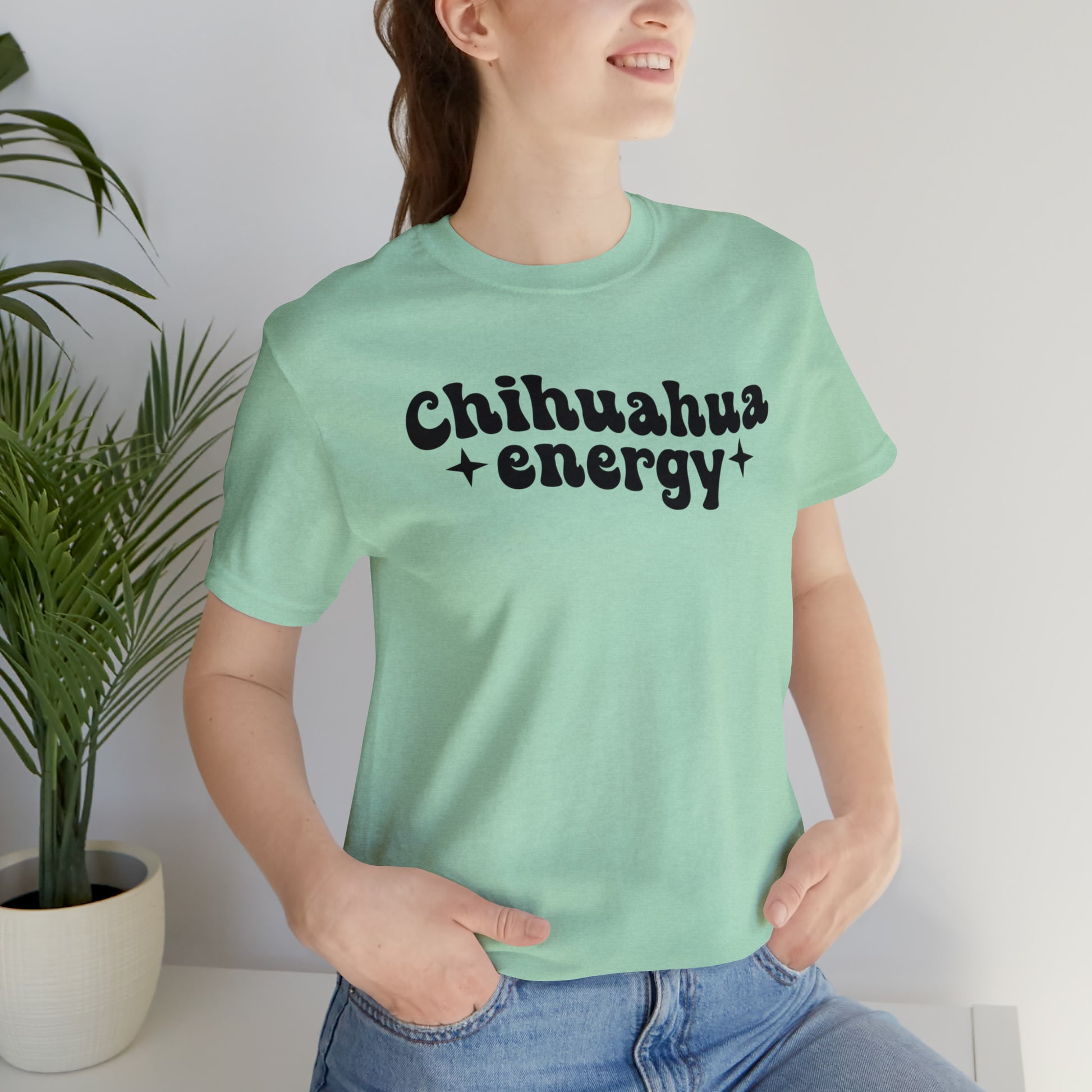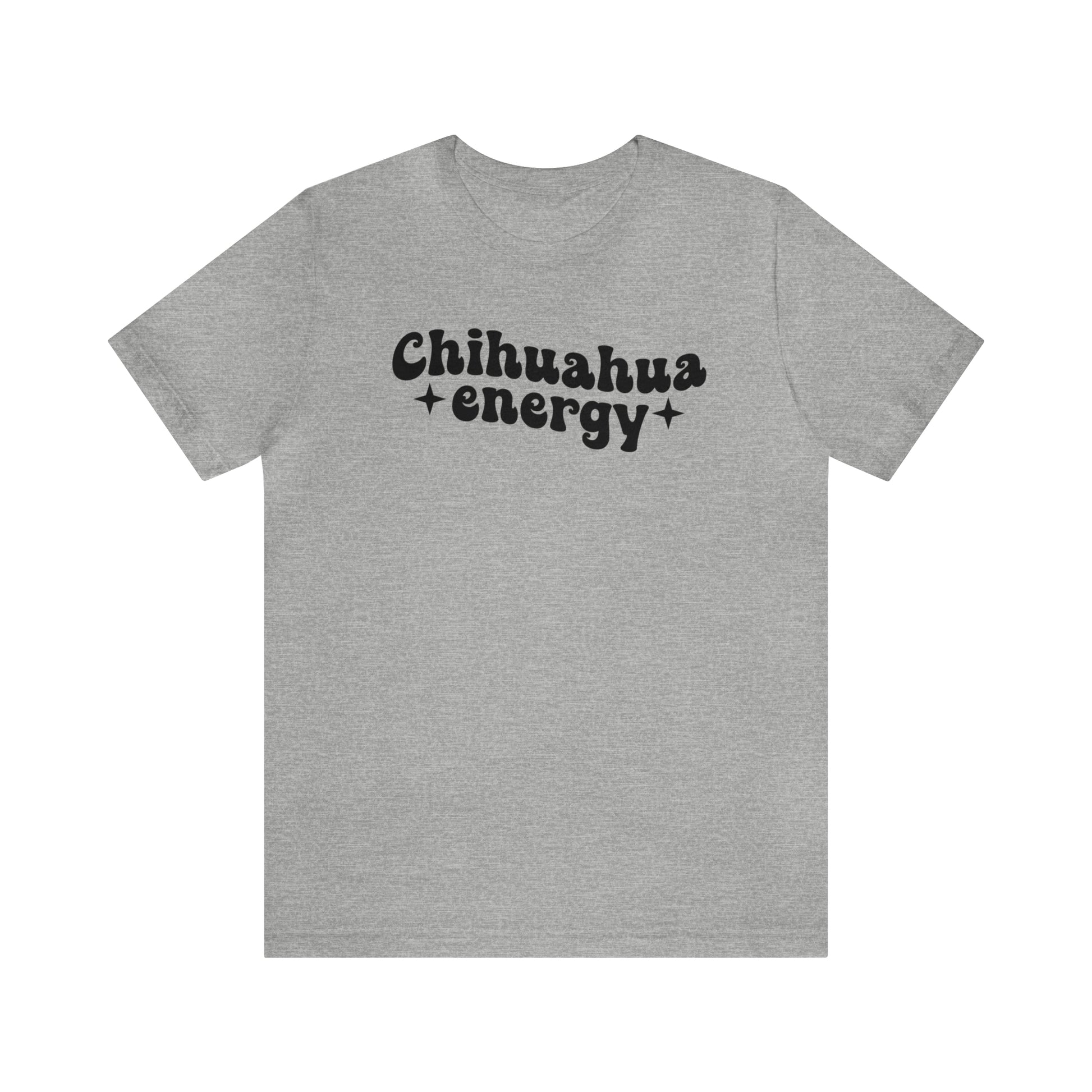 This classic unisex short sleeve dog t-shirt reads Chihuahua Energy. This tee fits like a well-loved favorite. Soft cotton and quality print make you fall in love with it over and over again. These t-shirts have ribbed knit collars to bolster shaping. The shoulders have taping for better fit over time. Dual side seams hold the garment's shape for longer.