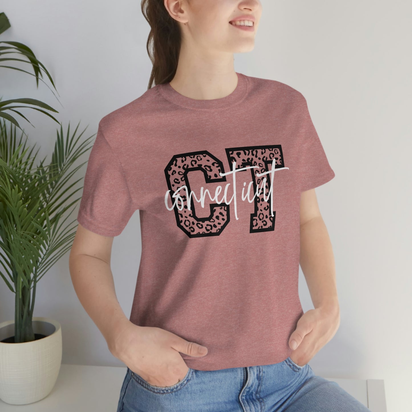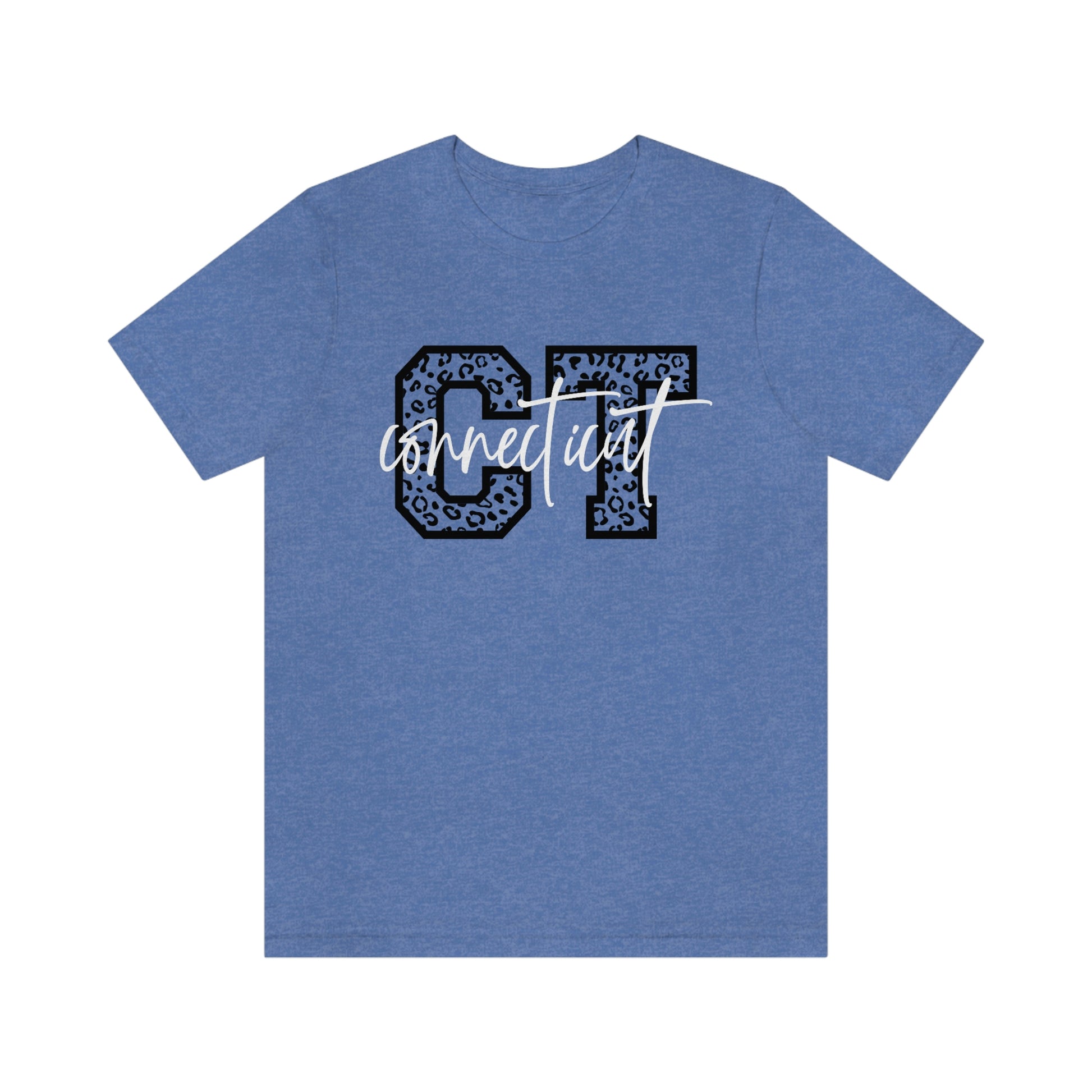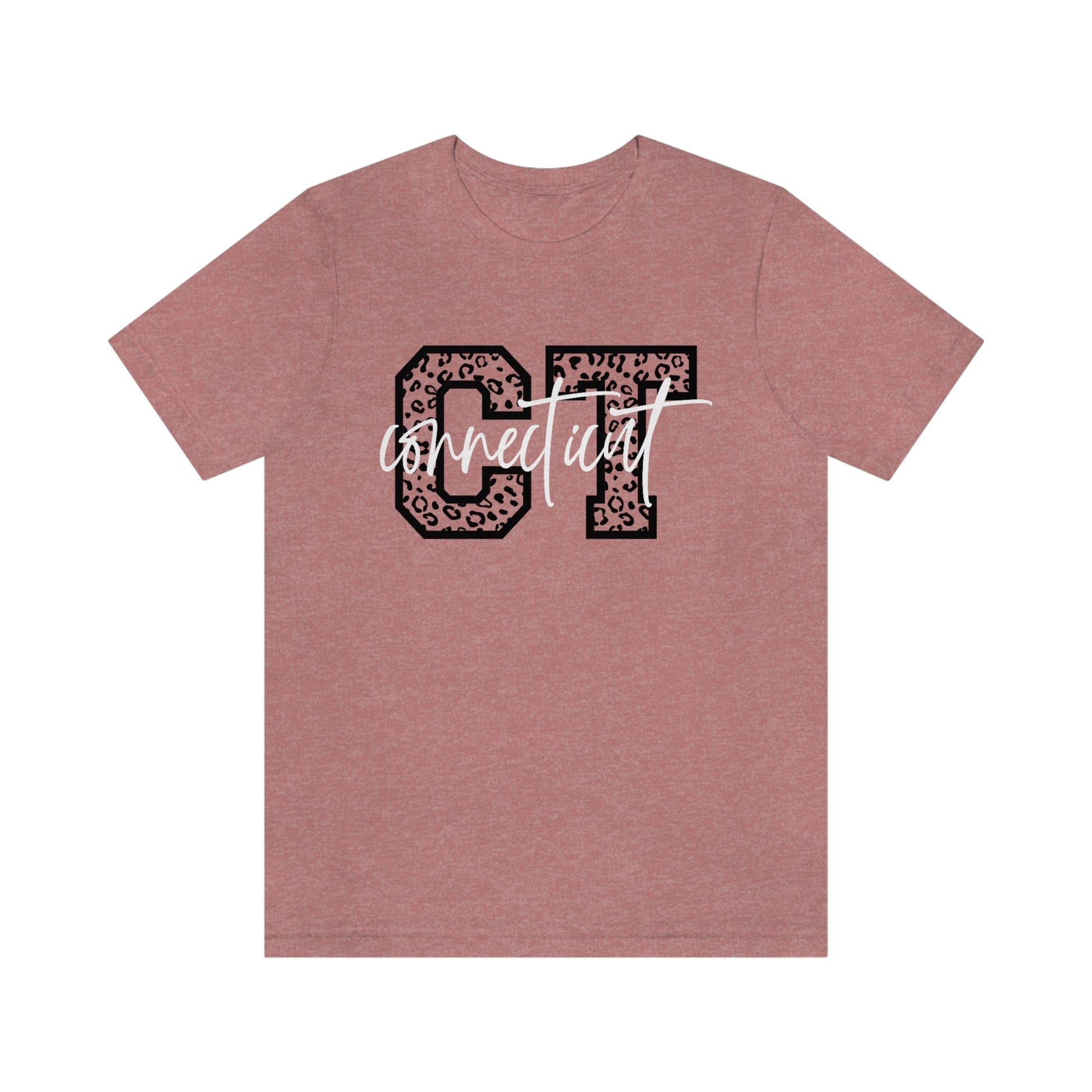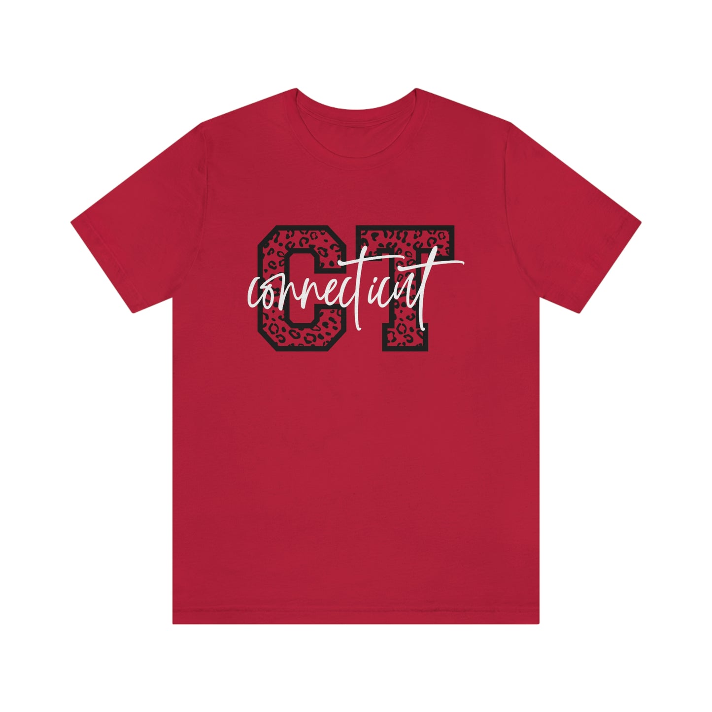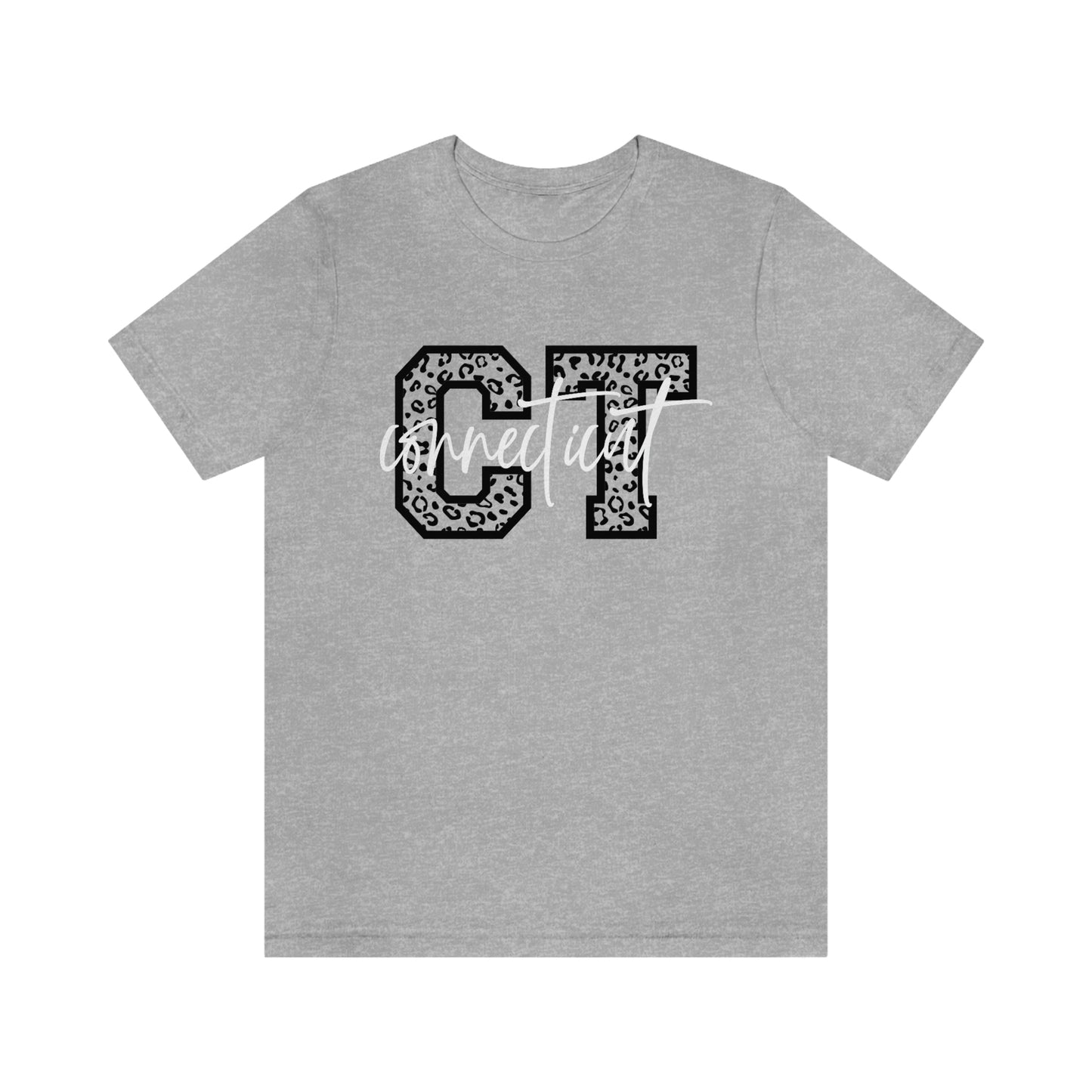 Show off your love and pride in Connecticut by wearing this classic unisex short sleeve tshirt featuring the letters CT in leopard print letters with Connecticut written in white script. This tee fits like a well-loved favorite. Soft cotton and quality print make users fall in love with it over and over again. These t-shirts have-ribbed knit collars to bolster shaping. The shoulders have taping for better fit over time. Dual side seams hold the garment's shape for longer.