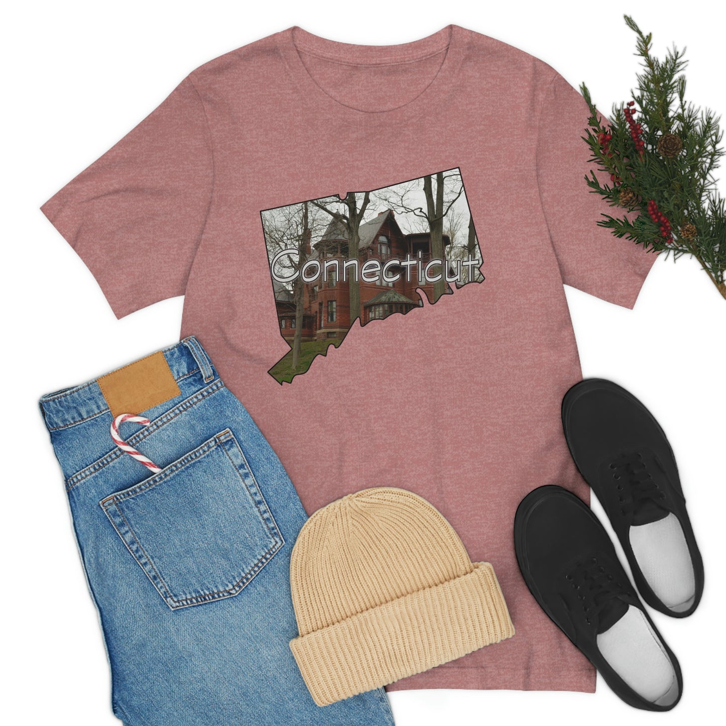Show off your love and pride in Connecticut with this state outline design featuring a photo of the Mark Twain house on this classic unisex short sleeve t-shirt. This tee fits like a well-loved favorite. Soft cotton and quality print make you fall in love with it over and over again. These t-shirts have ribbed knit collars to bolster shaping. The shoulders have taping for better fit over time. Dual side seams hold the garment's shape for longer.