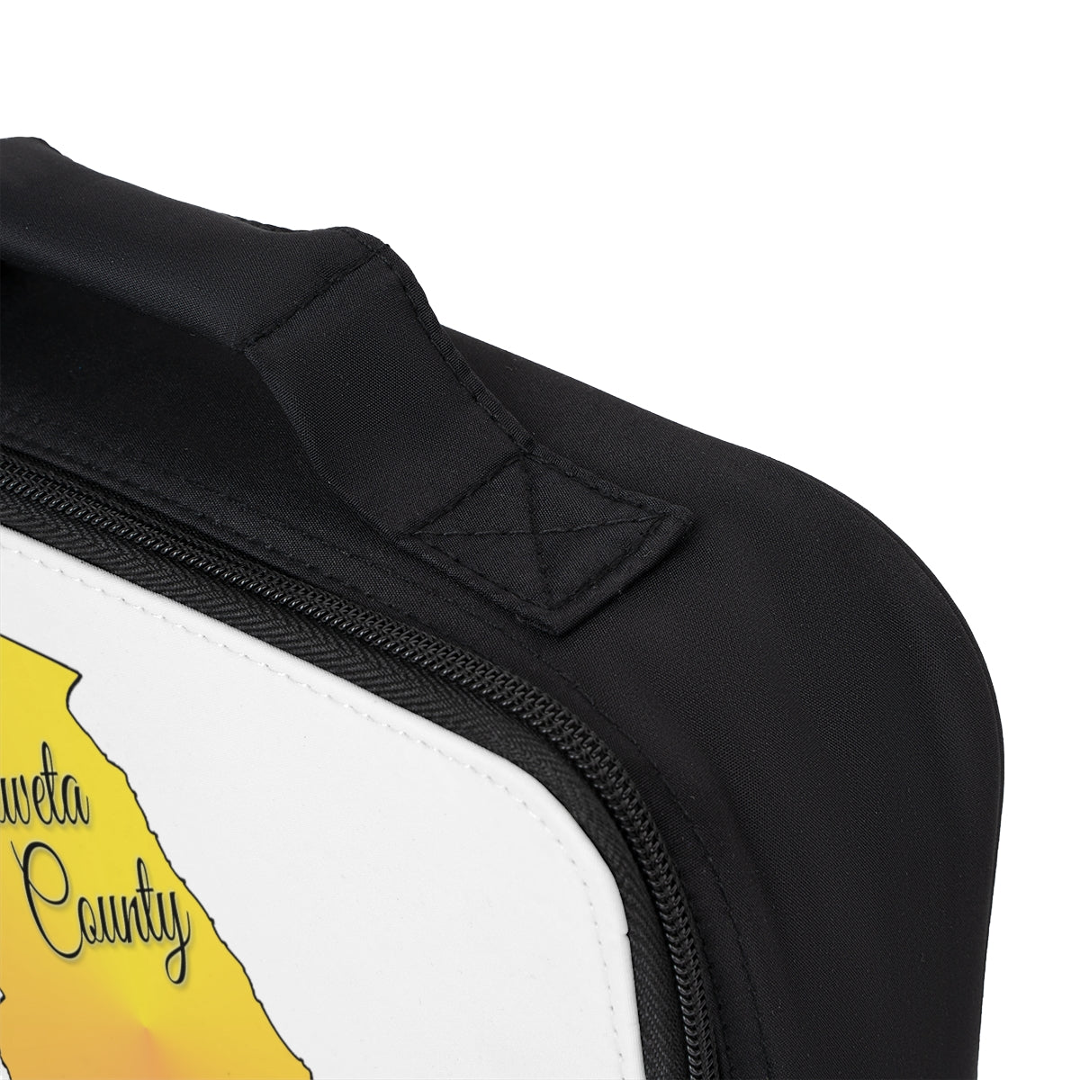 Show your love and pride in your home town or county. This lunch bag has a zippered closure, a convenient carrying handle, and a durable fabric made with 20% cotton - 80% polyester.