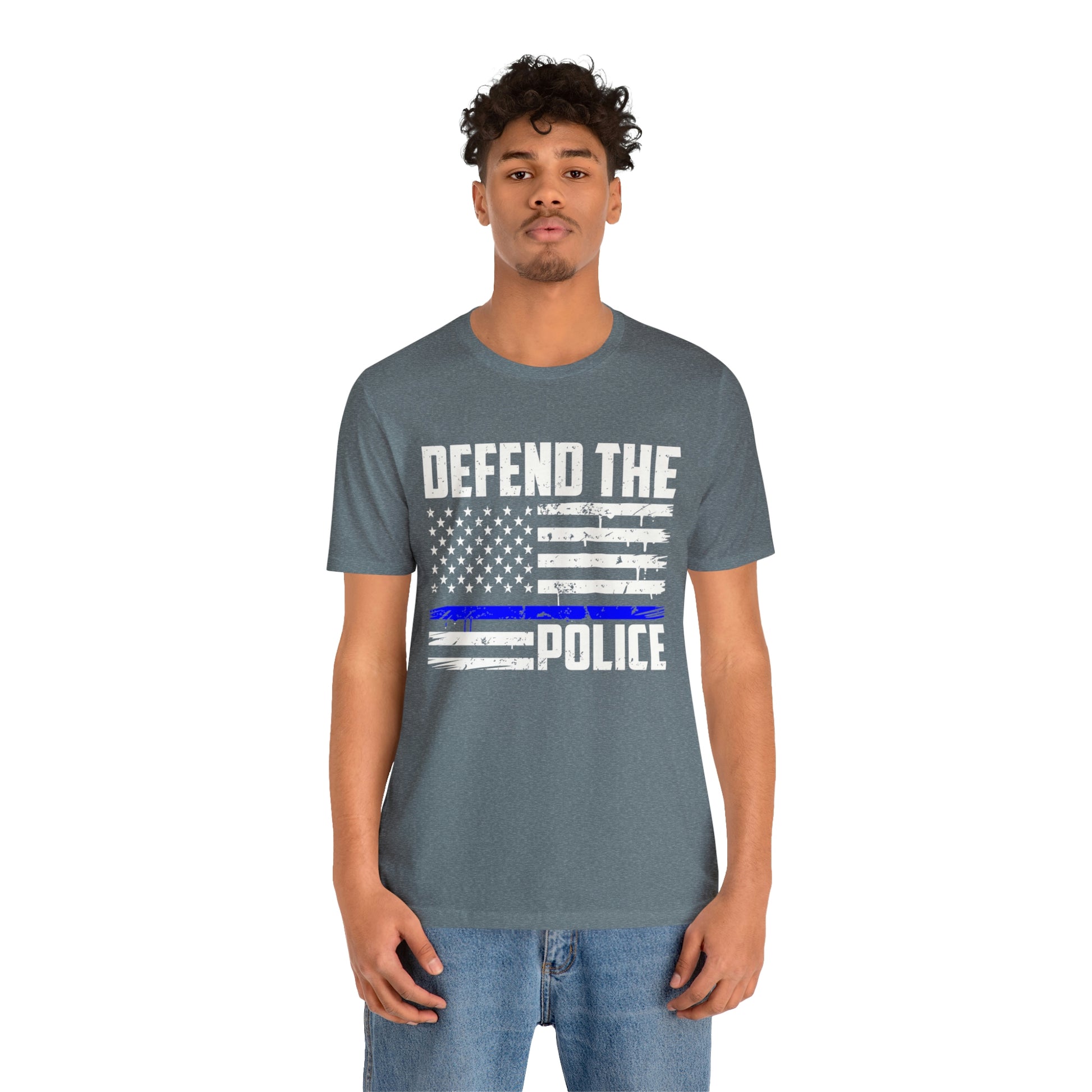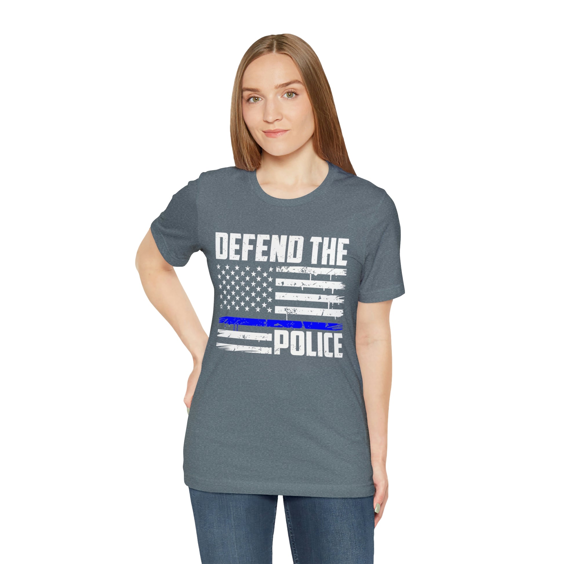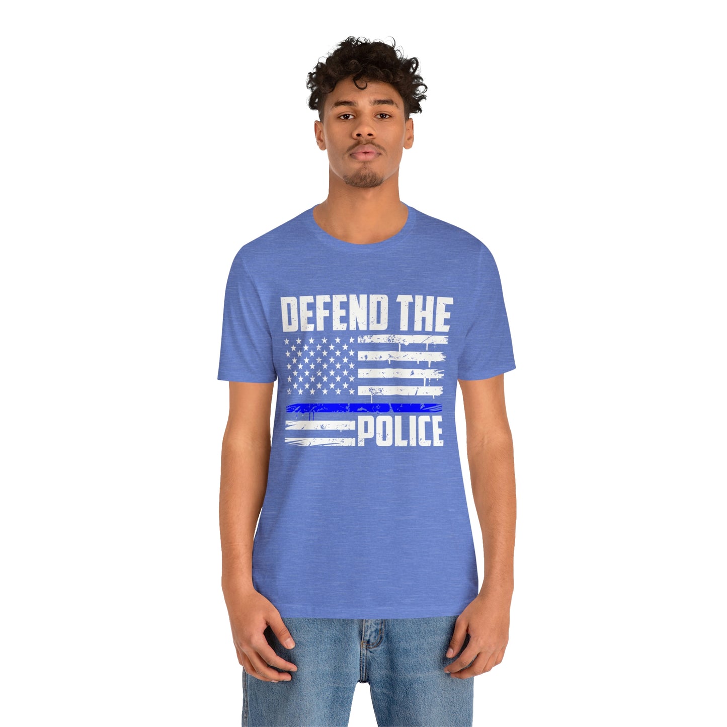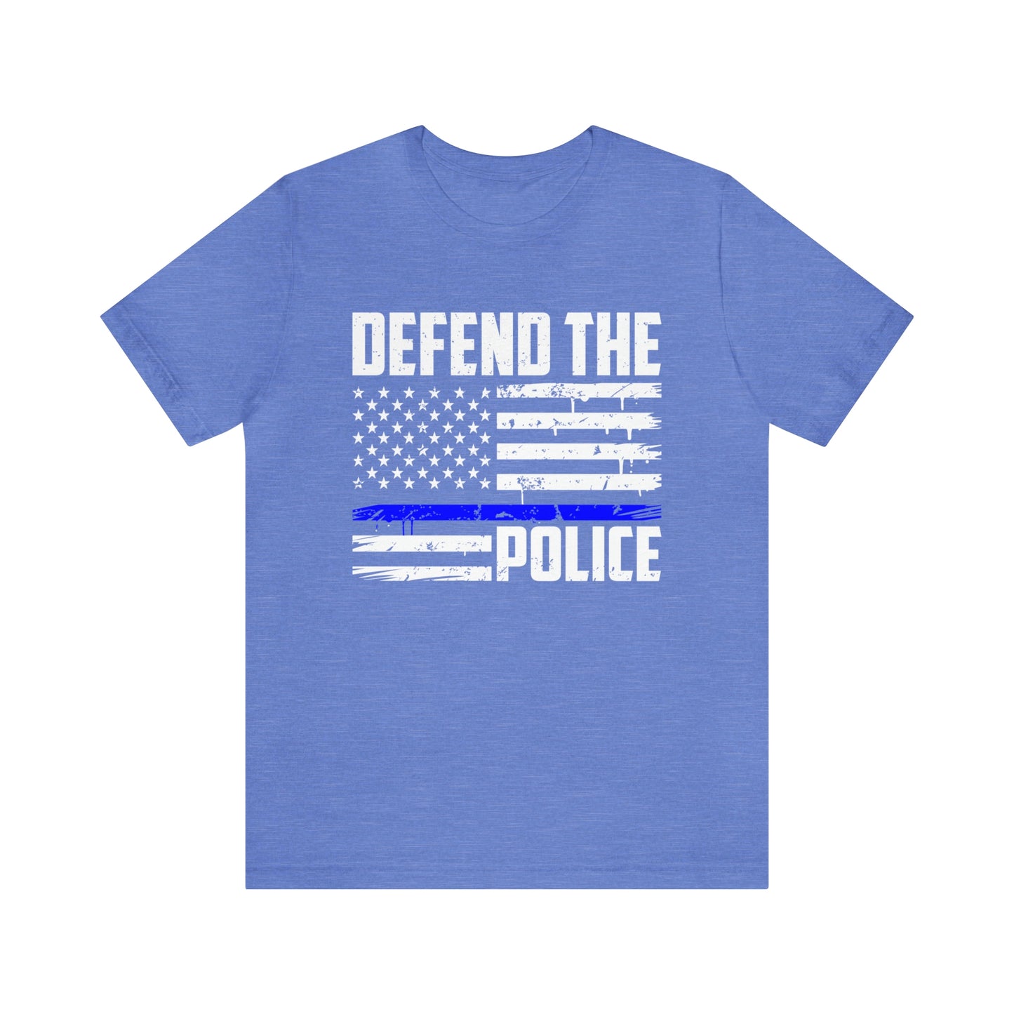 This classic unisex short sleeve t-shirt reads Defend the Police with an American flag design. This tee fits like a well-loved favorite. Soft cotton and quality print make you fall in love with it over and over again. These t-shirts have ribbed knit collars to bolster shaping. The shoulders have taping for better fit over time. Dual side seams hold the garment's shape for longer.