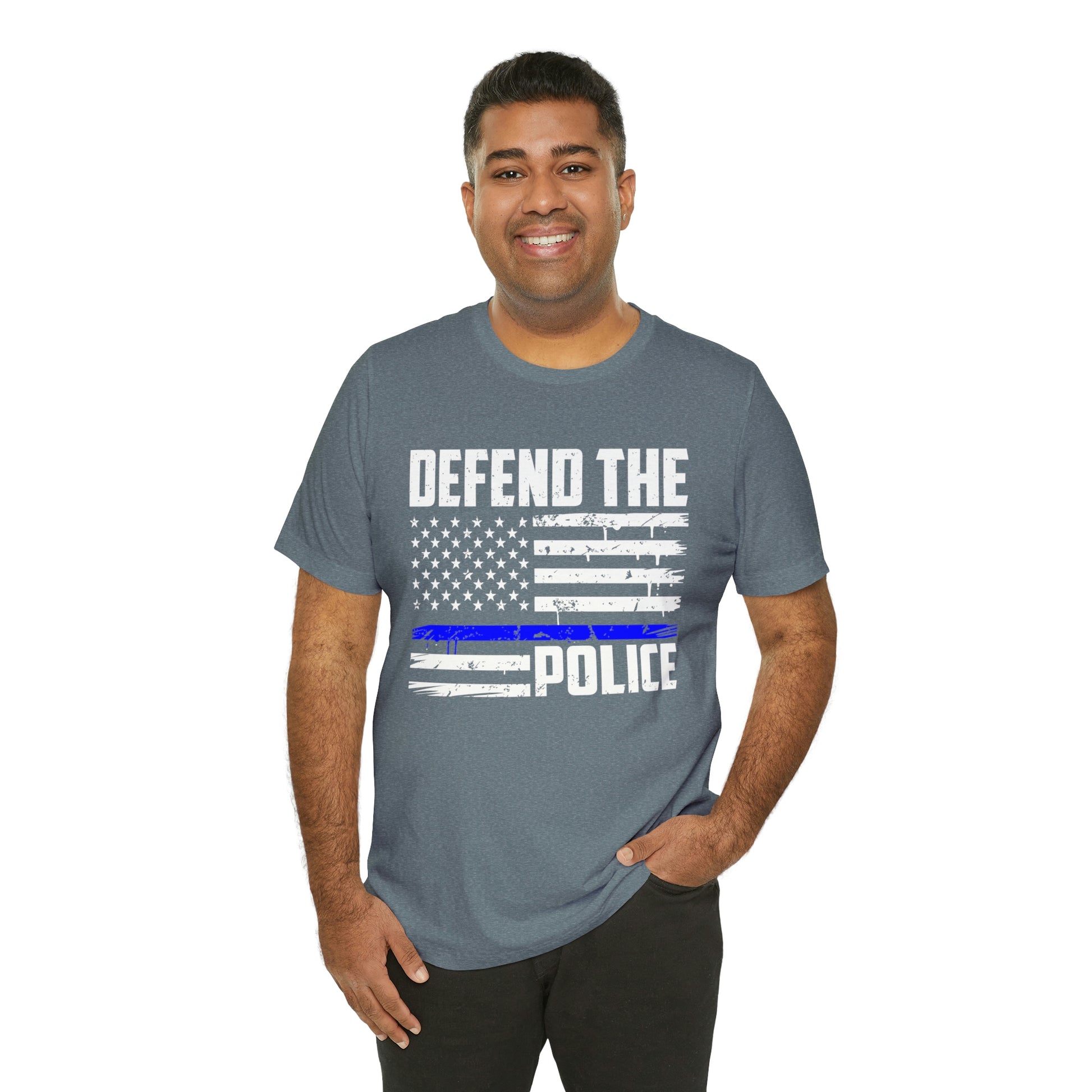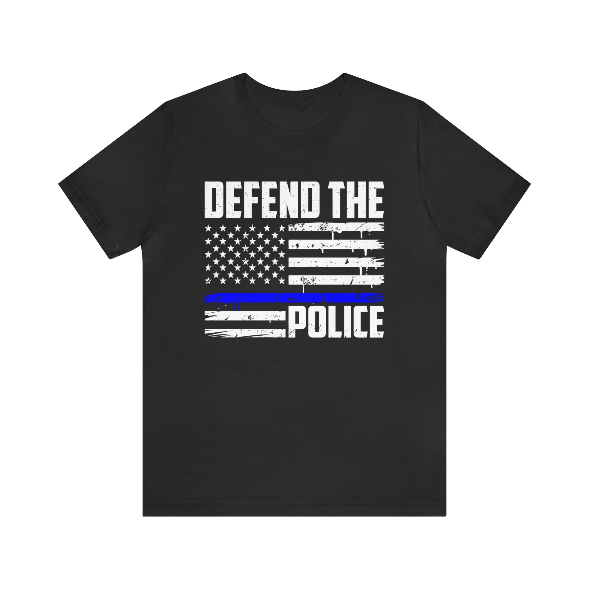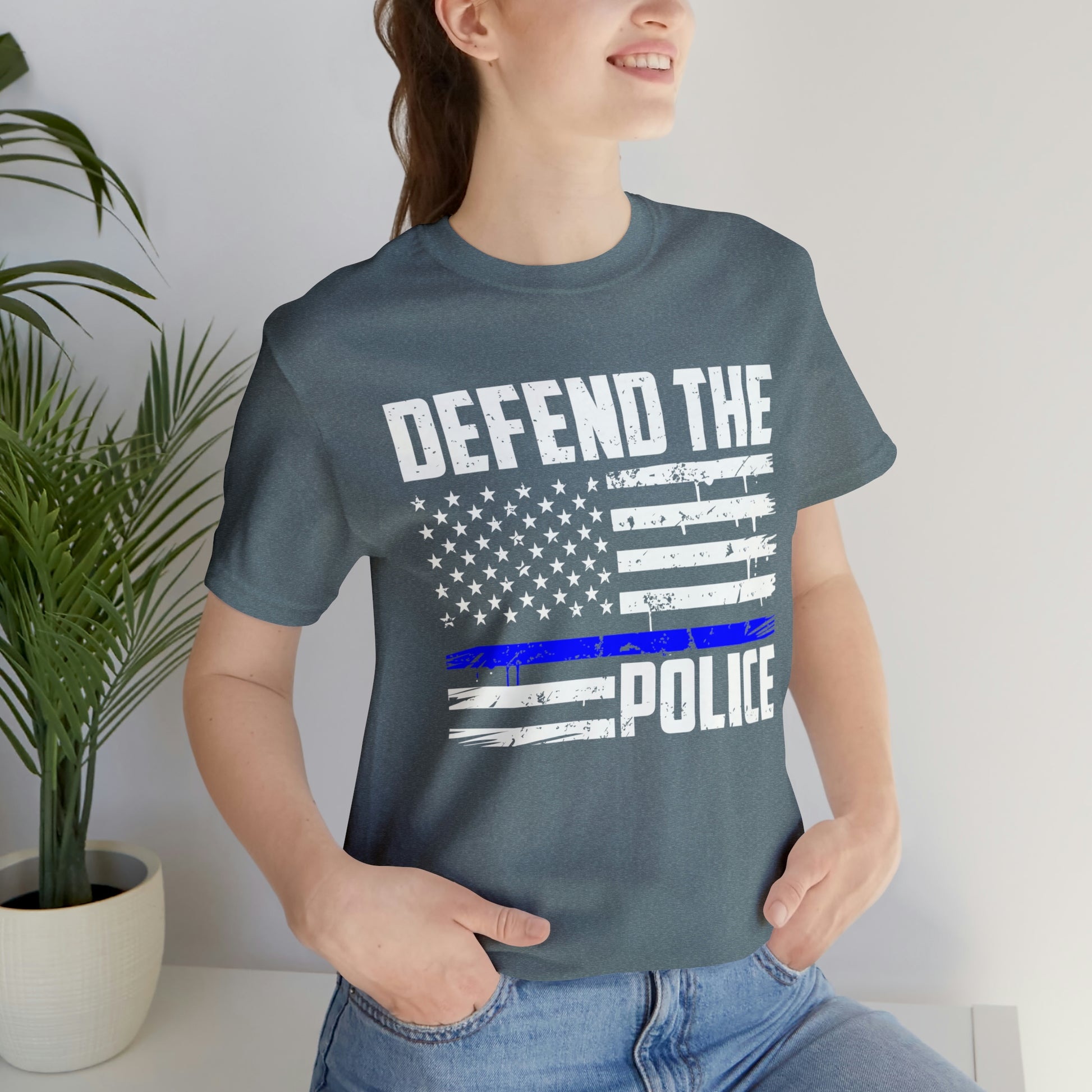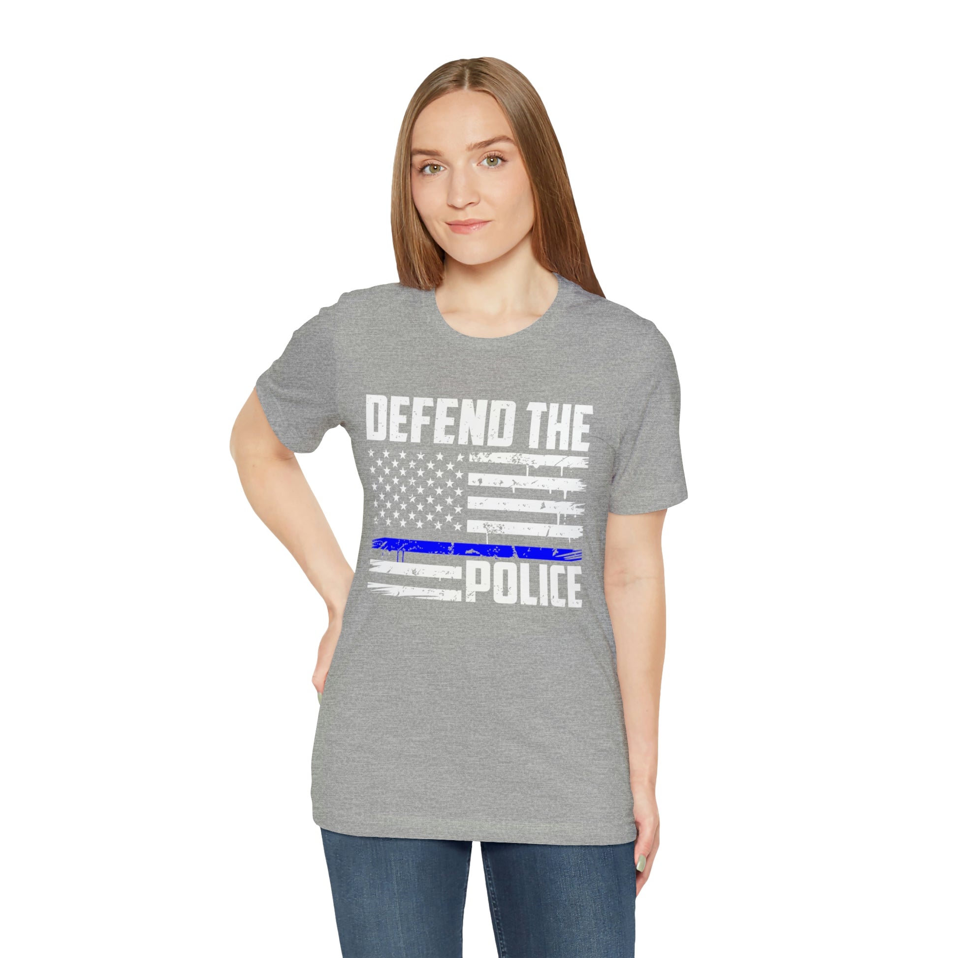 This classic unisex short sleeve t-shirt reads Defend the Police with an American flag design. This tee fits like a well-loved favorite. Soft cotton and quality print make you fall in love with it over and over again. These t-shirts have ribbed knit collars to bolster shaping. The shoulders have taping for better fit over time. Dual side seams hold the garment's shape for longer.
