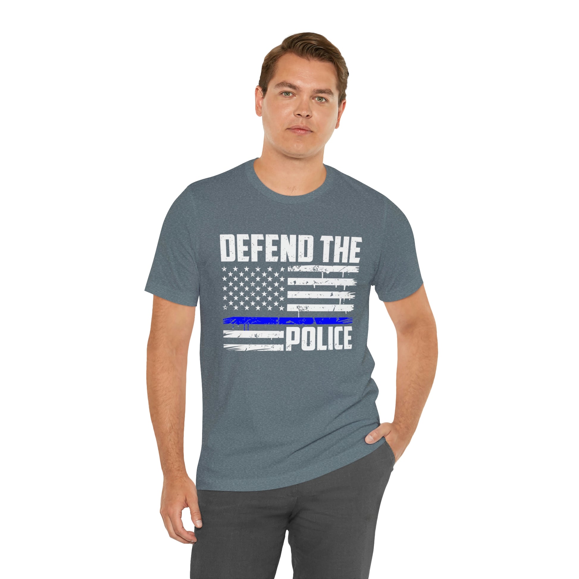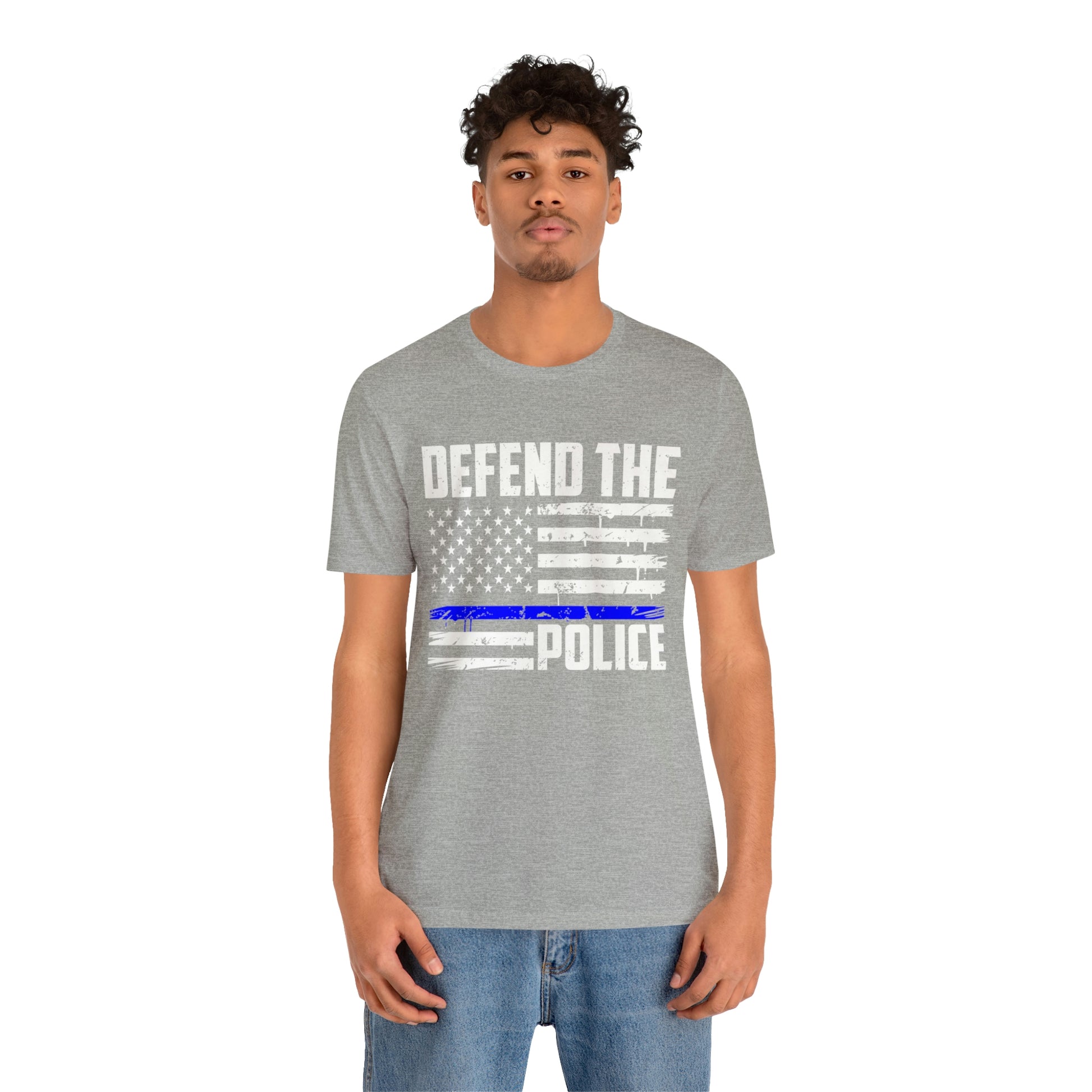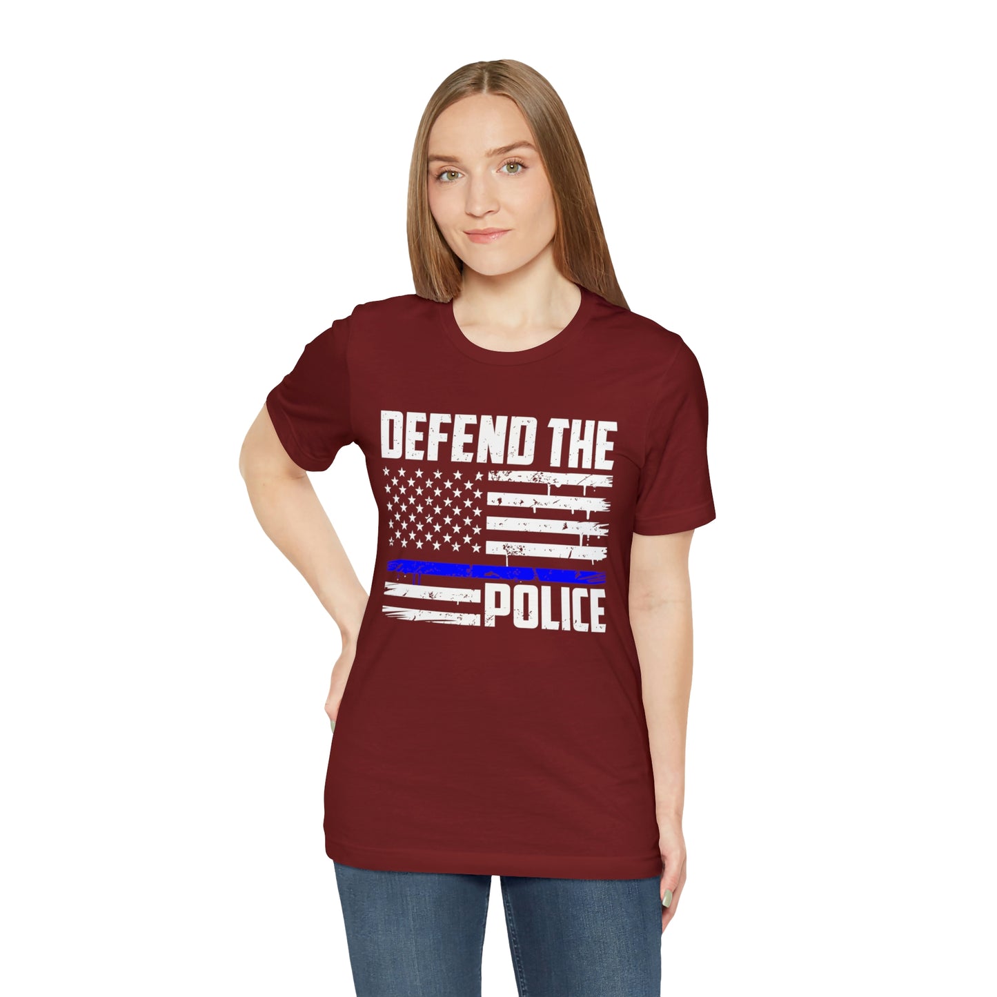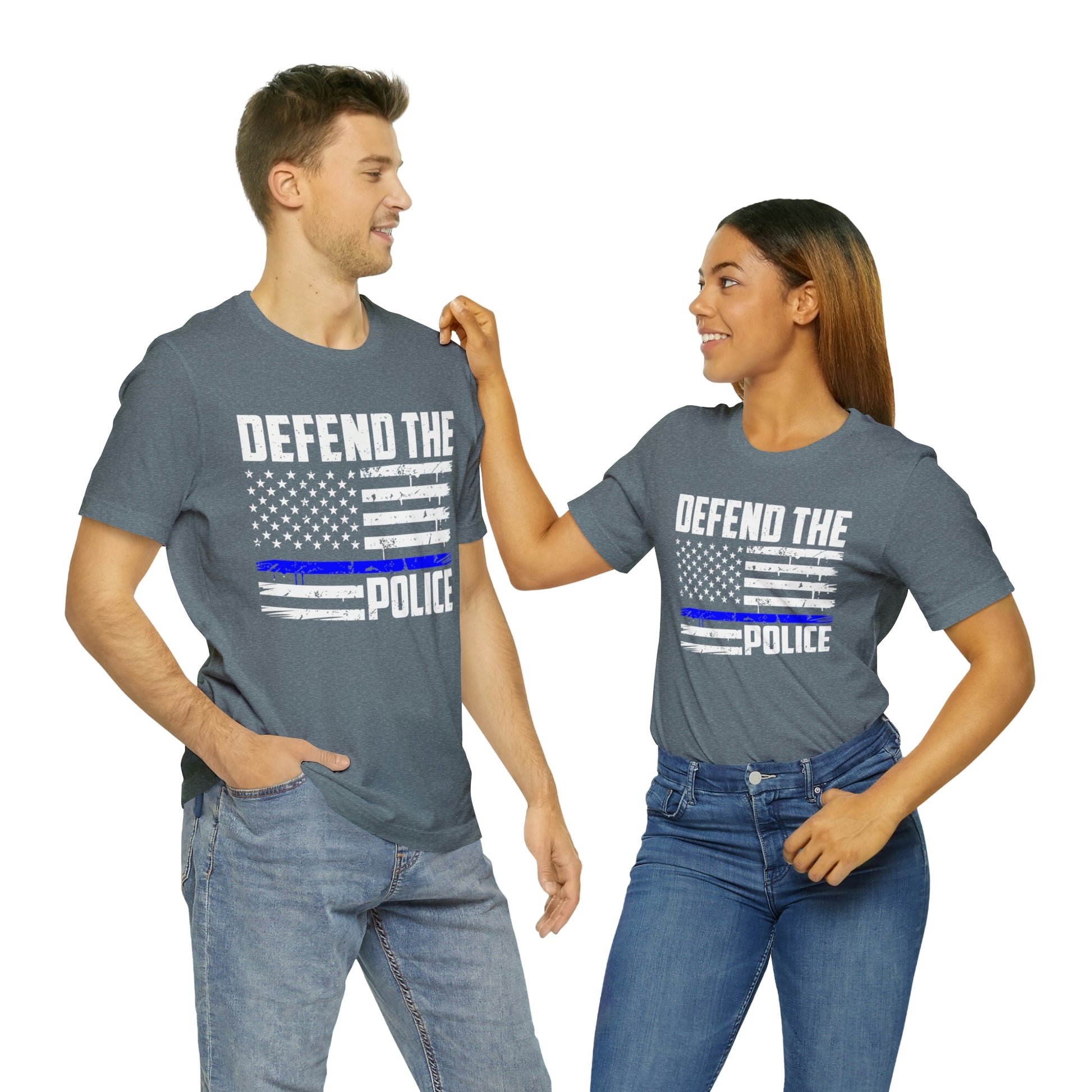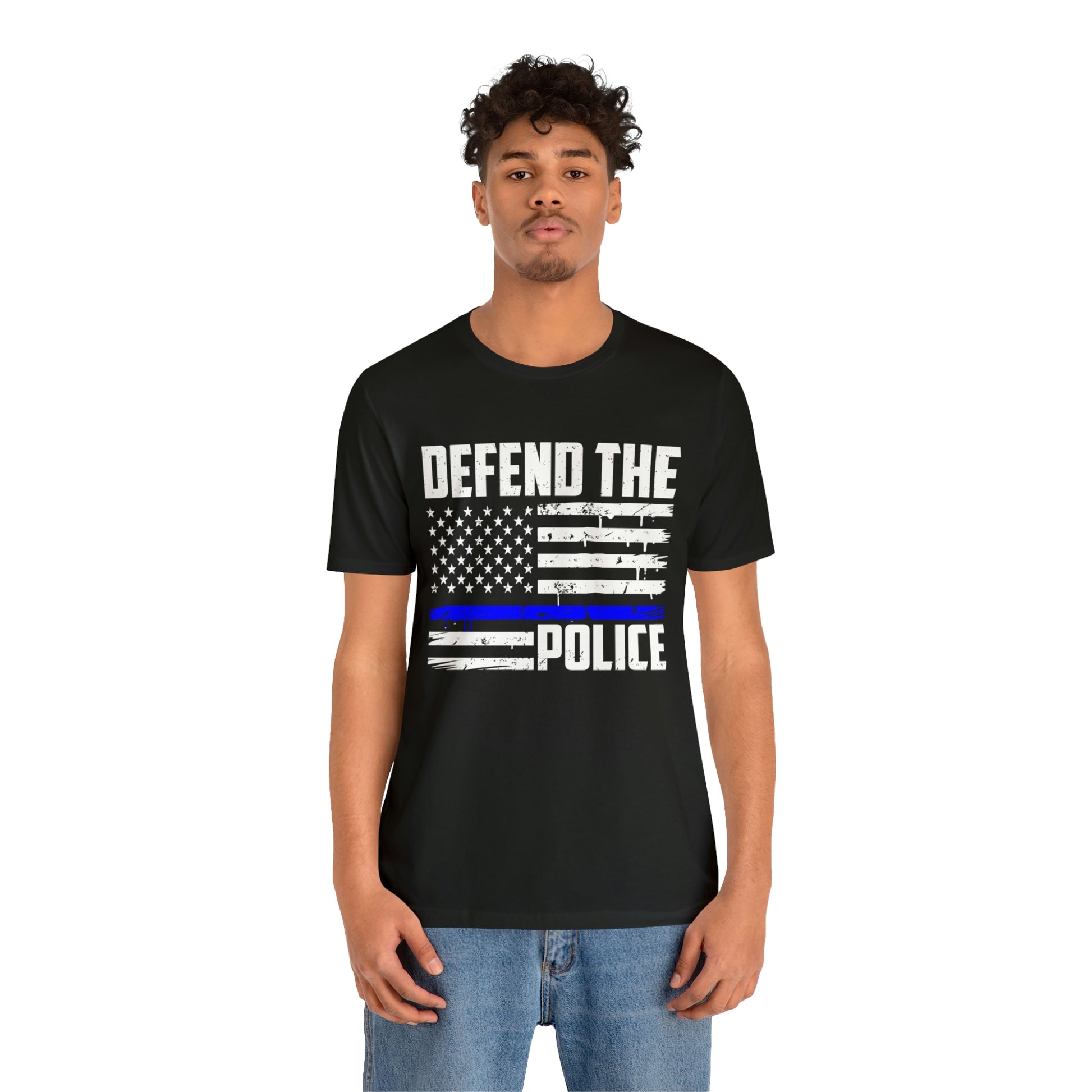 This classic unisex short sleeve t-shirt reads Defend the Police with an American flag design. This tee fits like a well-loved favorite. Soft cotton and quality print make you fall in love with it over and over again. These t-shirts have ribbed knit collars to bolster shaping. The shoulders have taping for better fit over time. Dual side seams hold the garment's shape for longer.