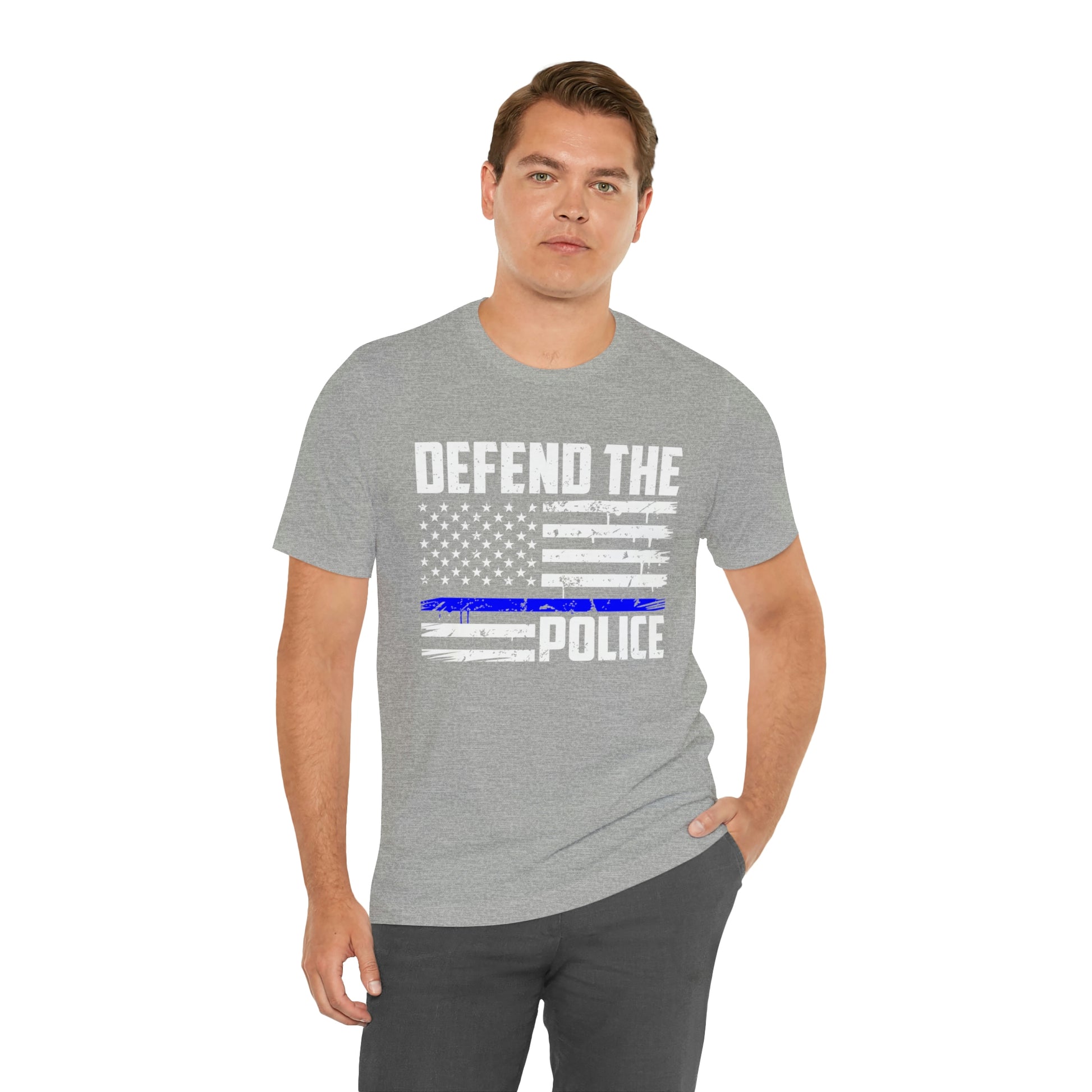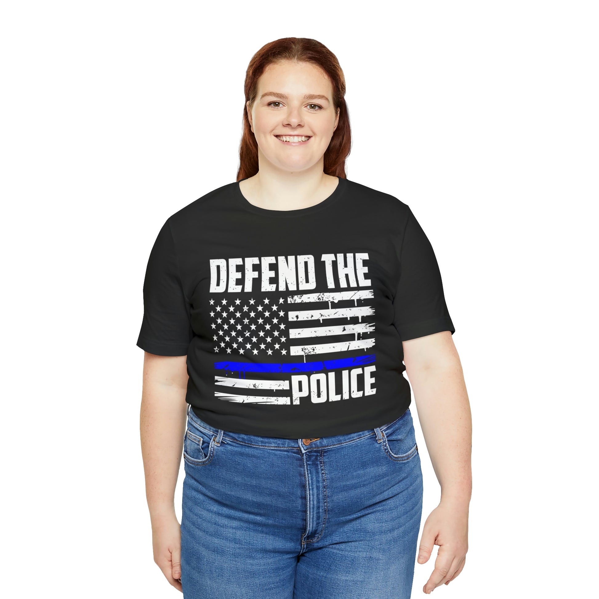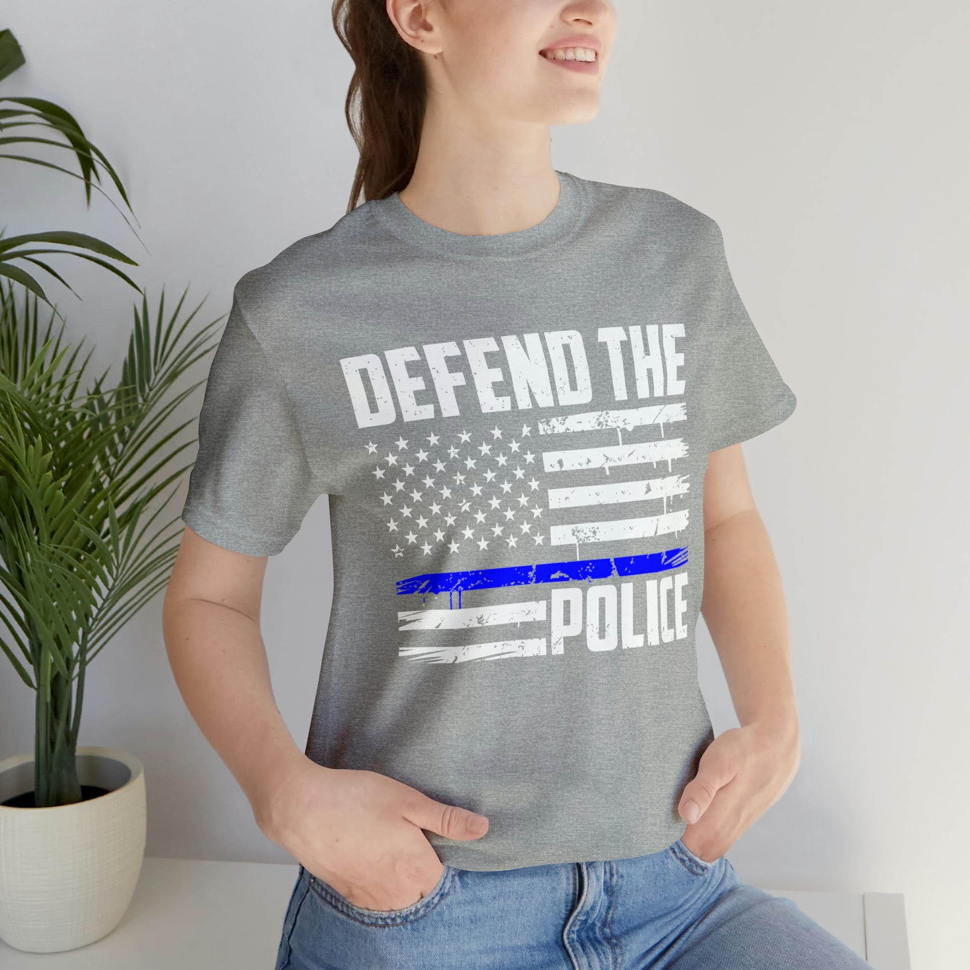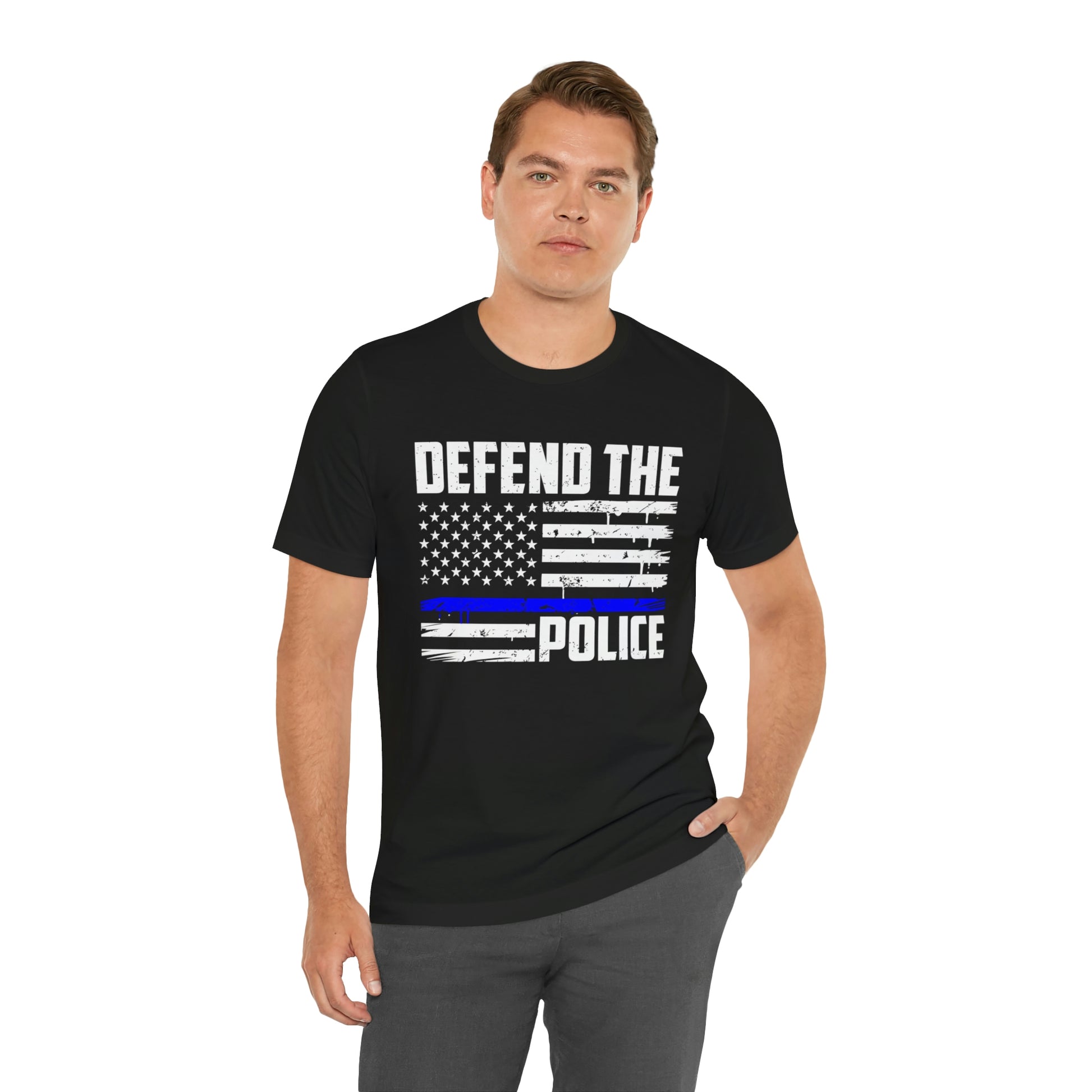 This classic unisex short sleeve t-shirt reads Defend the Police with an American flag design. This tee fits like a well-loved favorite. Soft cotton and quality print make you fall in love with it over and over again. These t-shirts have ribbed knit collars to bolster shaping. The shoulders have taping for better fit over time. Dual side seams hold the garment's shape for longer.