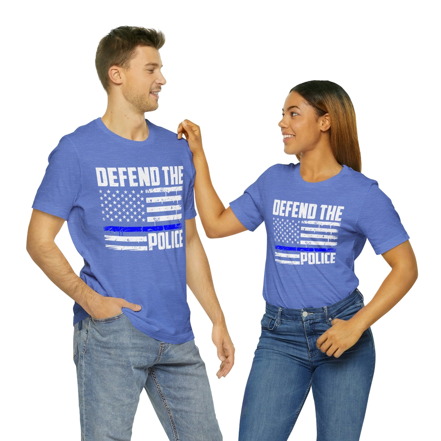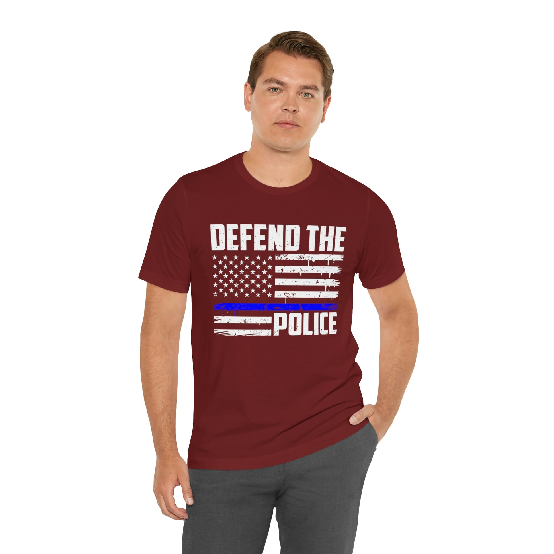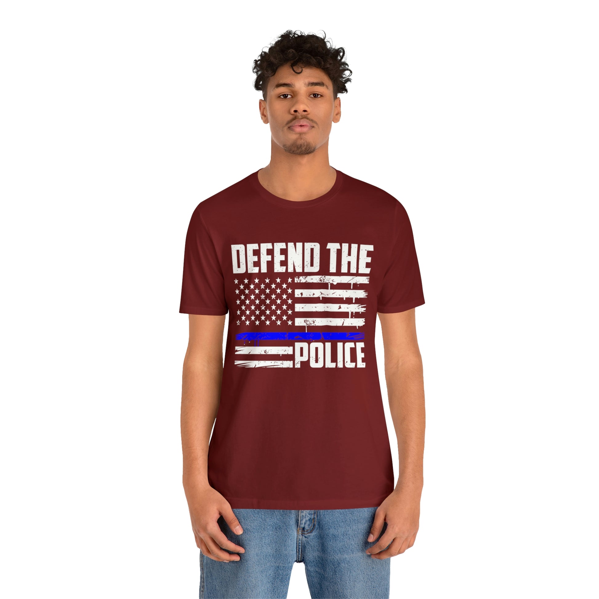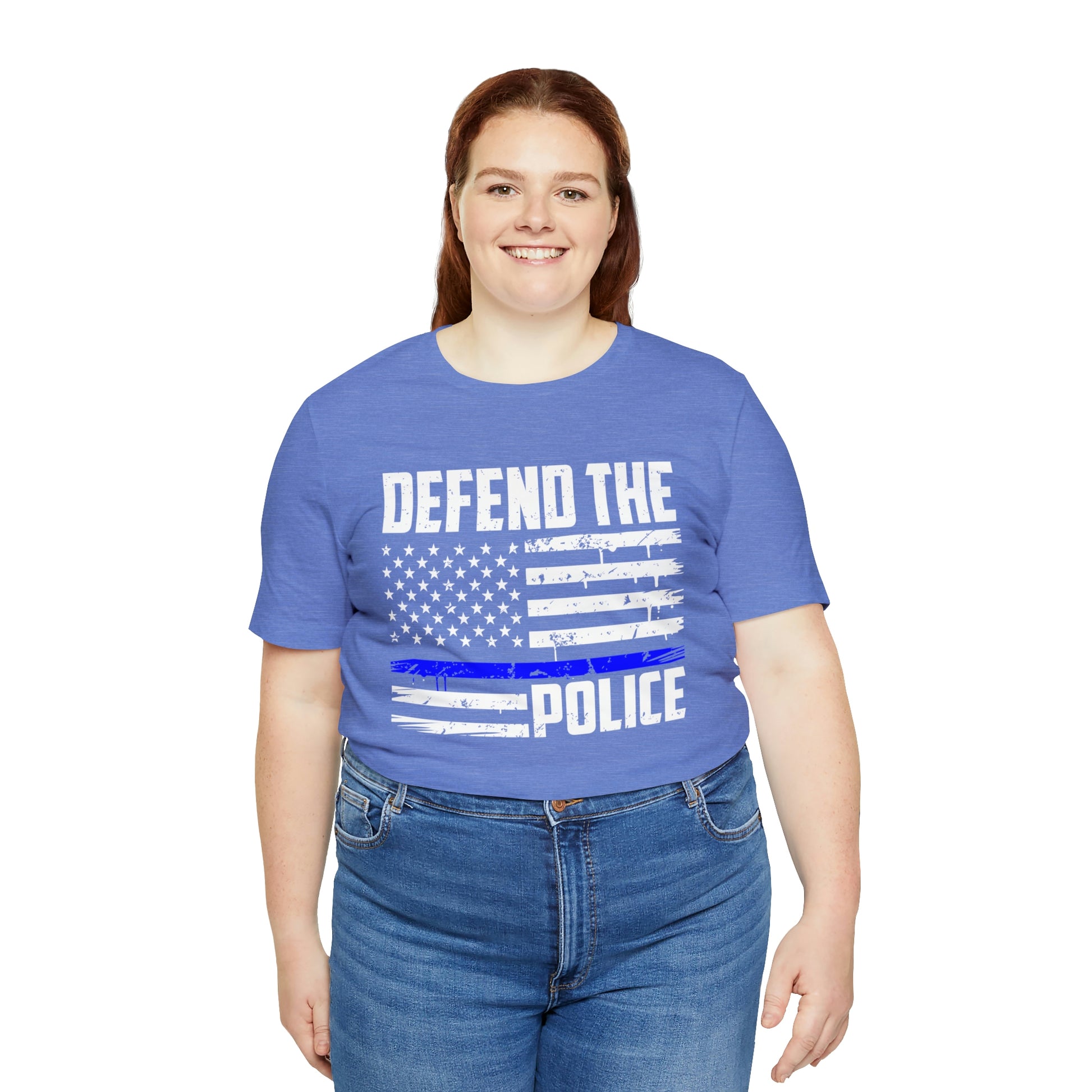 This classic unisex short sleeve t-shirt reads Defend the Police with an American flag design. This tee fits like a well-loved favorite. Soft cotton and quality print make you fall in love with it over and over again. These t-shirts have ribbed knit collars to bolster shaping. The shoulders have taping for better fit over time. Dual side seams hold the garment's shape for longer.