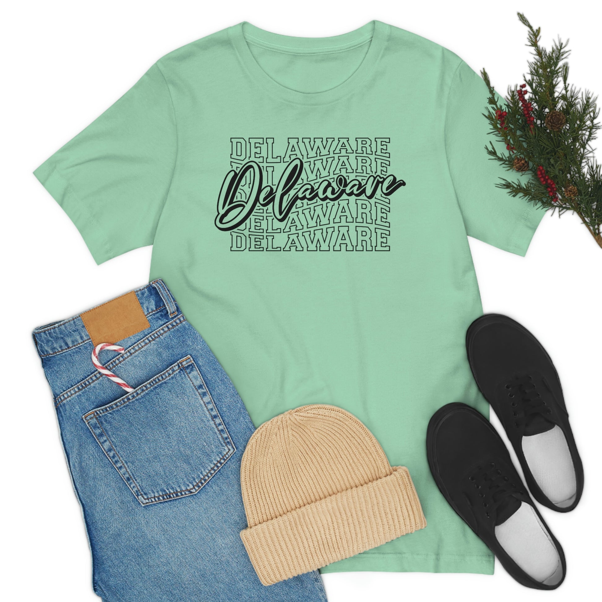 Show off your love and pride in Delaware with this classic unisex short sleeve t-shirt showing the written in varsity letters and then in script over it. This tee fits like a well-loved favorite. Soft cotton and quality print make you fall in love with it over and over again. These t-shirts have ribbed knit collars to bolster shaping. The shoulders have taping for better fit over time. Dual side seams hold the garment's shape for longer.