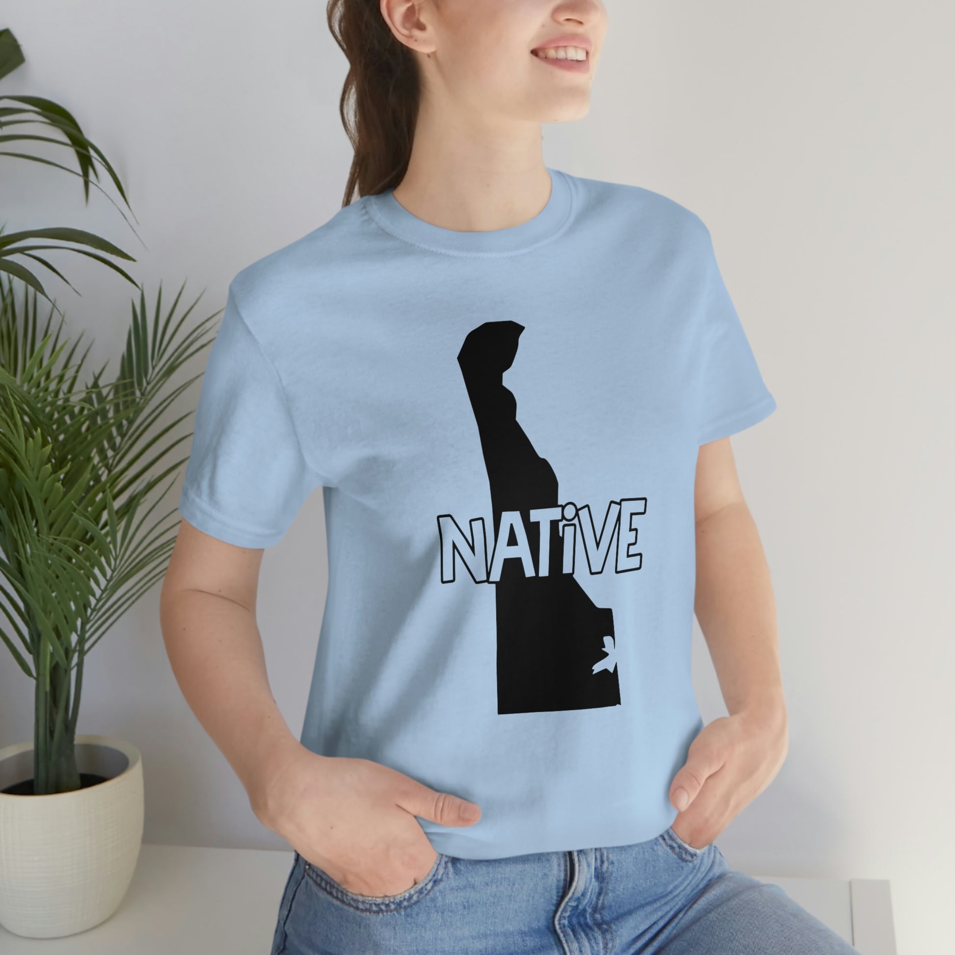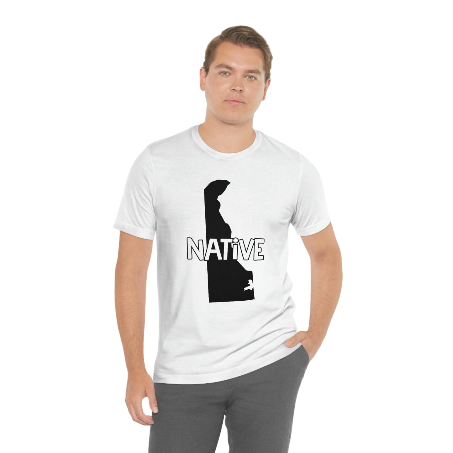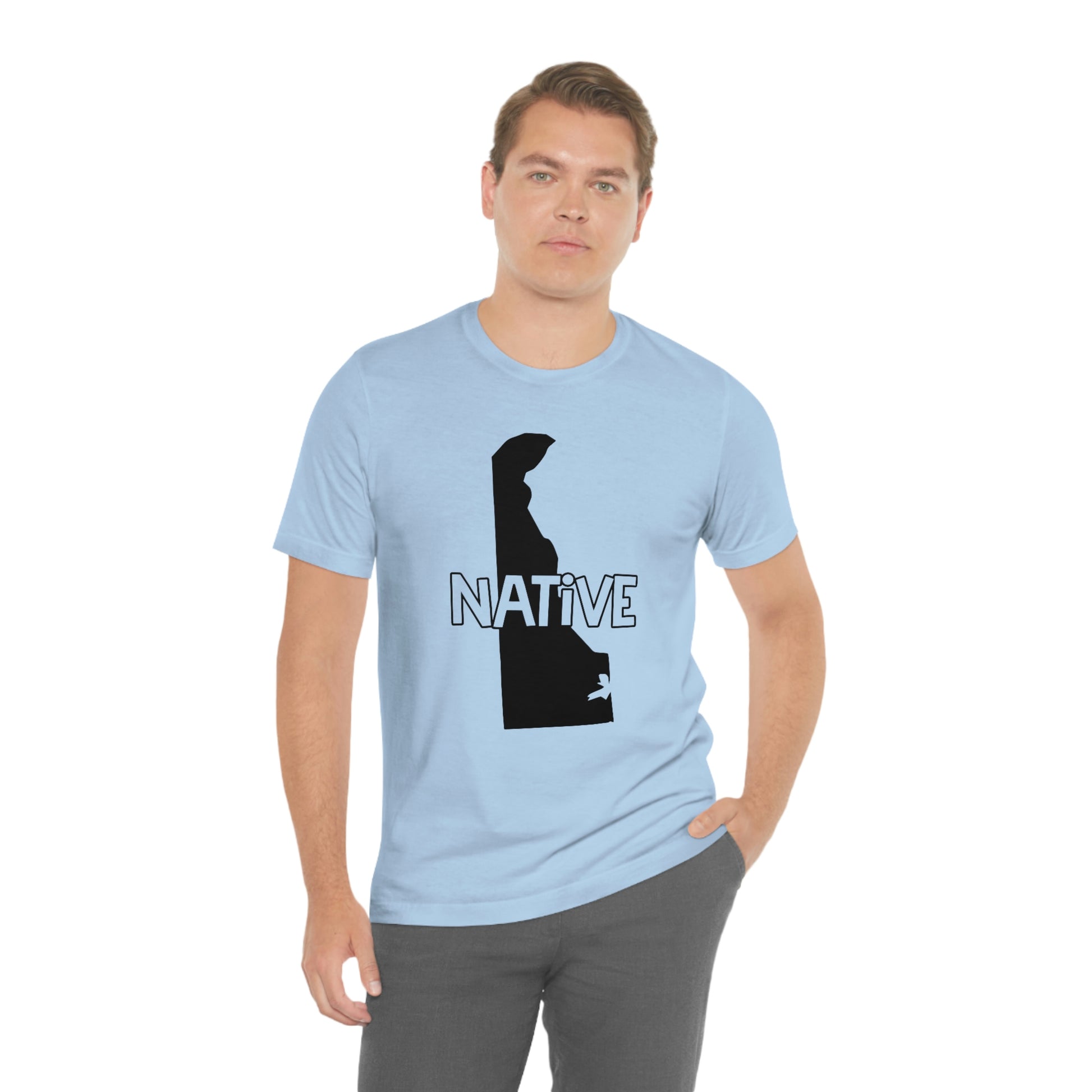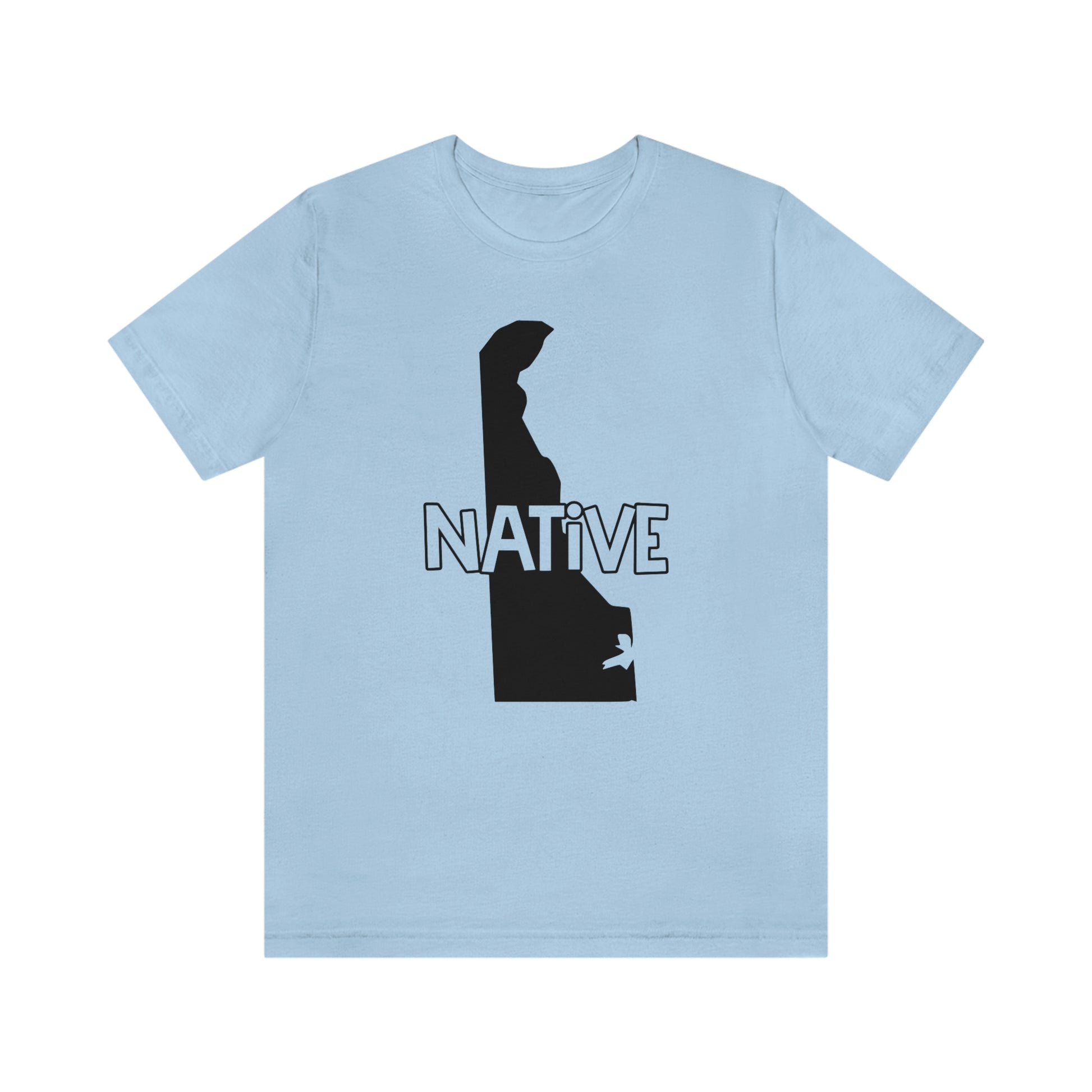 Show off your love and pride in Delaware with this classic unisex short sleeve t-shirt showing the outline of the state with the word "native" across it. This tee fits like a well-loved favorite. Soft cotton and quality print make you fall in love with it over and over again. These t-shirts have ribbed knit collars to bolster shaping. The shoulders have taping for better fit over time. Dual side seams hold the garment's shape for longer.