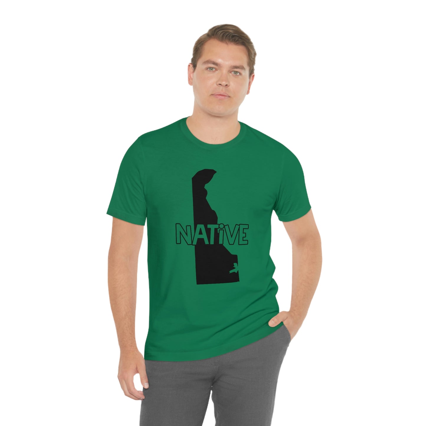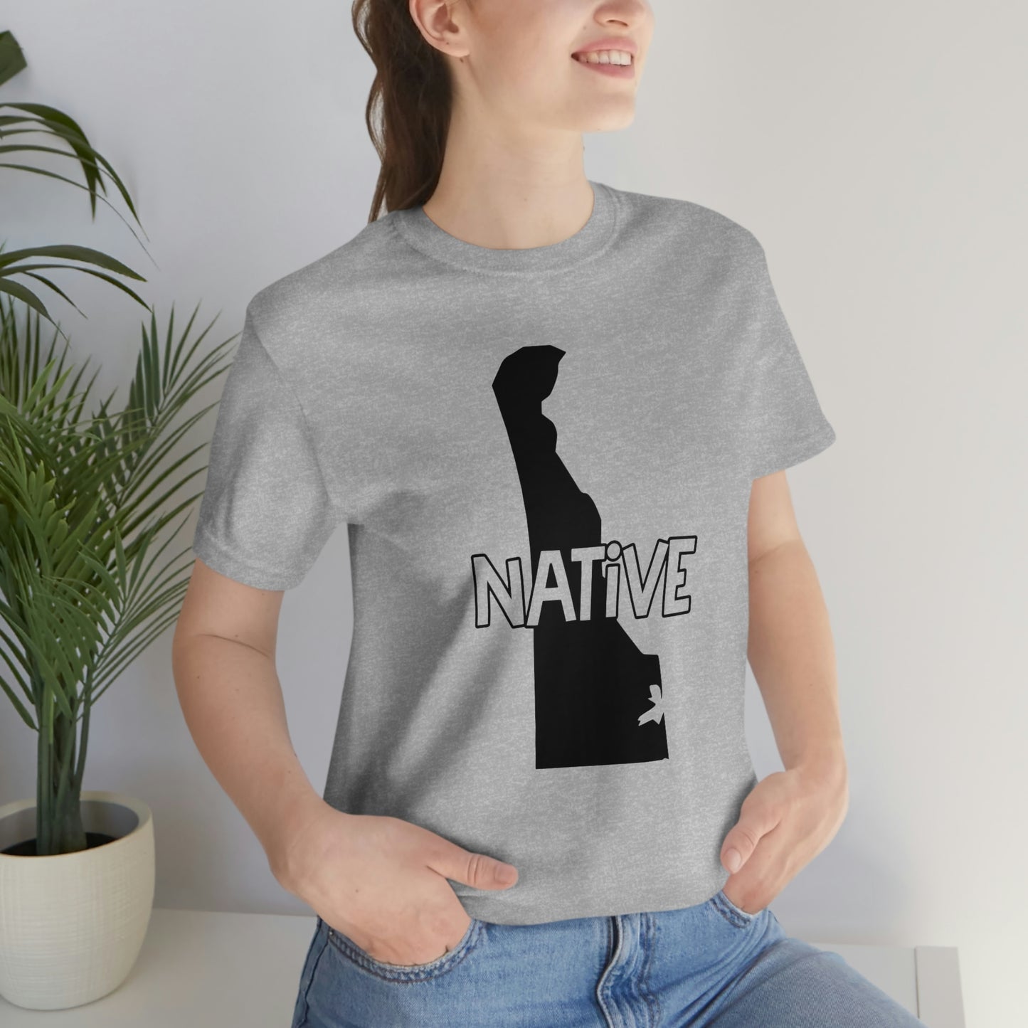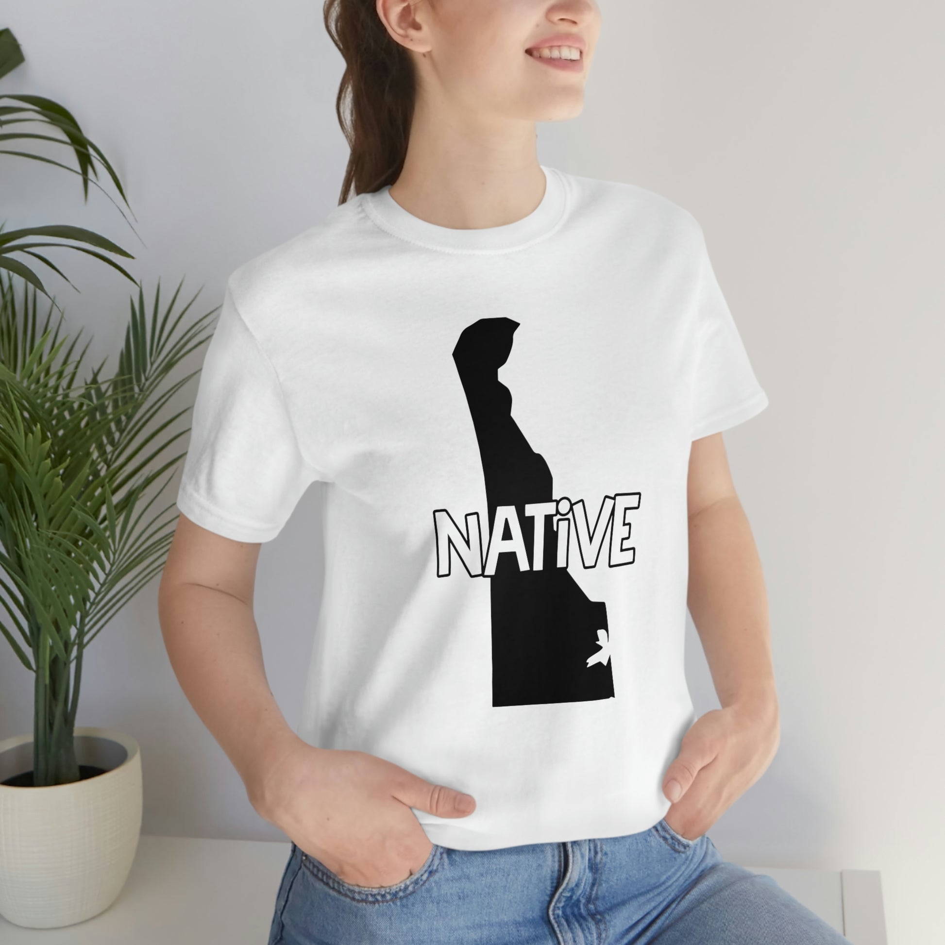 Show off your love and pride in Delaware with this classic unisex short sleeve t-shirt showing the outline of the state with the word "native" across it. This tee fits like a well-loved favorite. Soft cotton and quality print make you fall in love with it over and over again. These t-shirts have ribbed knit collars to bolster shaping. The shoulders have taping for better fit over time. Dual side seams hold the garment's shape for longer.