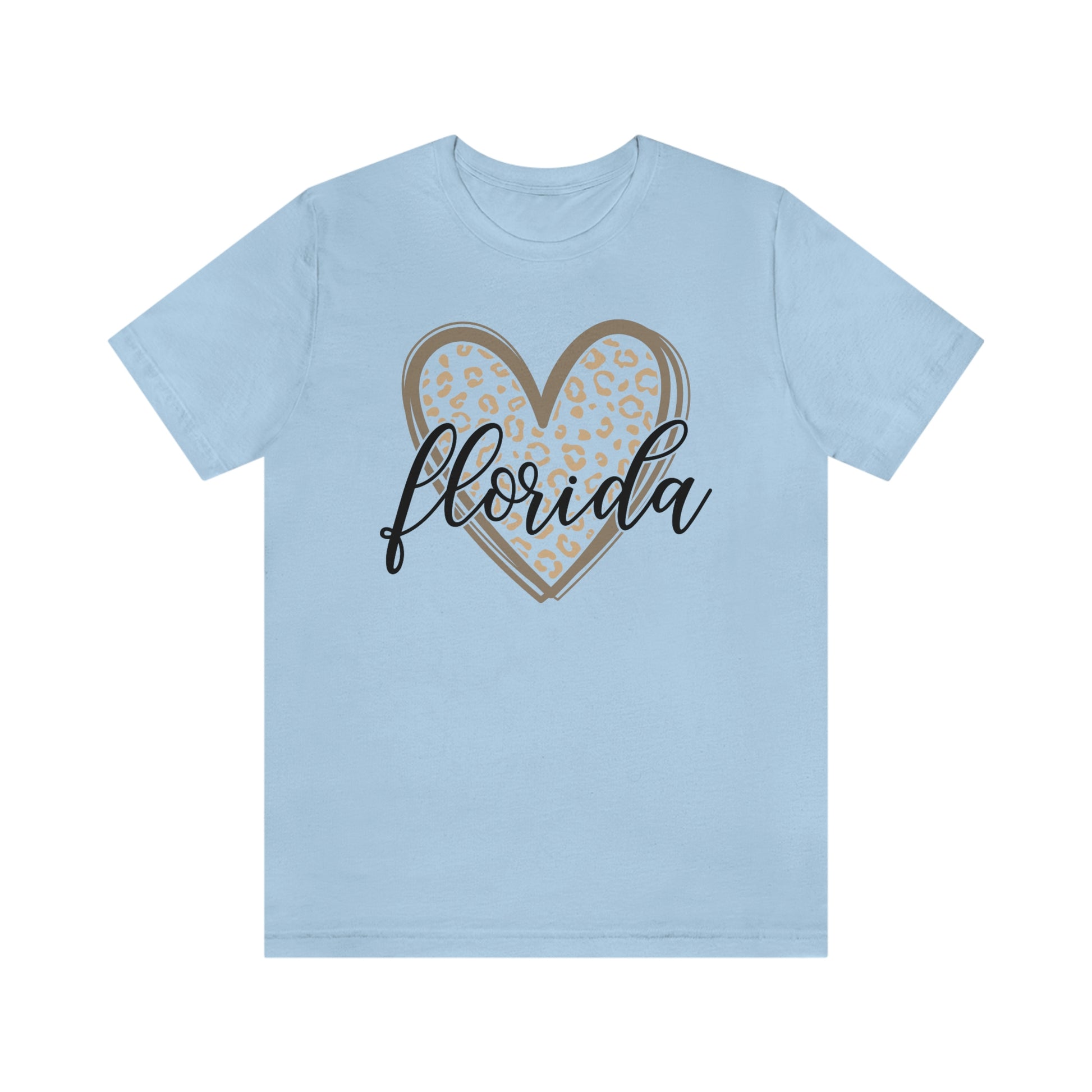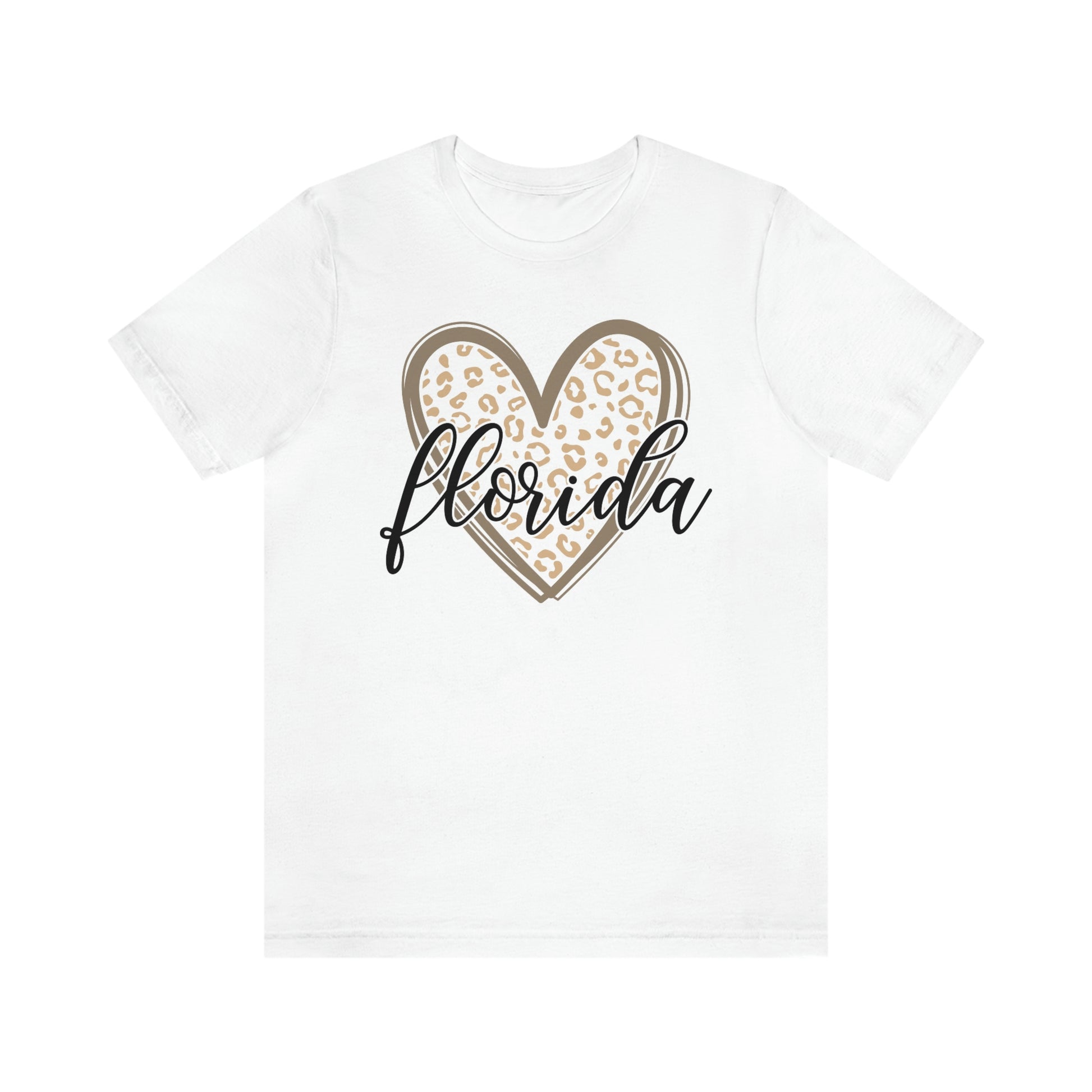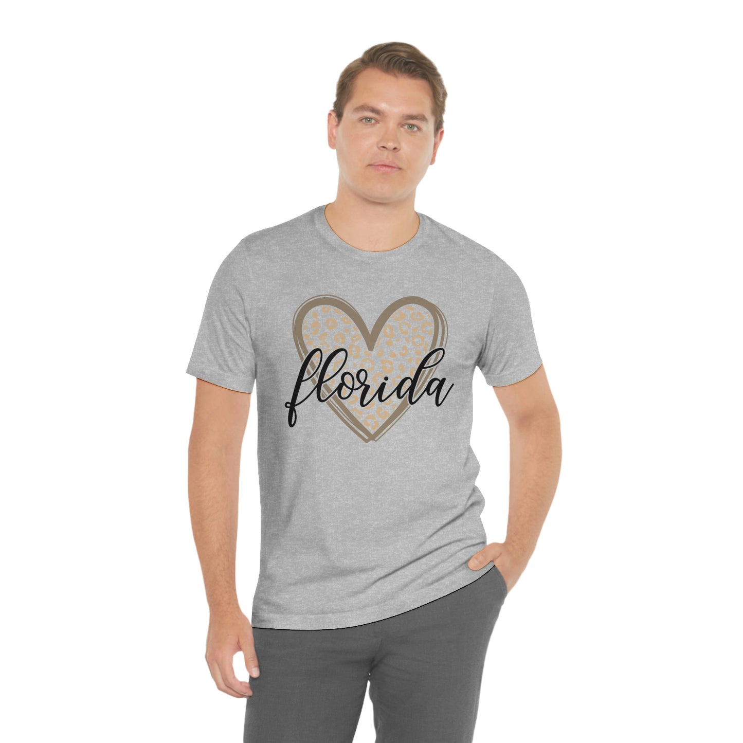 Show off your love and pride in Florida with this classic unisex short sleeve t-shirt sporting a heart with gold leopard print and Florida written in an attractive black script. This tee fits like a well-loved favorite. Soft cotton and quality print make you fall in love with it over and over again. These t-shirts have ribbed knit collars to bolster shaping. The shoulders have taping for better fit over time. Dual side seams hold the garment's shape for longer.
