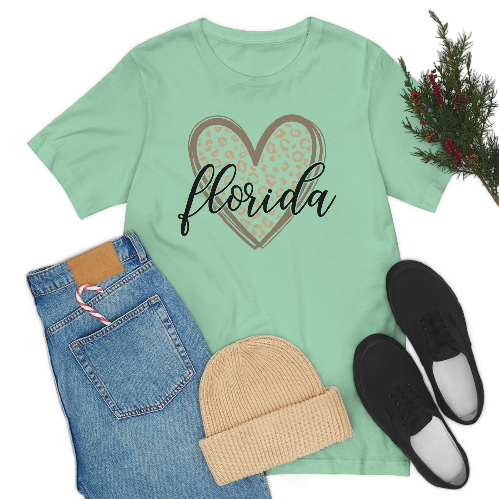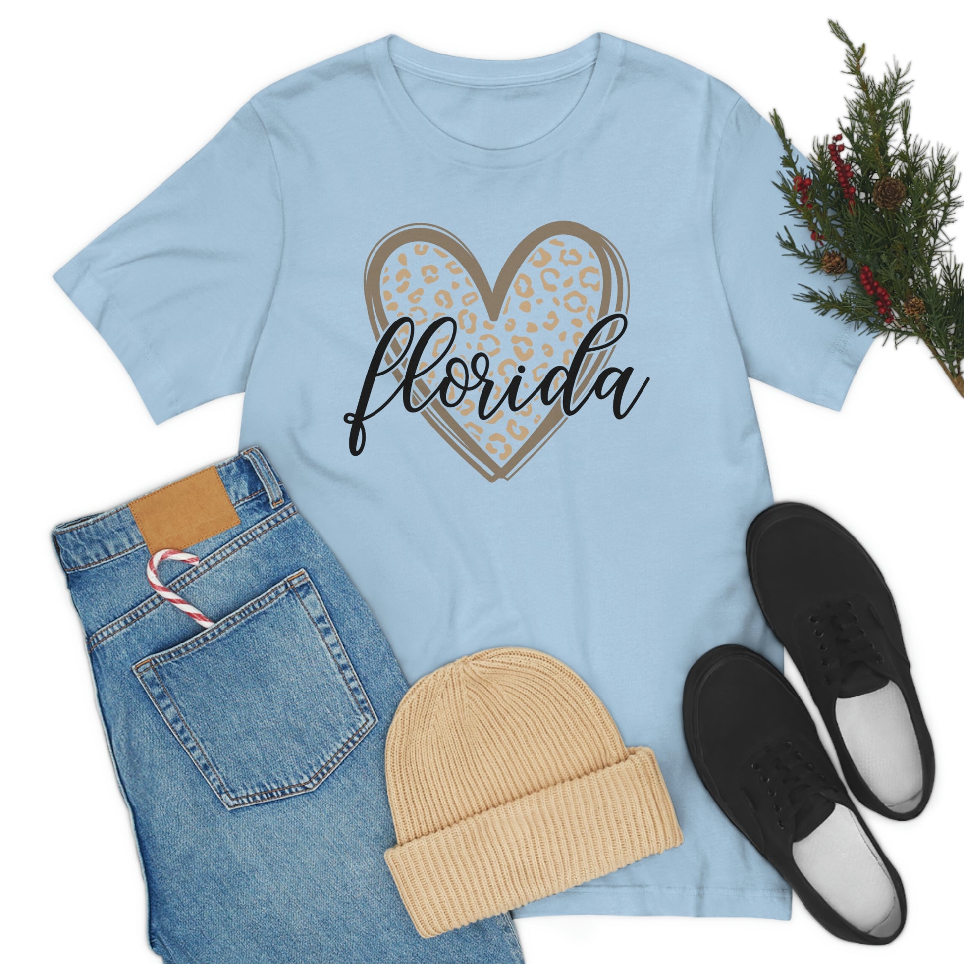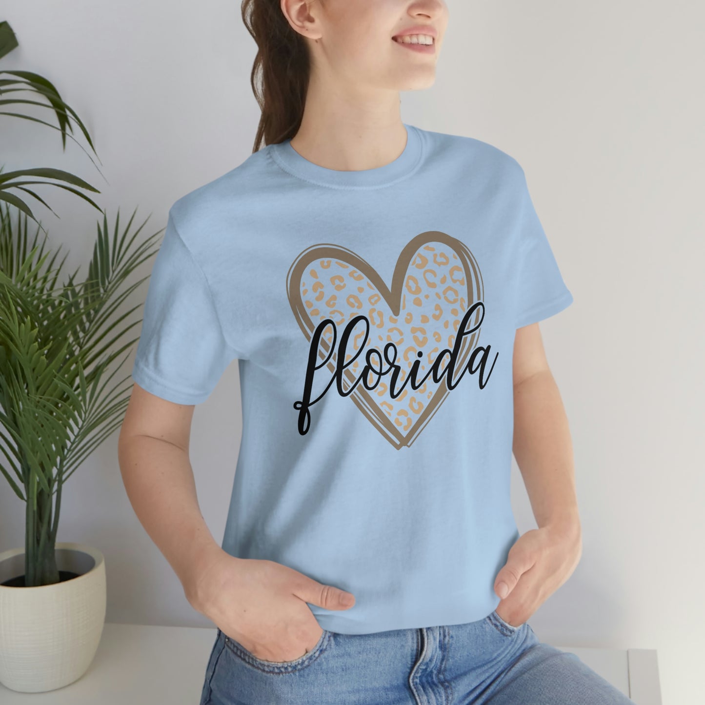 Show off your love and pride in Florida with this classic unisex short sleeve t-shirt sporting a heart with gold leopard print and Florida written in an attractive black script. This tee fits like a well-loved favorite. Soft cotton and quality print make you fall in love with it over and over again. These t-shirts have ribbed knit collars to bolster shaping. The shoulders have taping for better fit over time. Dual side seams hold the garment's shape for longer.