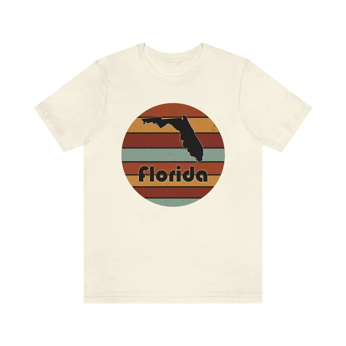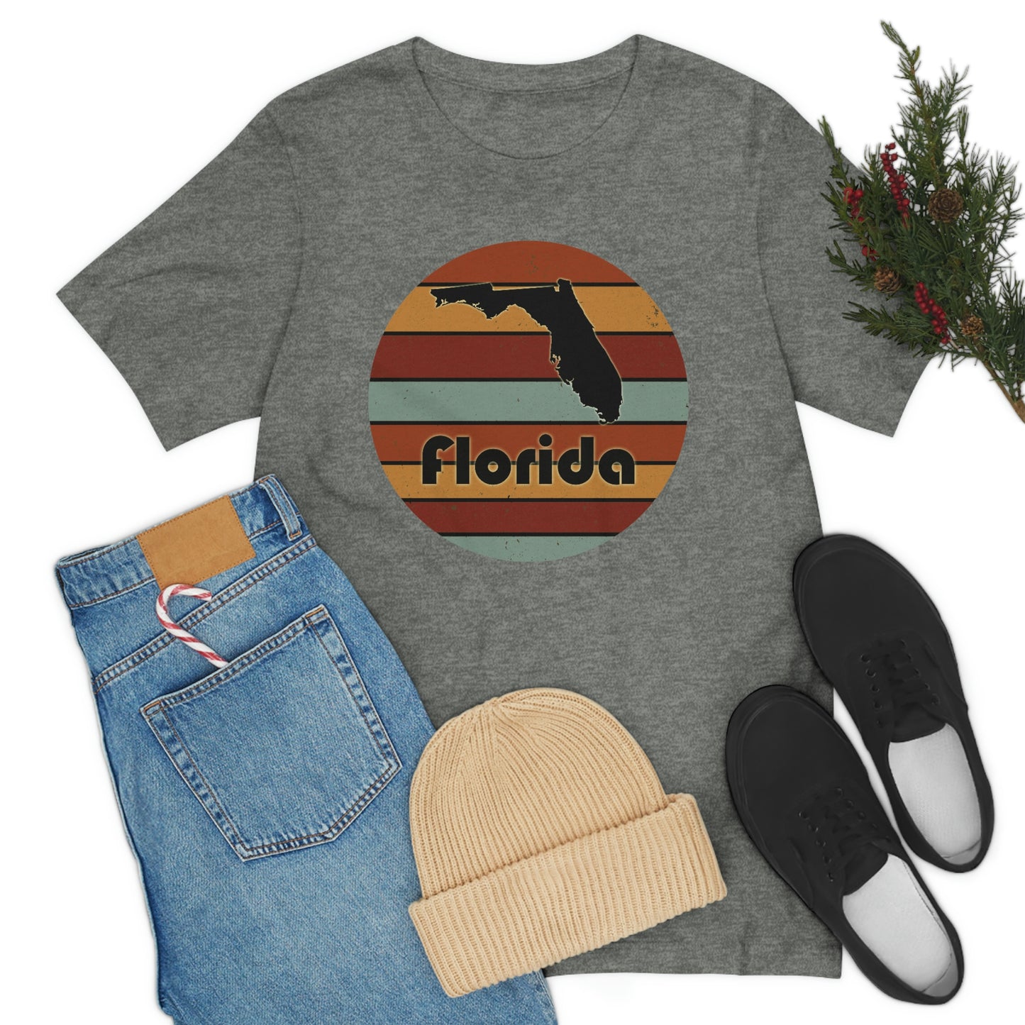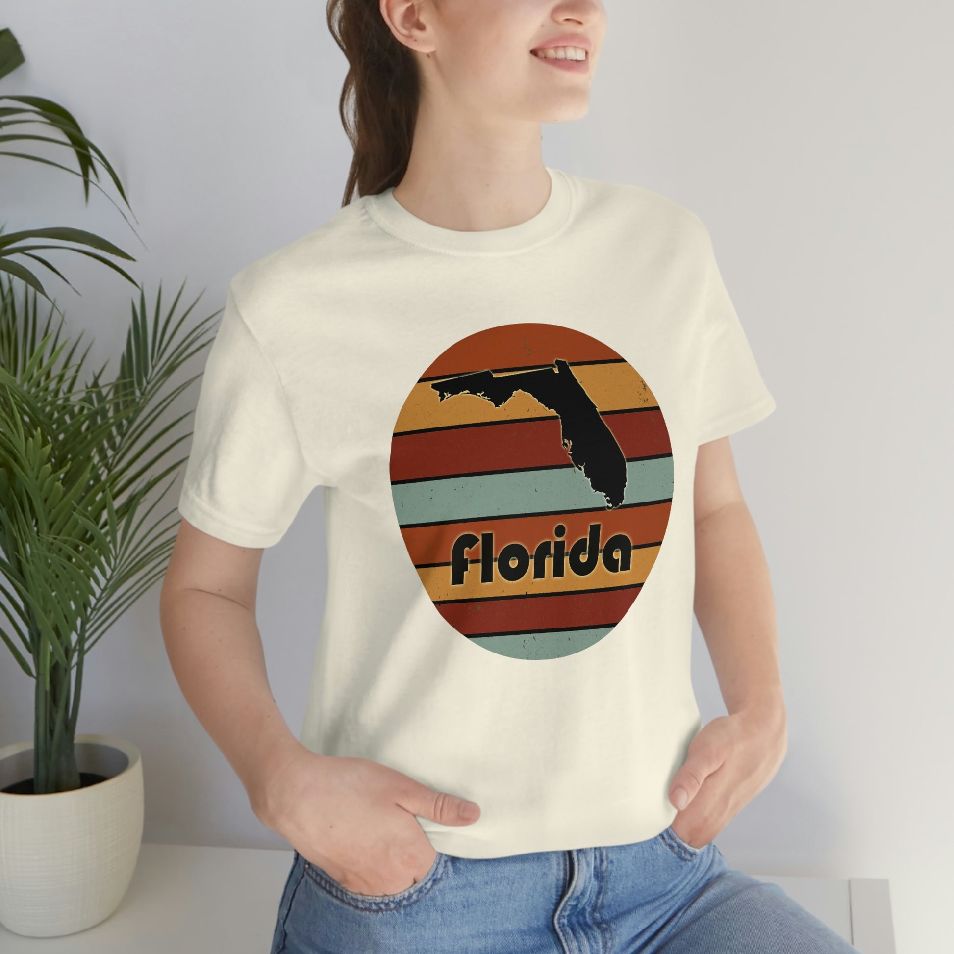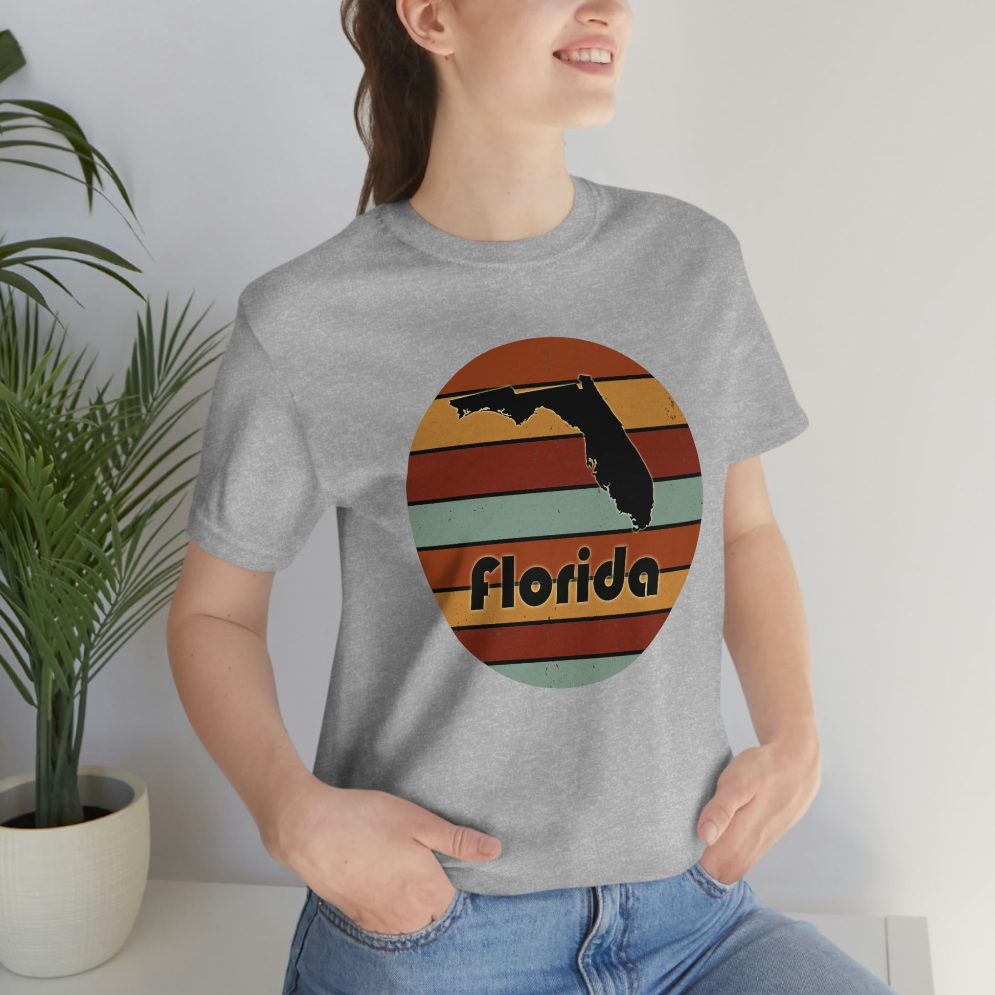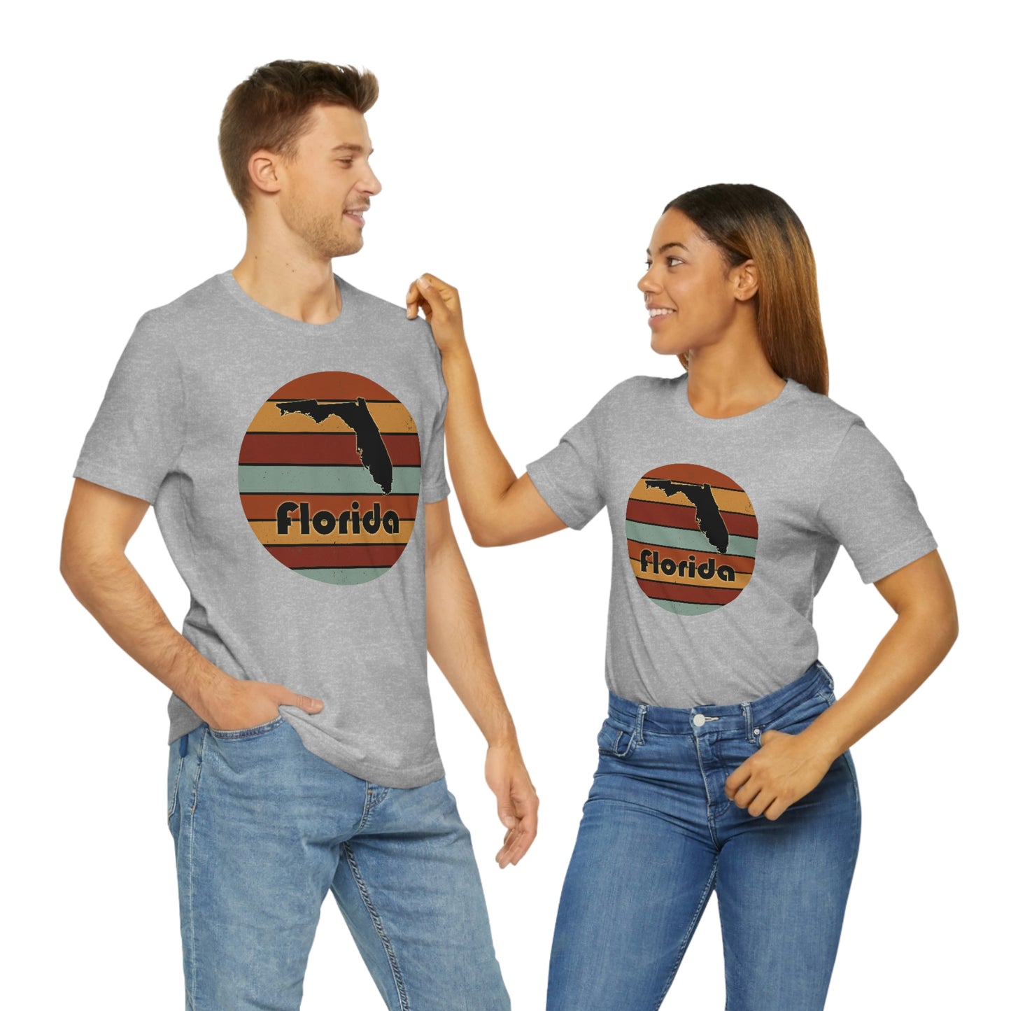 Show off your love and pride in Florida with this classic unisex short sleeve t-shirt showing a round retro sunset with a silhouette of Florida on it. This tee fits like a well-loved favorite. Soft cotton and quality print make you fall in love with it over and over again. These t-shirts have ribbed knit collars to bolster shaping. The shoulders have taping for better fit over time. Dual side seams hold the garment's shape for longer.