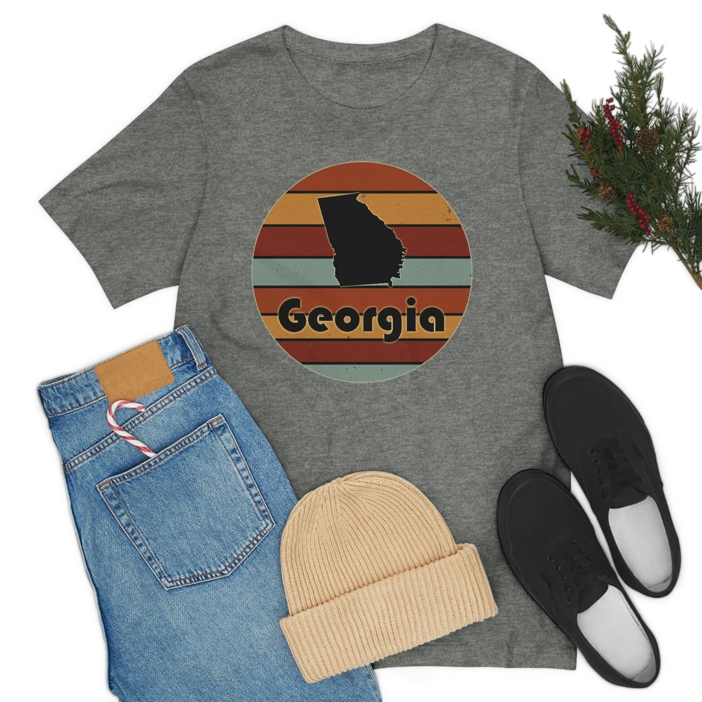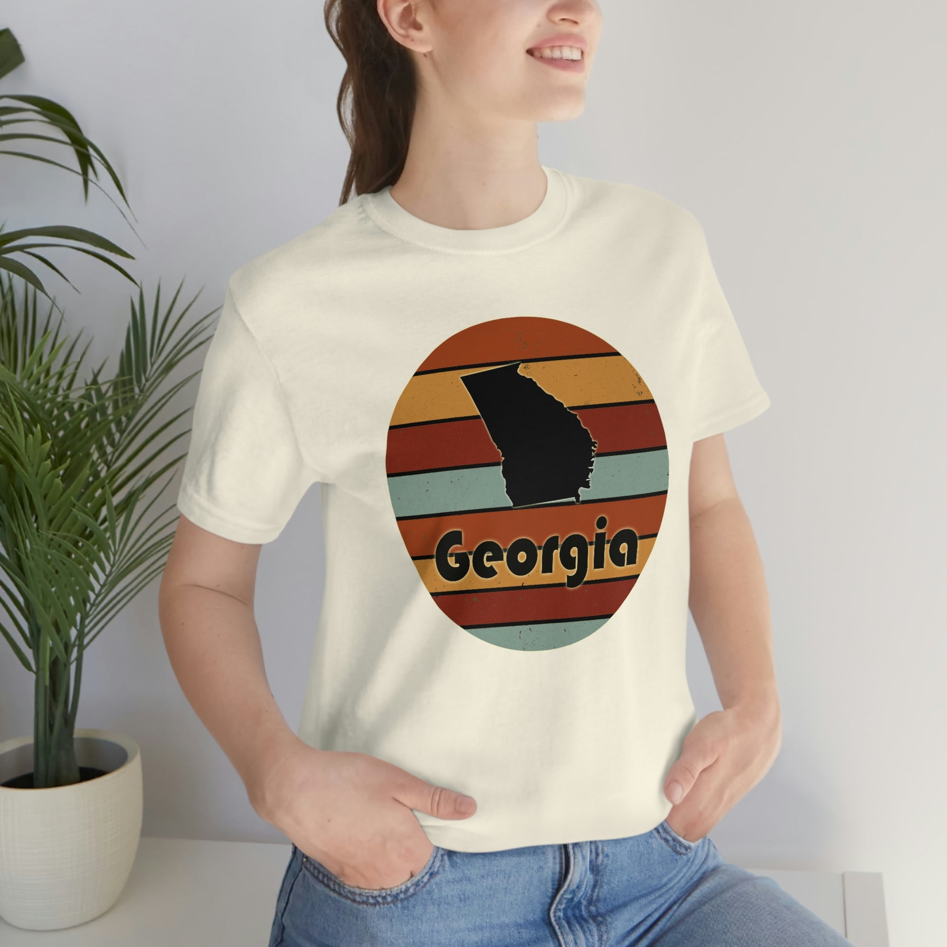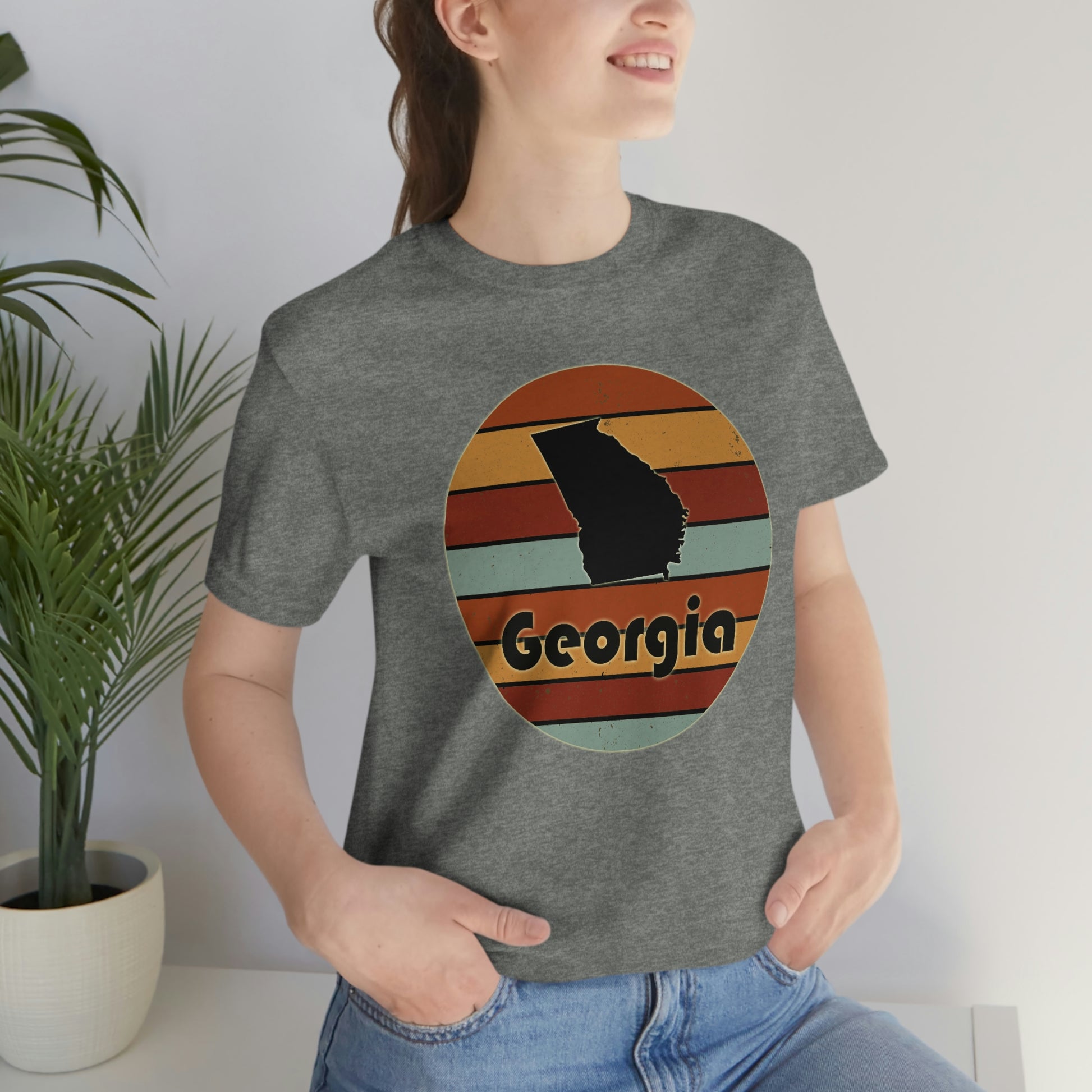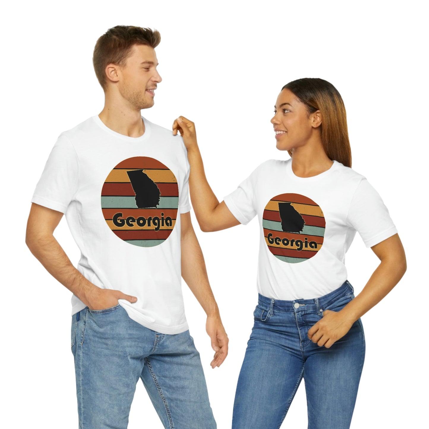 Show off your love and pride in Georgia with this classic unisex short sleeve t-shirt showing shape of Georgia over a retro sunset background with the name of the state written underneath it. This tee fits like a well-loved favorite. Soft cotton and quality print make you fall in love with it over and over again. These t-shirts have ribbed knit collars to bolster shaping. The shoulders have taping for better fit over time. Dual side seams hold the garment's shape for longer.
