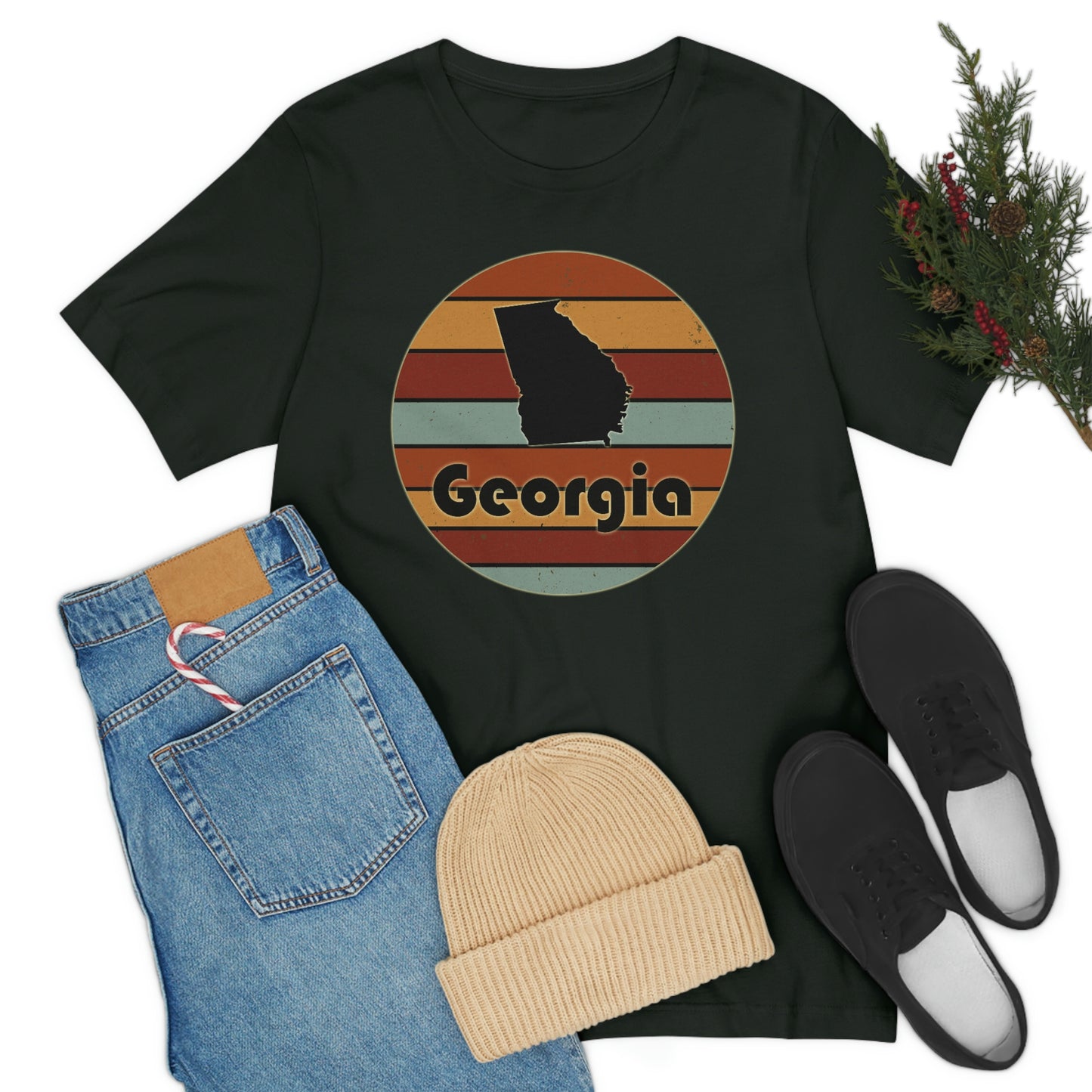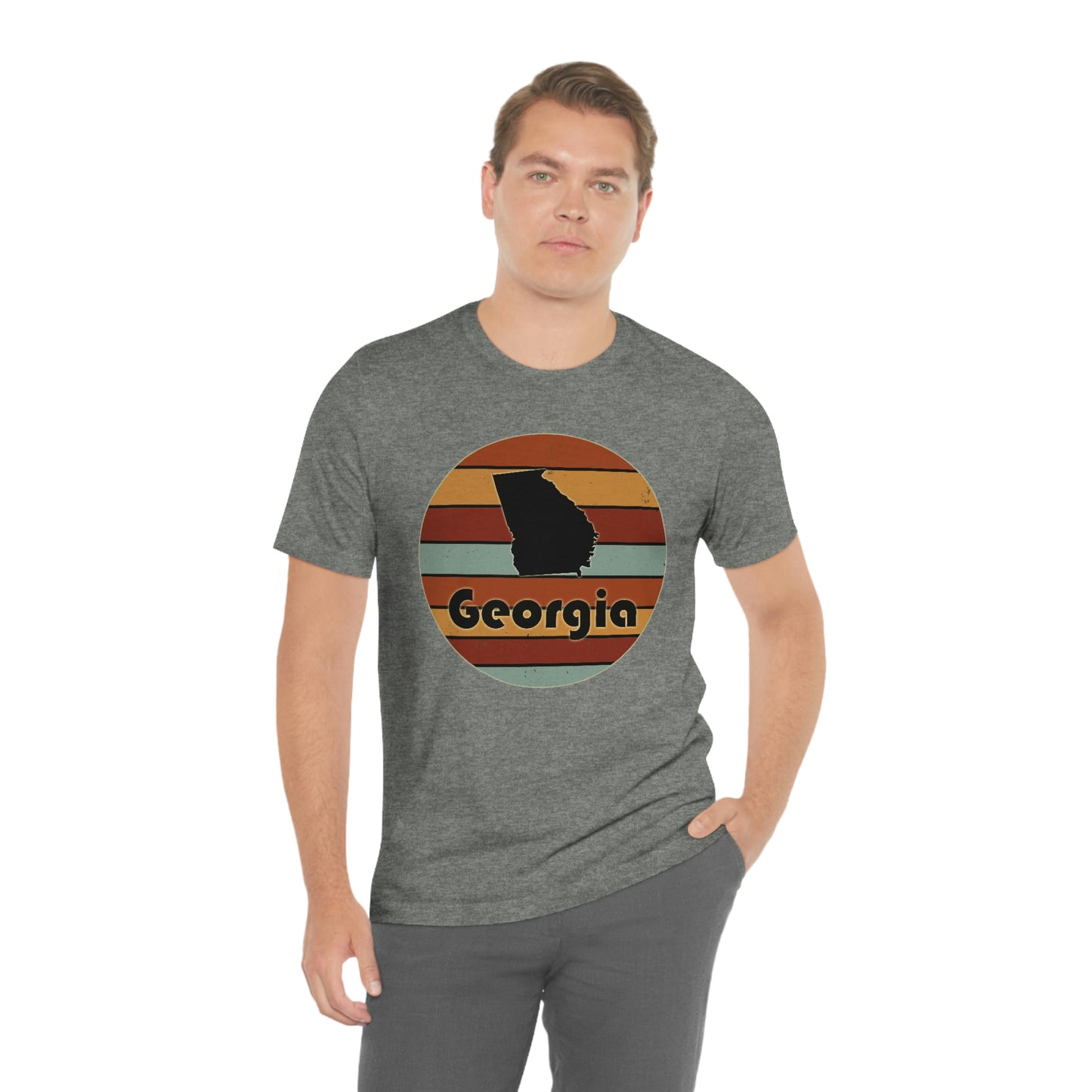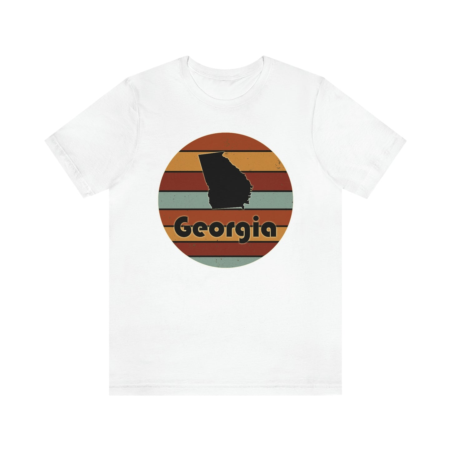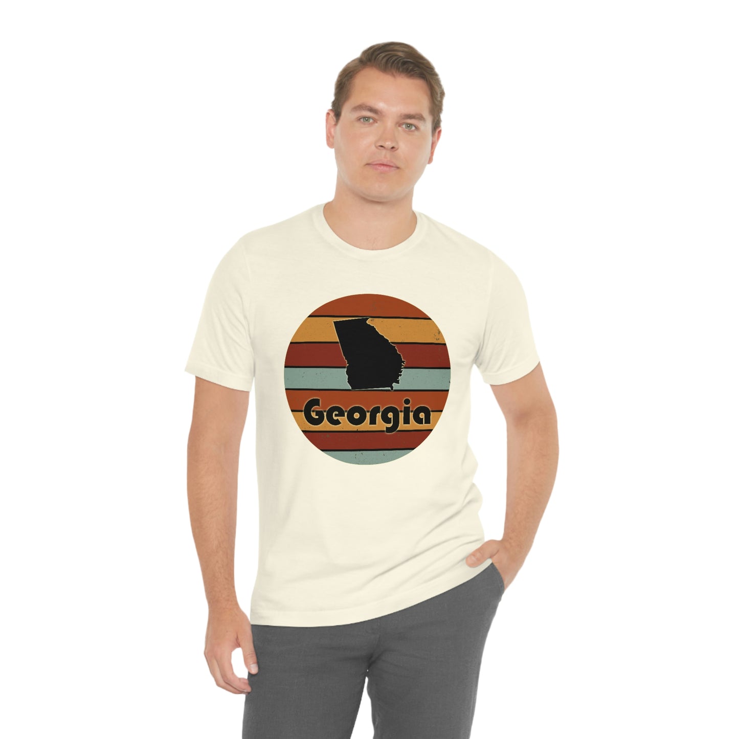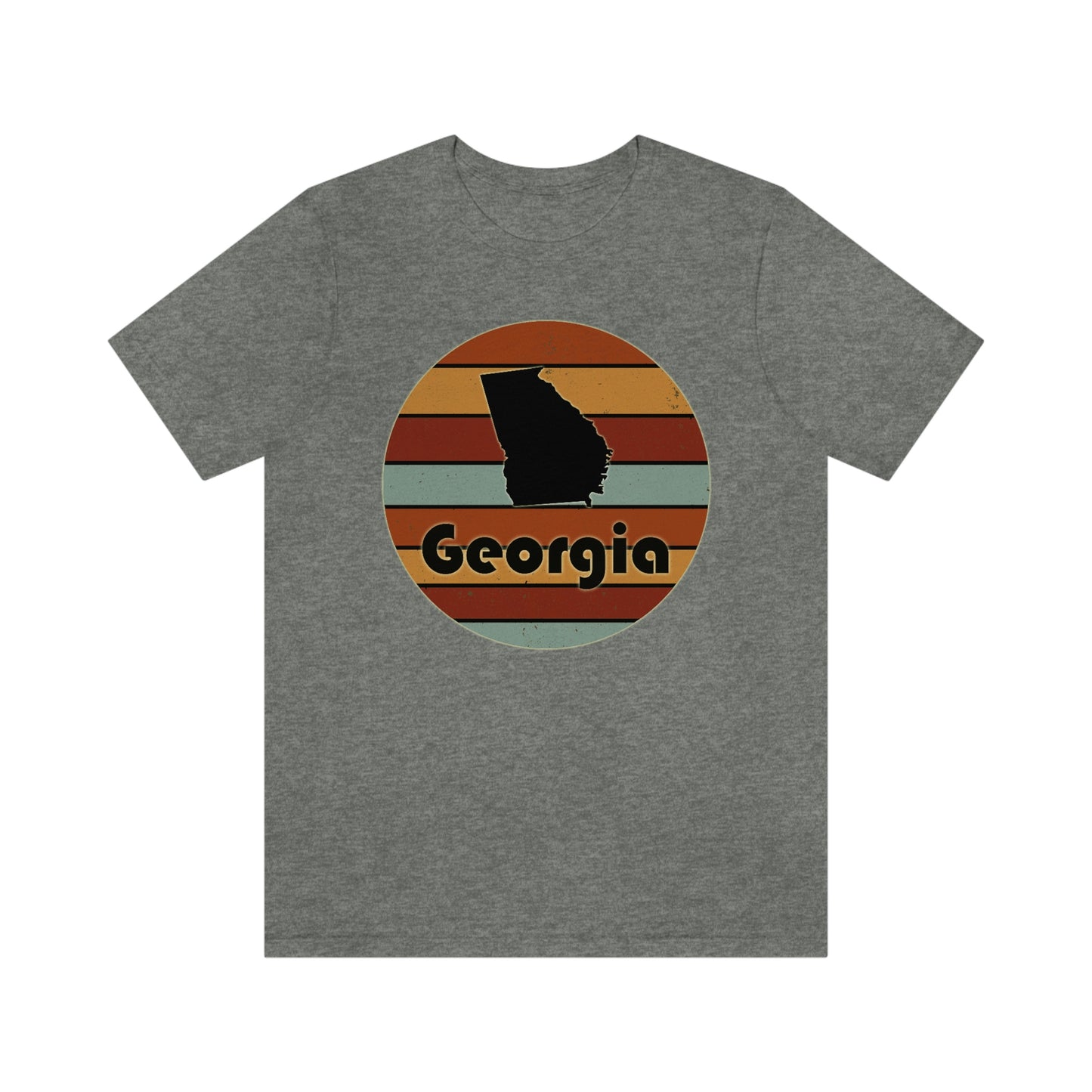 Show off your love and pride in Georgia with this classic unisex short sleeve t-shirt showing shape of Georgia over a retro sunset background with the name of the state written underneath it. This tee fits like a well-loved favorite. Soft cotton and quality print make you fall in love with it over and over again. These t-shirts have ribbed knit collars to bolster shaping. The shoulders have taping for better fit over time. Dual side seams hold the garment's shape for longer.
