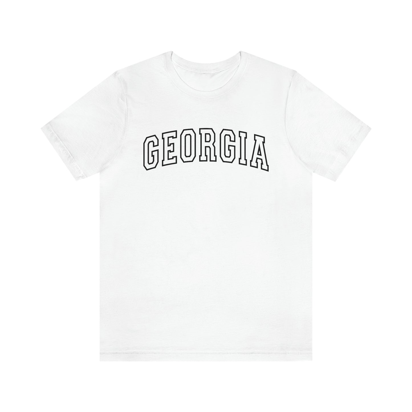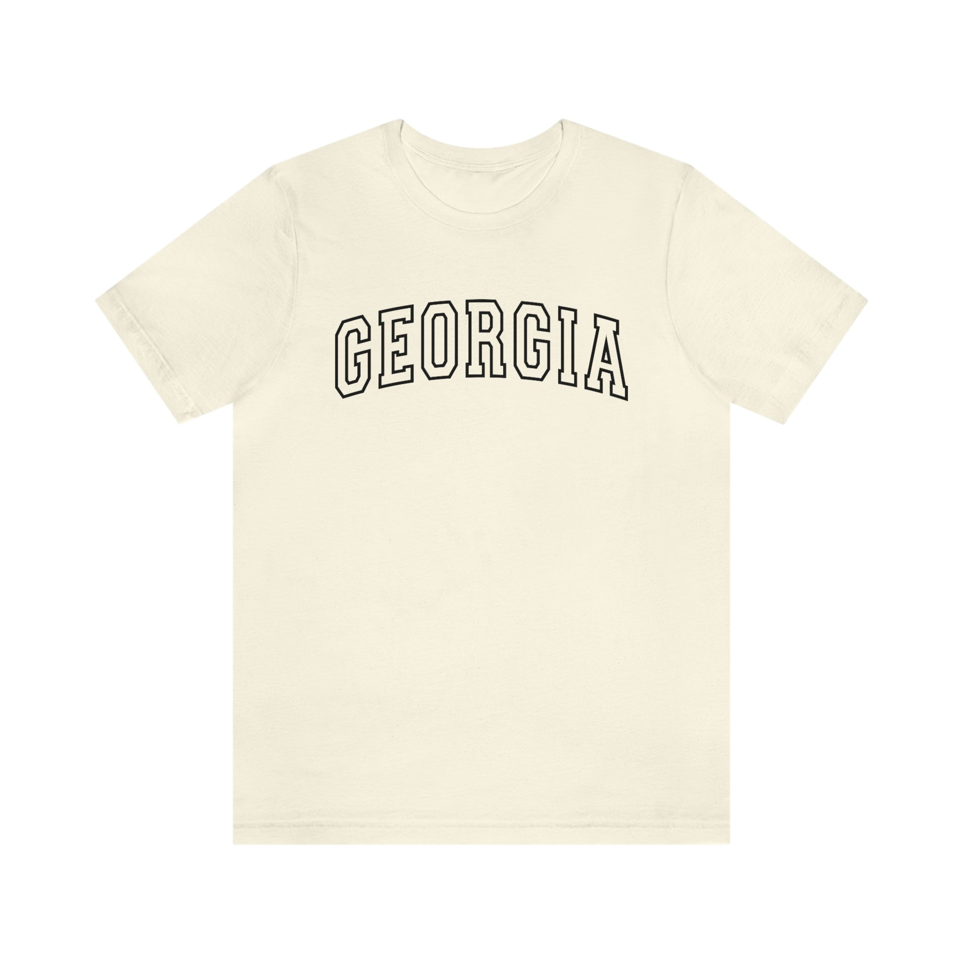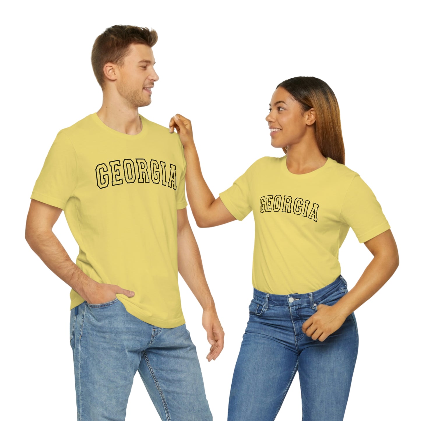 Show off your love and pride in Georgia with this classic unisex short sleeve t-shirt showing Georgia written in varsity letters in an arch design. This tee fits like a well-loved favorite. Soft cotton and quality print make you fall in love with it over and over again. These t-shirts have ribbed knit collars to bolster shaping. The shoulders have taping for better fit over time. Dual side seams hold the garment's shape for longer.