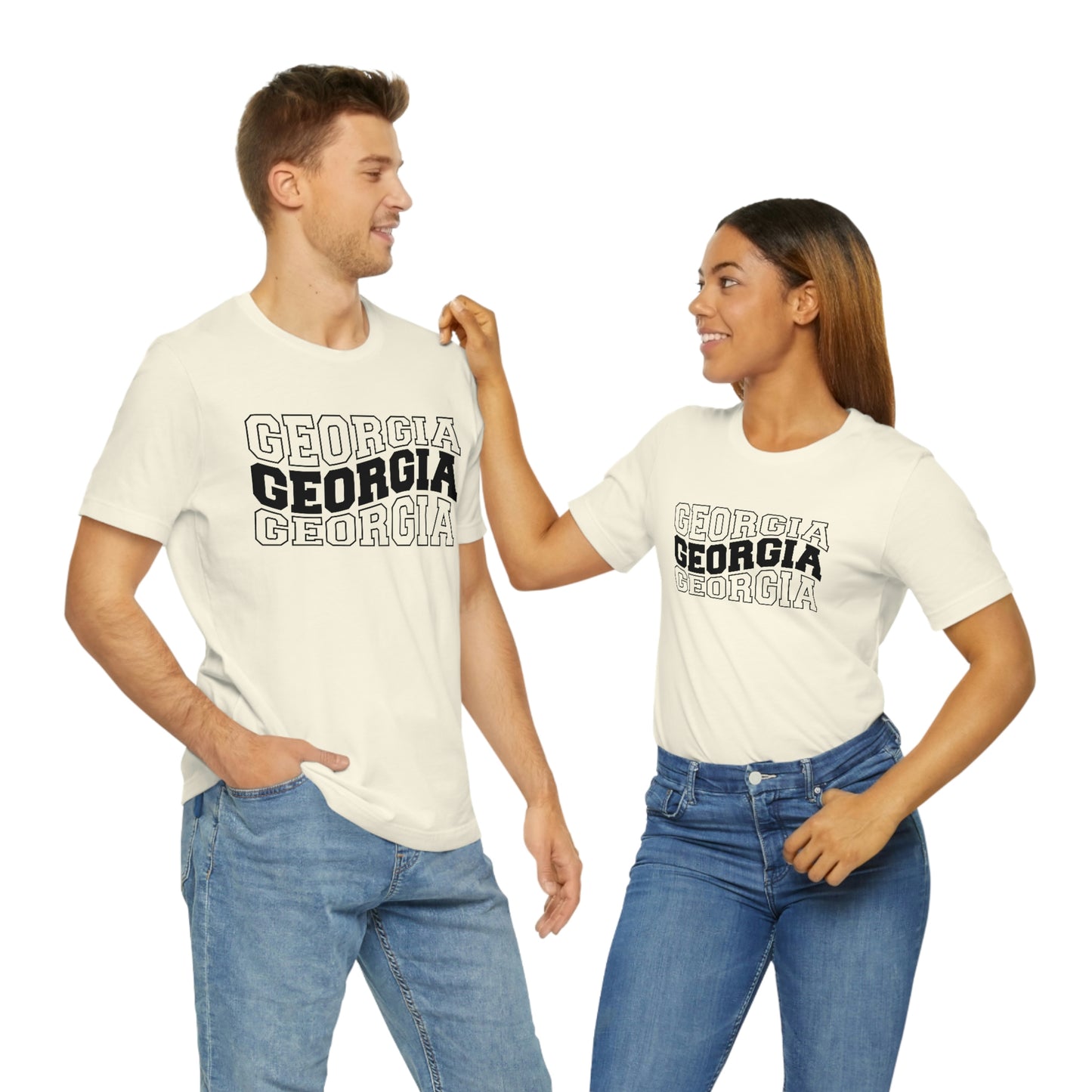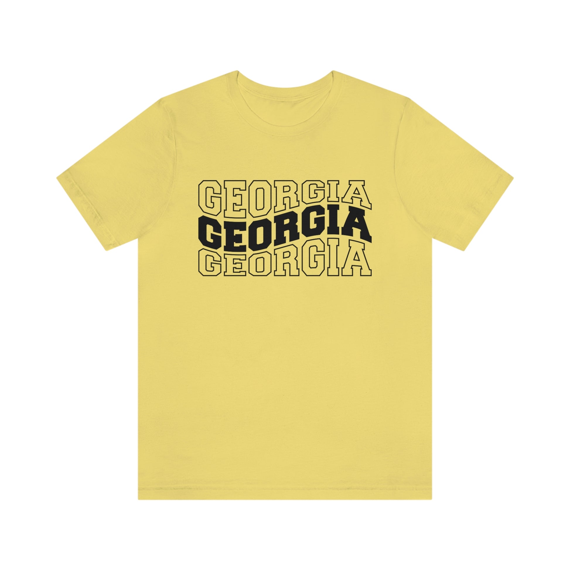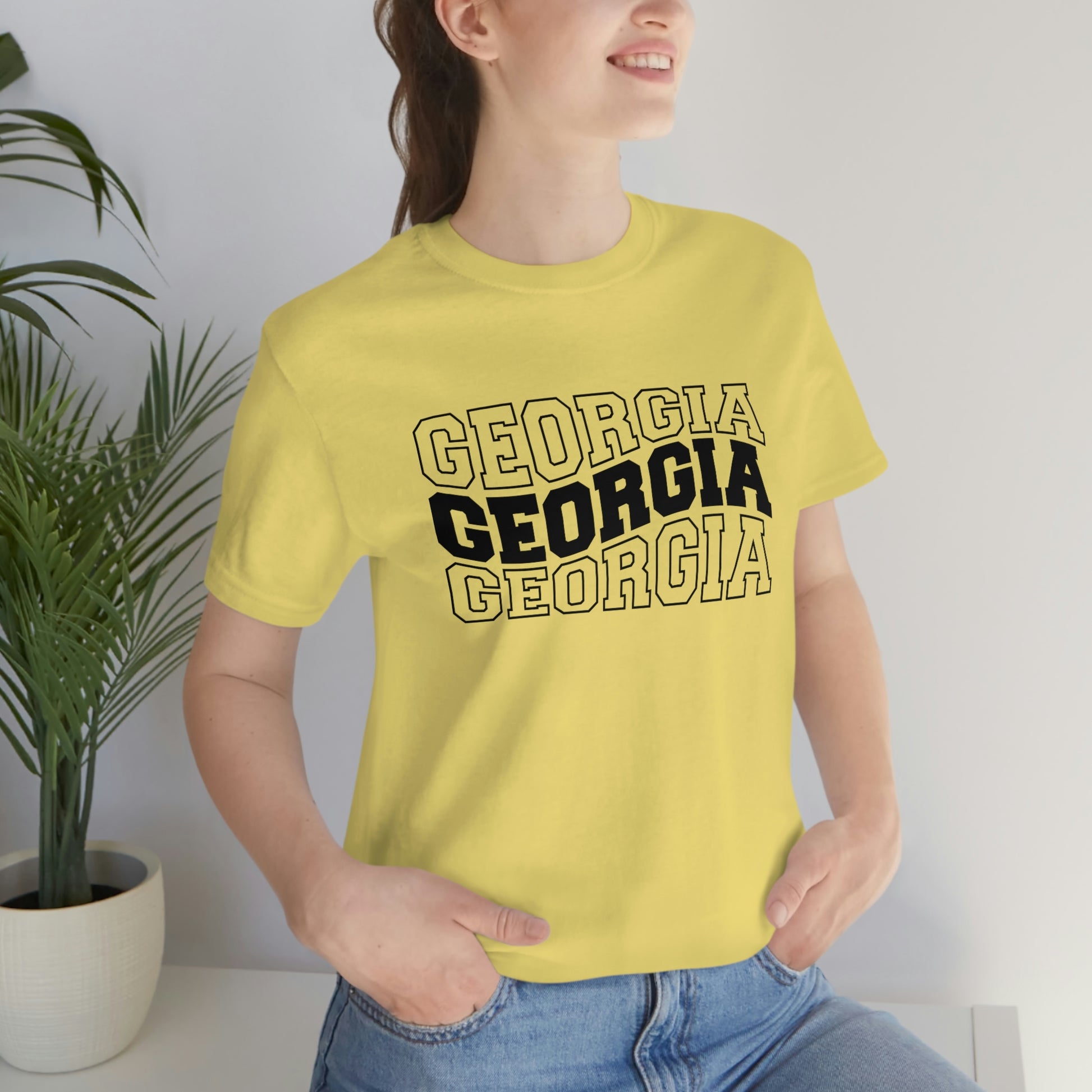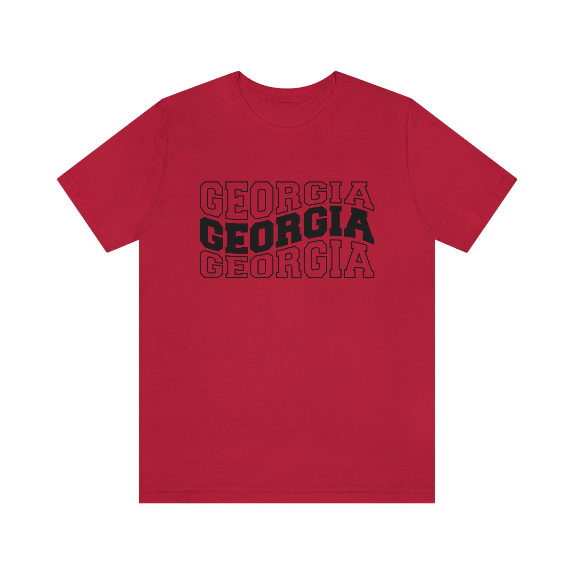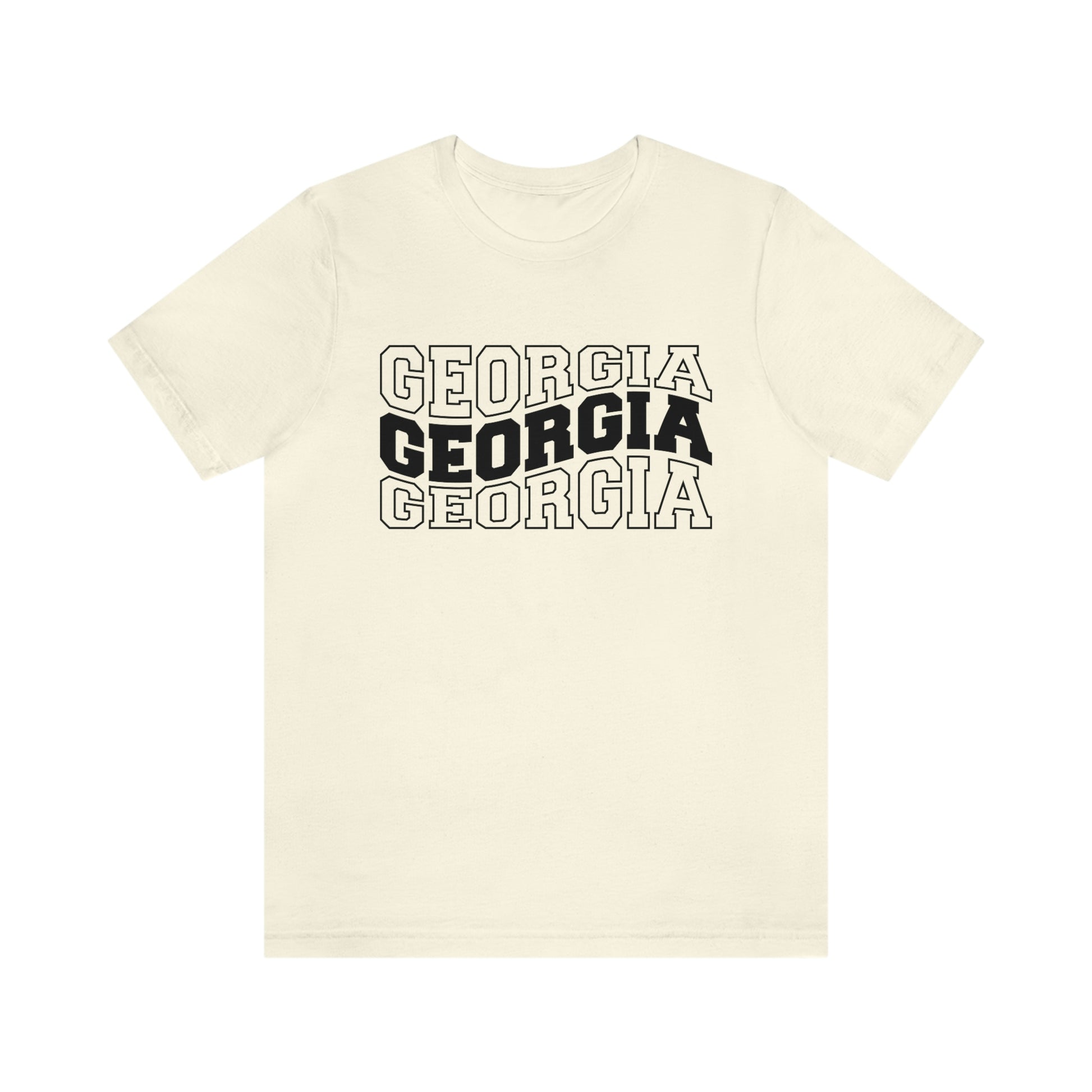 Show off your love and pride in Georgia with this classic unisex short sleeve t-shirt showing Georgia written in varsity letters in wavy design. This tee fits like a well-loved favorite. Soft cotton and quality print make you fall in love with it over and over again. These t-shirts have ribbed knit collars to bolster shaping. The shoulders have taping for better fit over time. Dual side seams hold the garment's shape for longer.