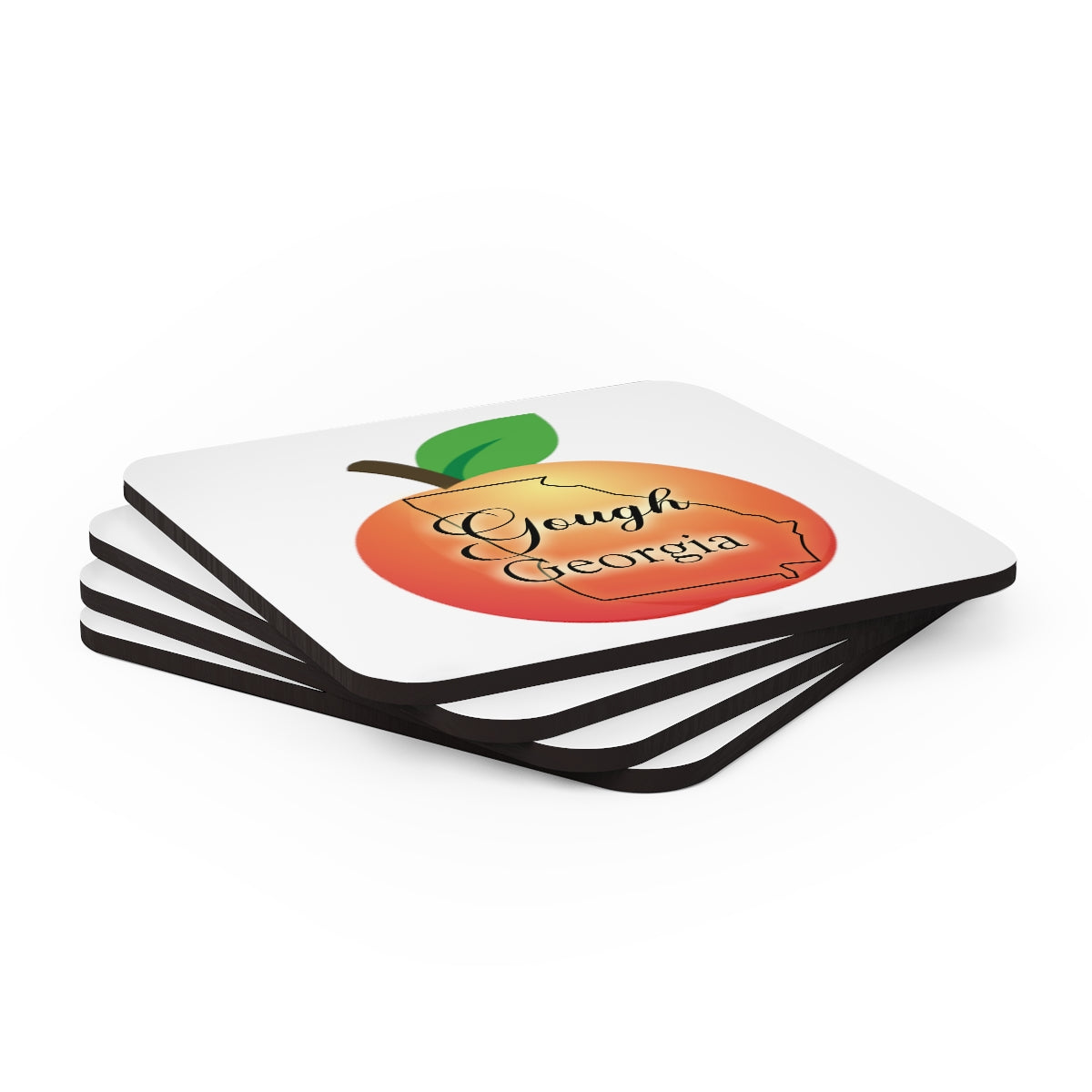 This coaster set comes with 4 coasters in one size. They are made with a high-gloss top and feature a cork back to prevent sliding.