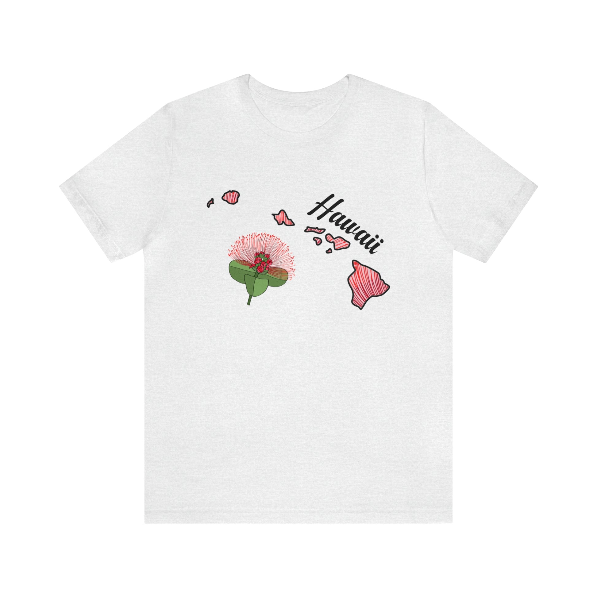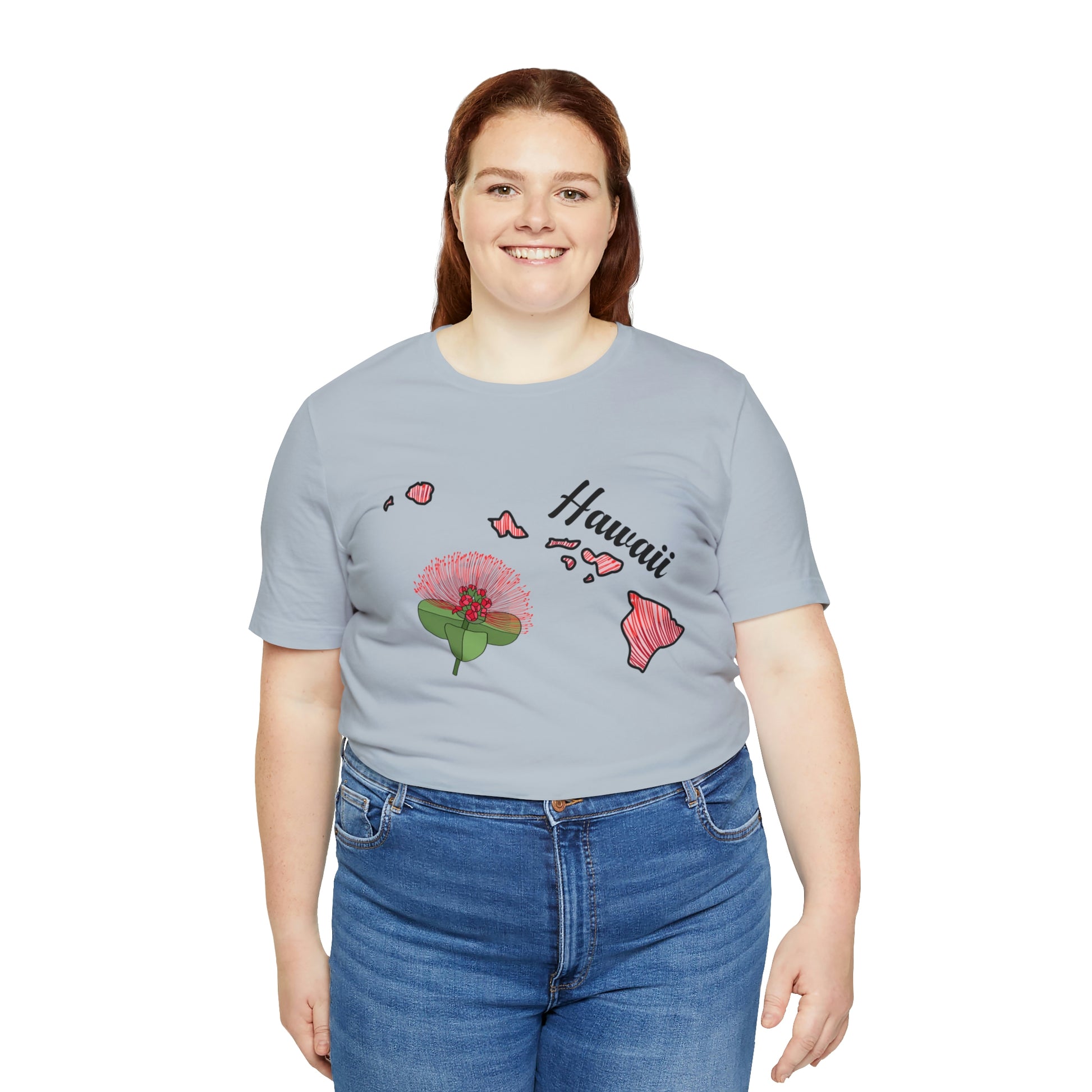 Show off your love and pride in Hawaii with this classic unisex short sleeve t-shirt showing Hawaii with a ohia lehua on it. This tee fits like a well-loved favorite. Soft cotton and quality print make you fall in love with it over and over again. These t-shirts have ribbed knit collars to bolster shaping. The shoulders have taping for better fit over time. Dual side seams hold the garment's shape for longer.