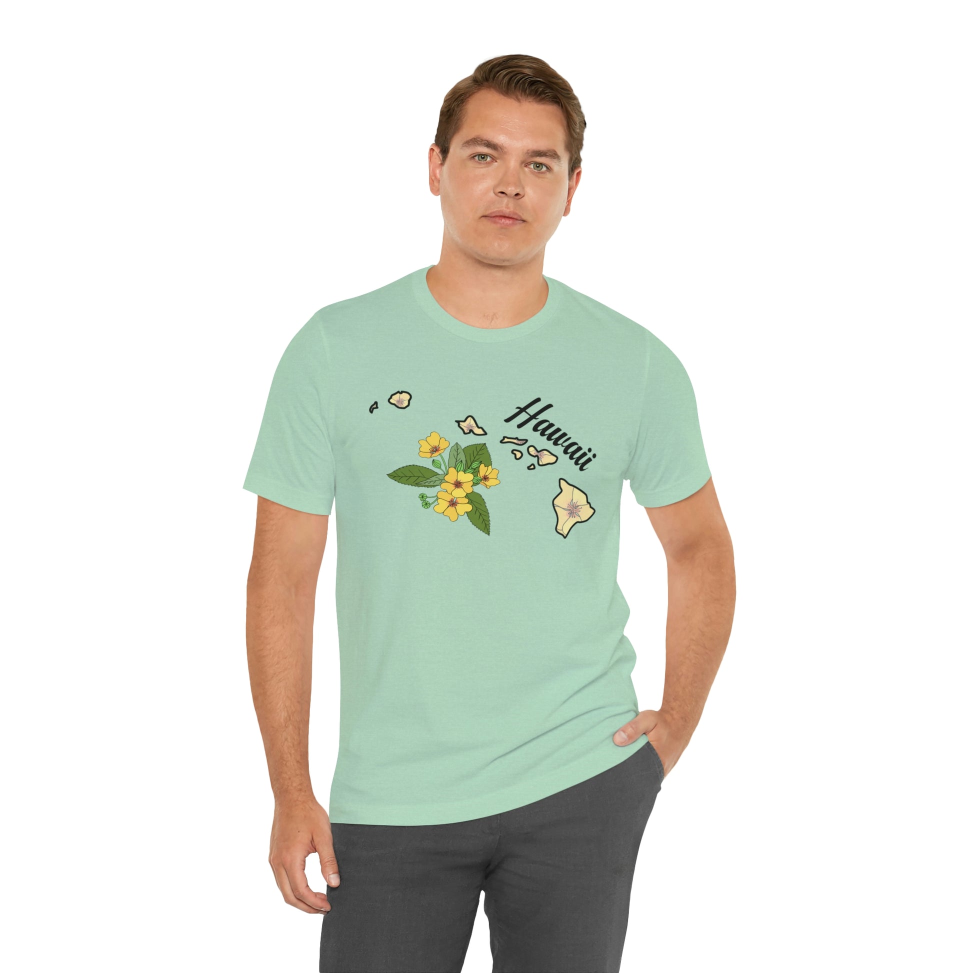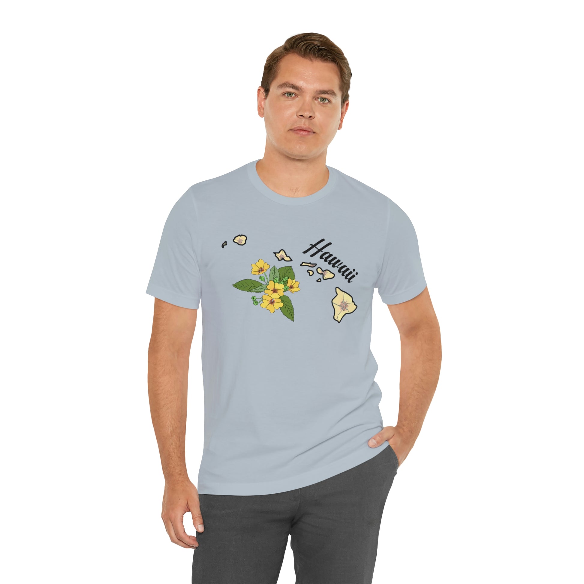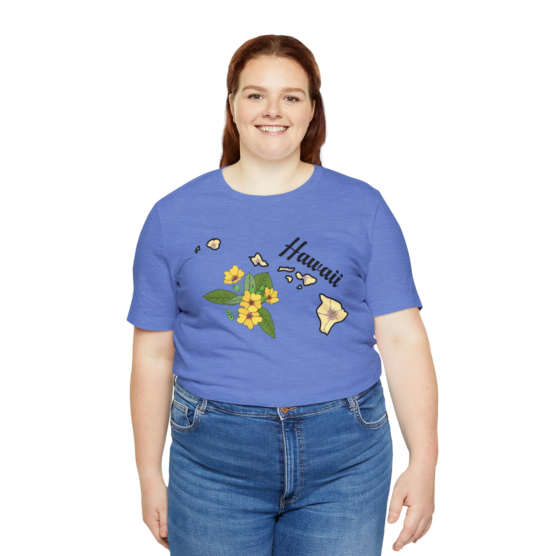 Show off your love and pride in Hawaii with this classic unisex short sleeve t-shirt showing Hawaii with a pua ilima lei flower on it. This tee fits like a well-loved favorite. Soft cotton and quality print make you fall in love with it over and over again. These t-shirts have ribbed knit collars to bolster shaping. The shoulders have taping for better fit over time. Dual side seams hold the garment's shape for longer.